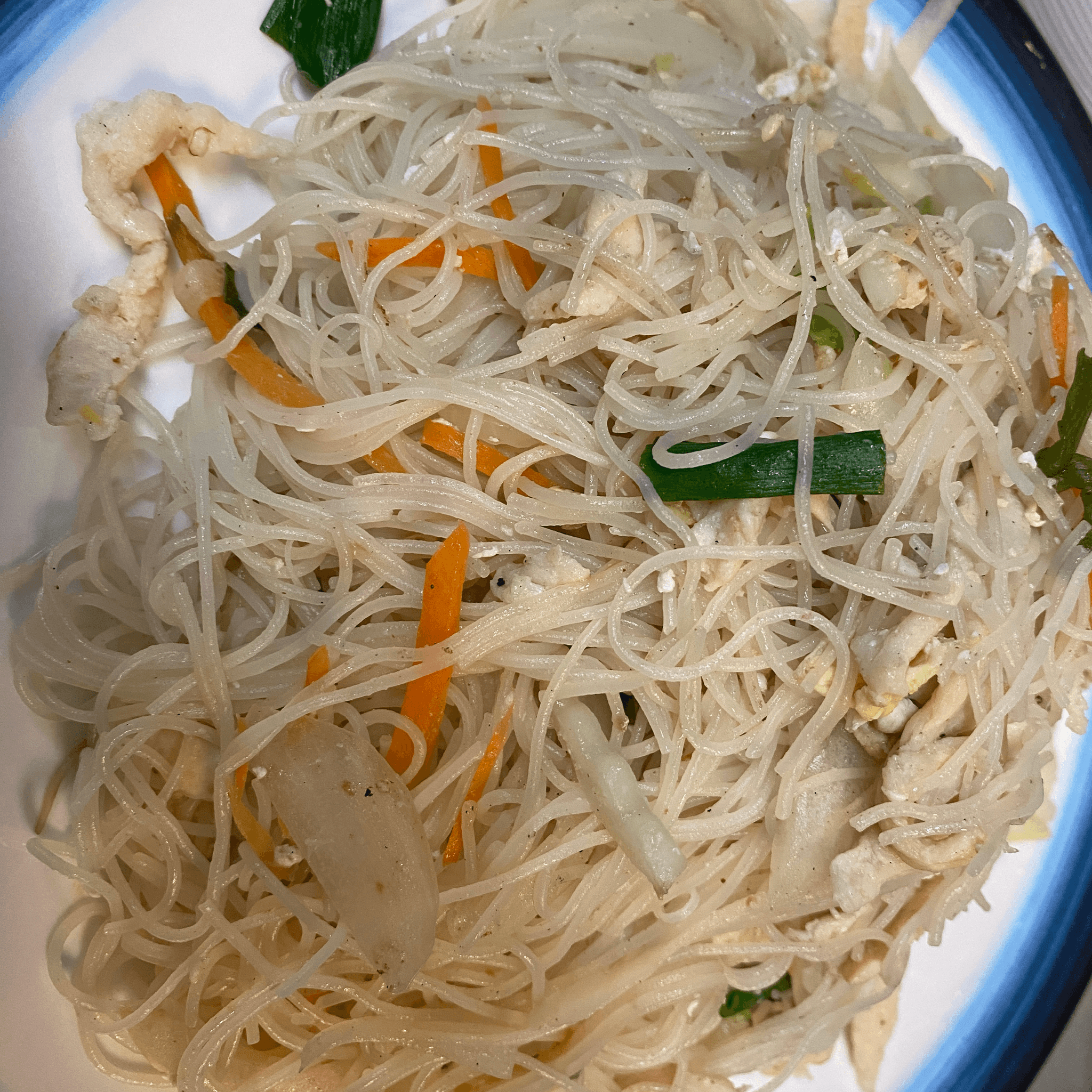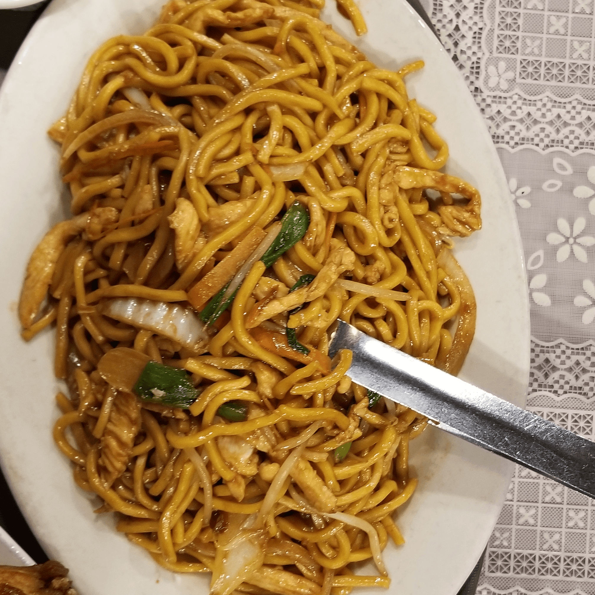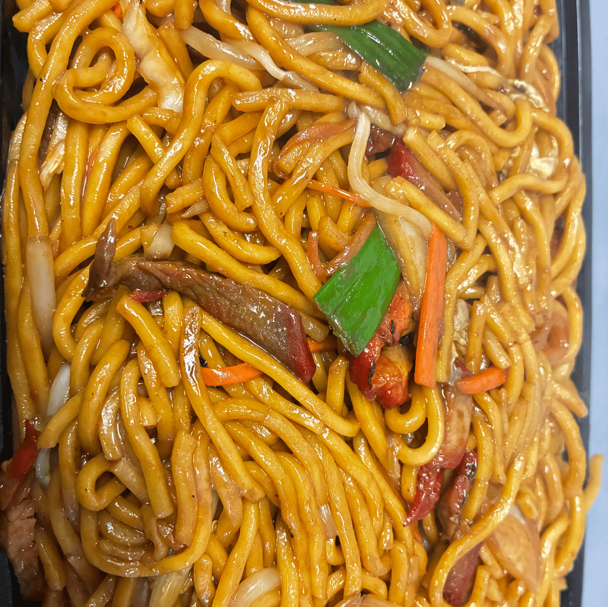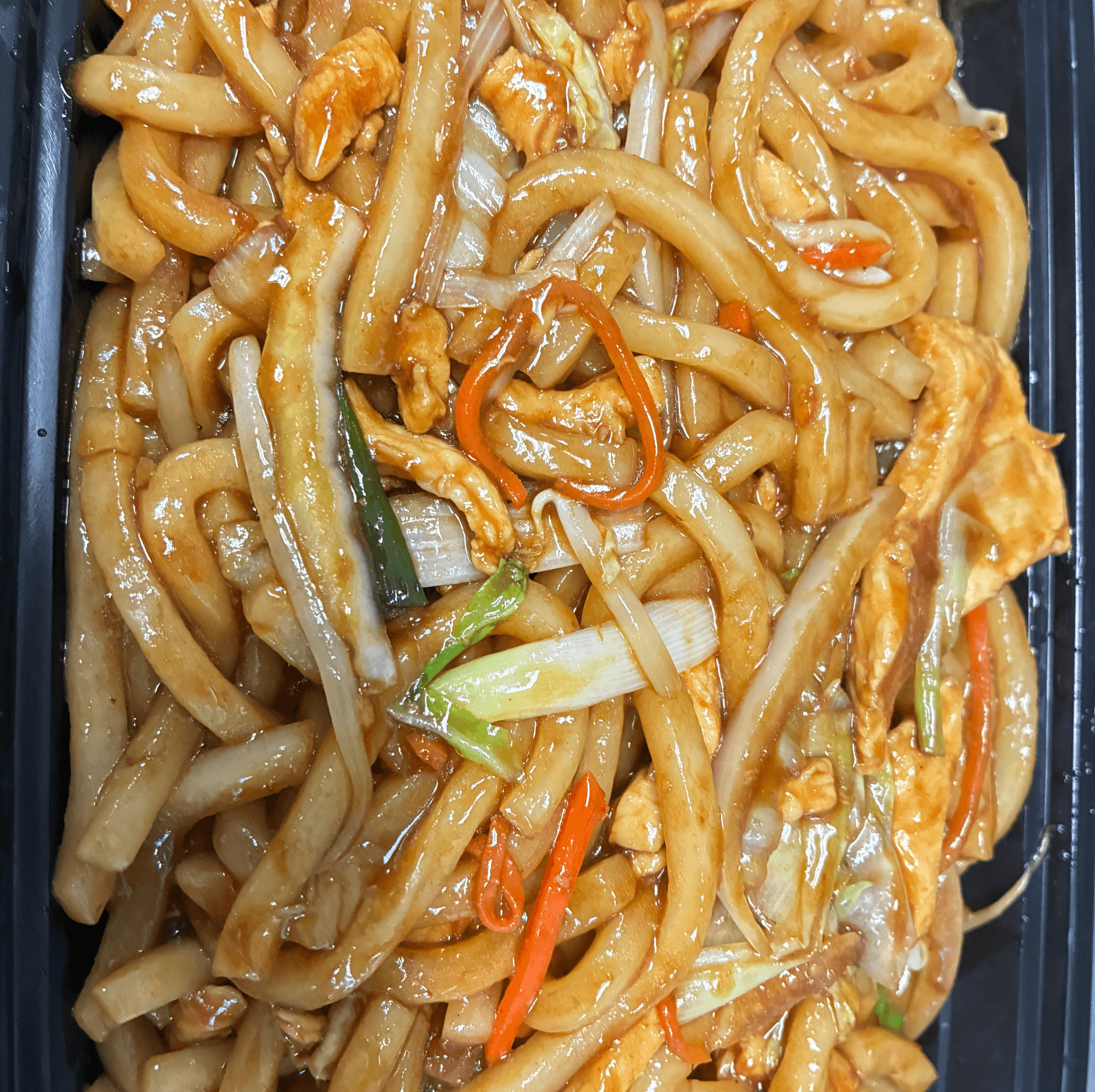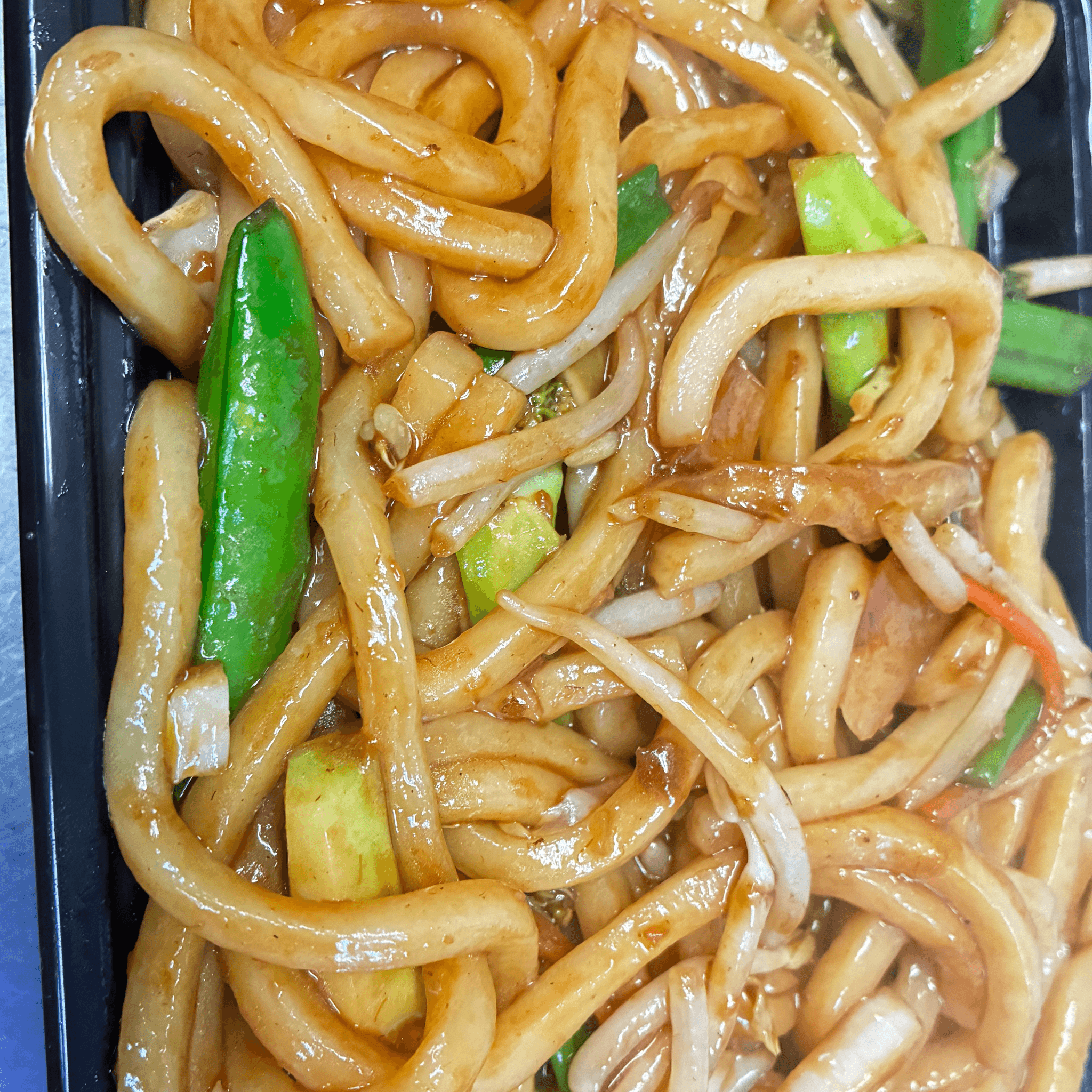 Soft egg noodles with chicken ,onions ,cabbage carrots , bean sprouts