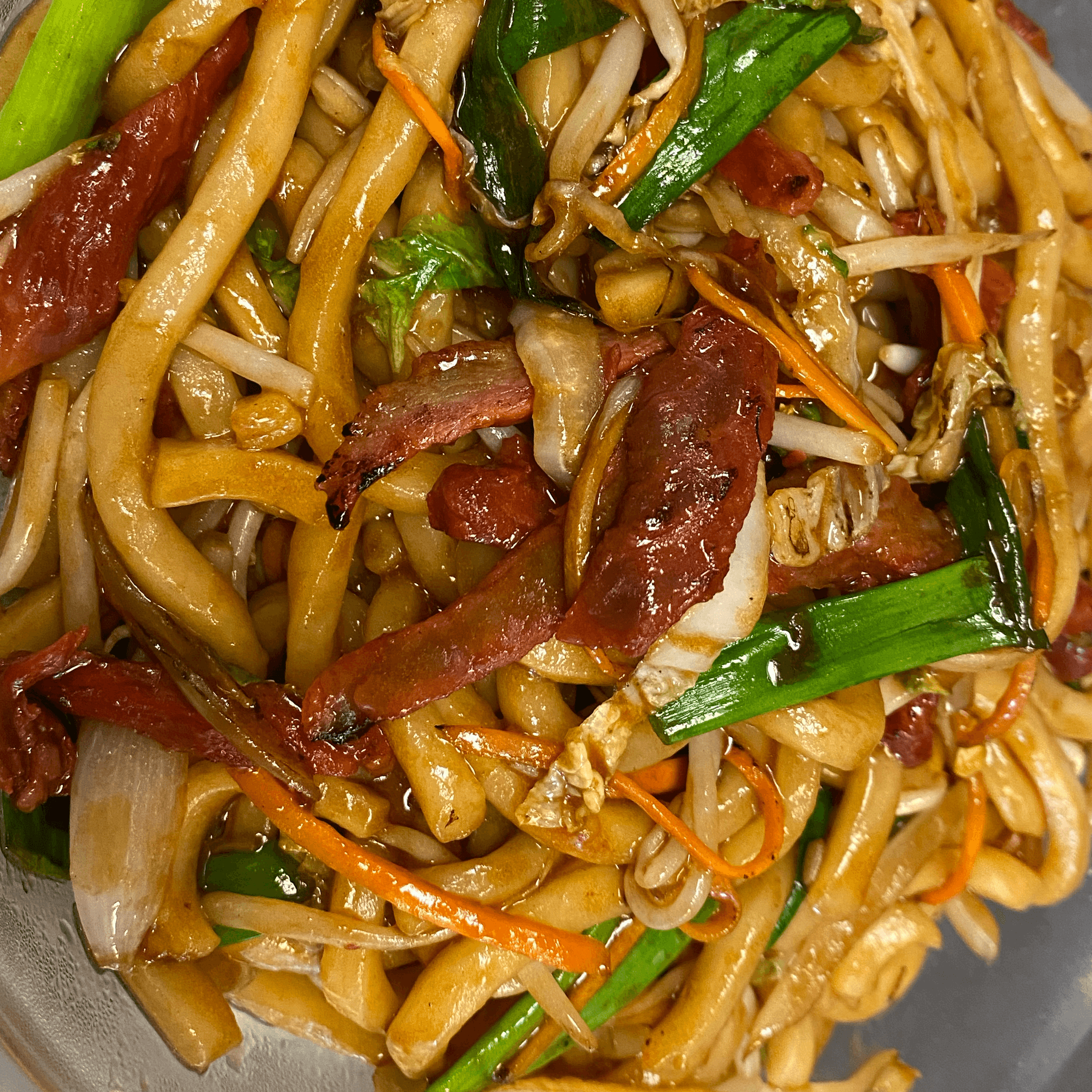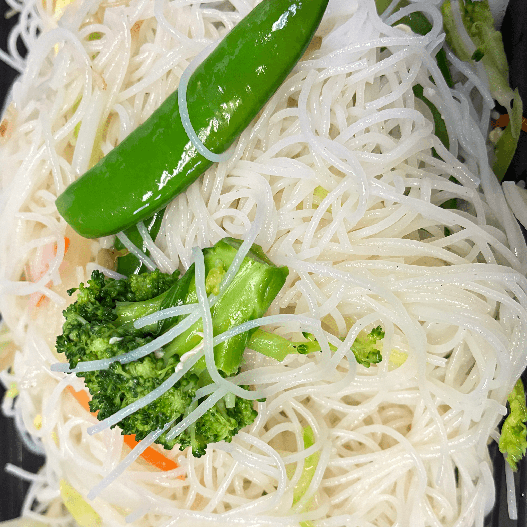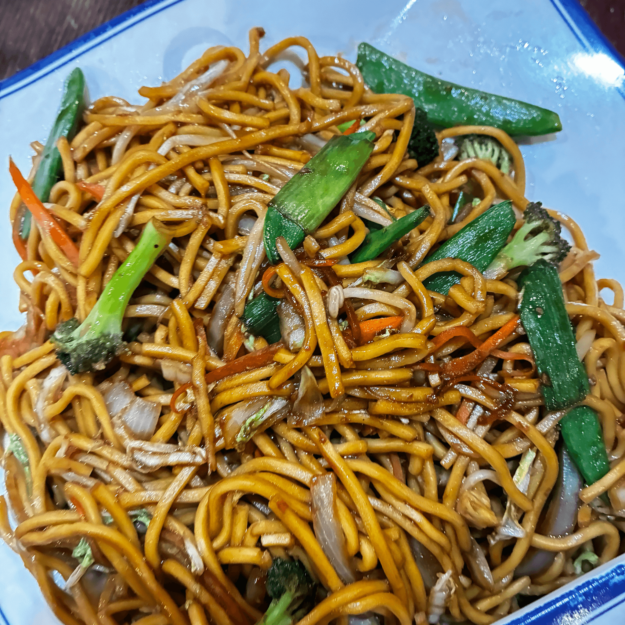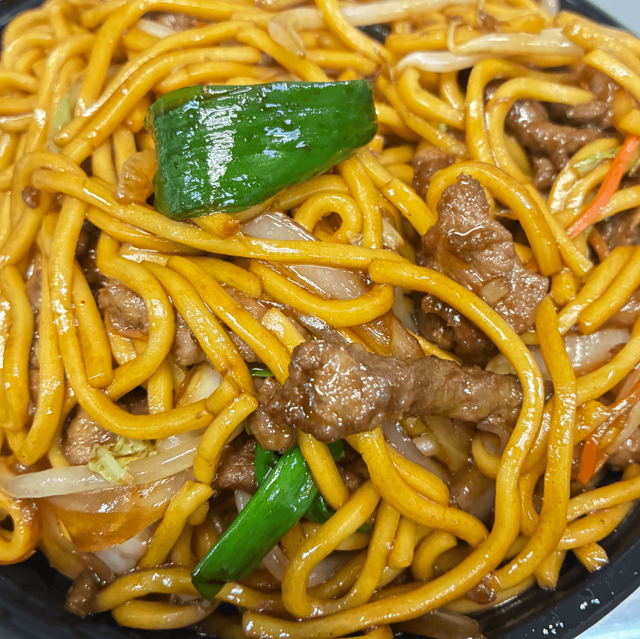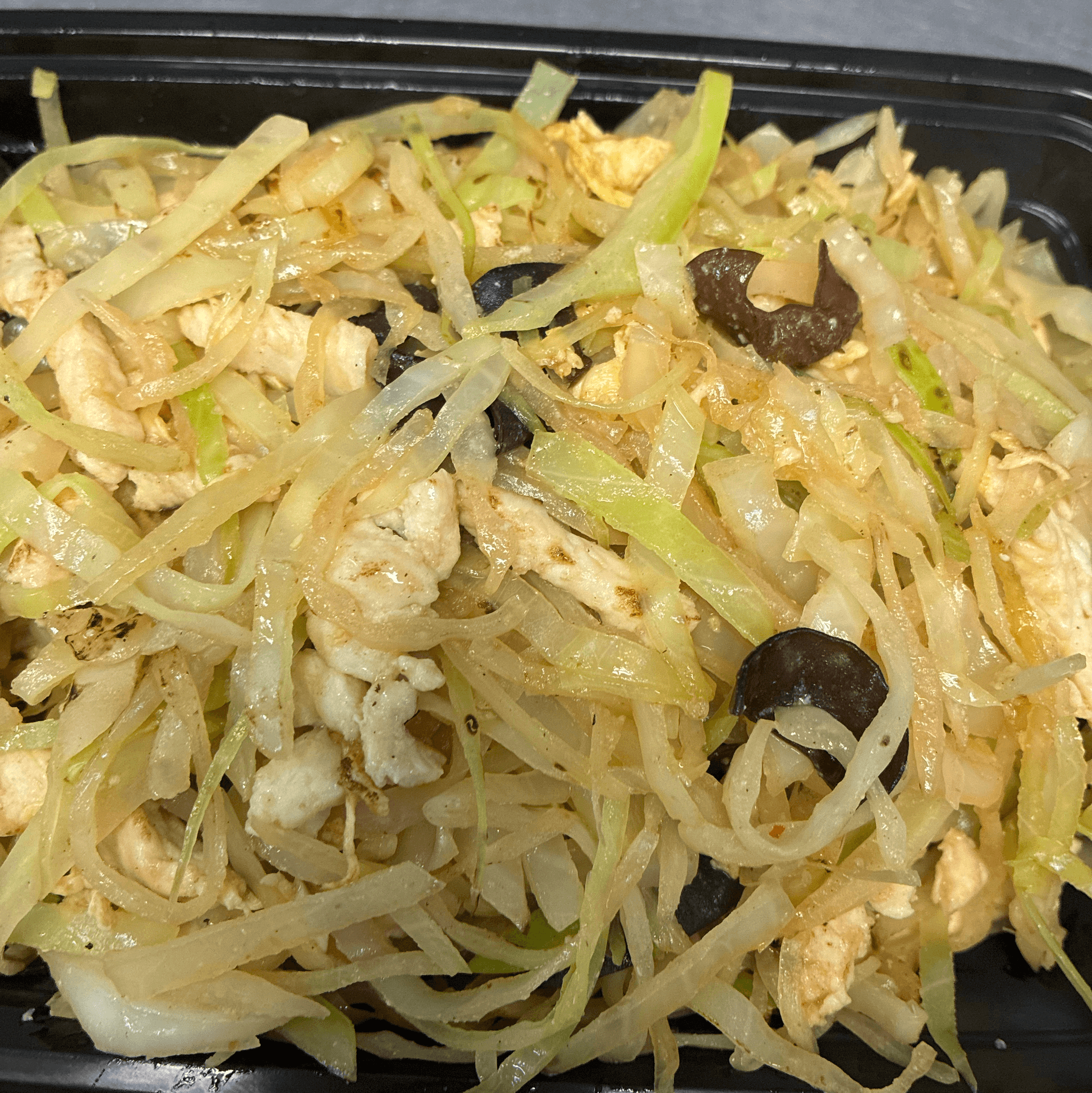 Soft egg noodles with chicken ,onions ,cabbage carrots , bean sprouts
