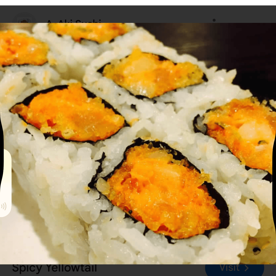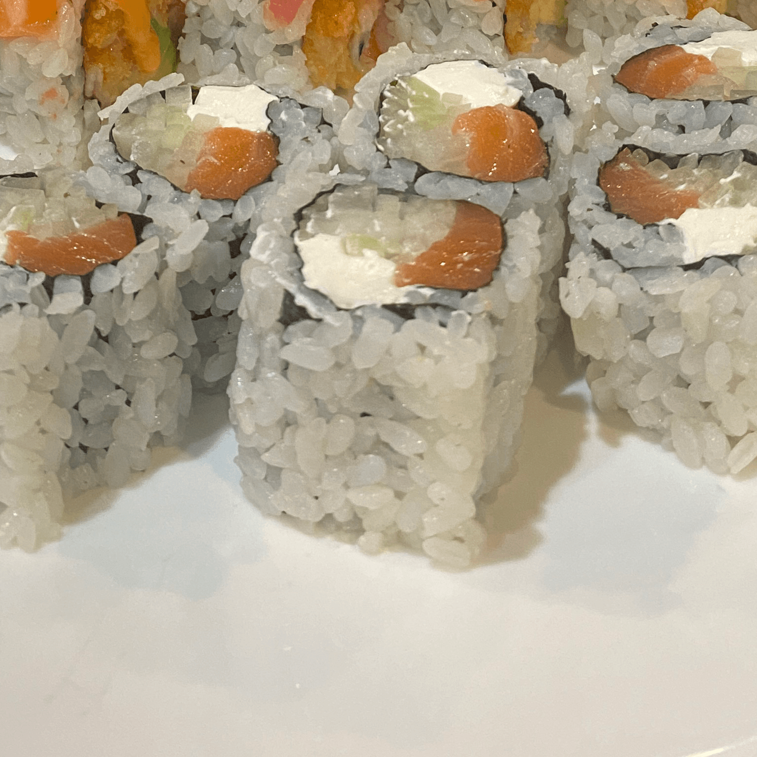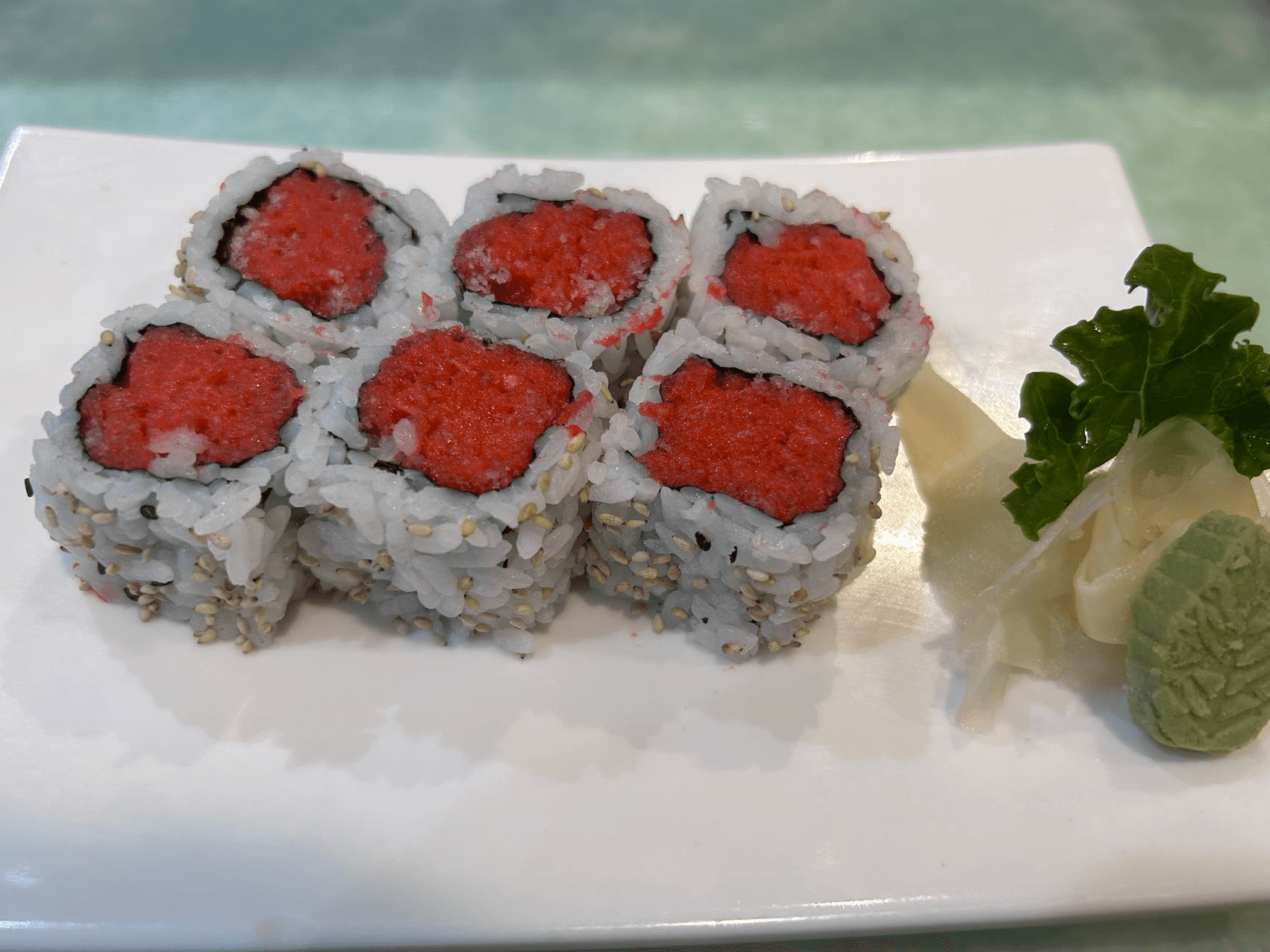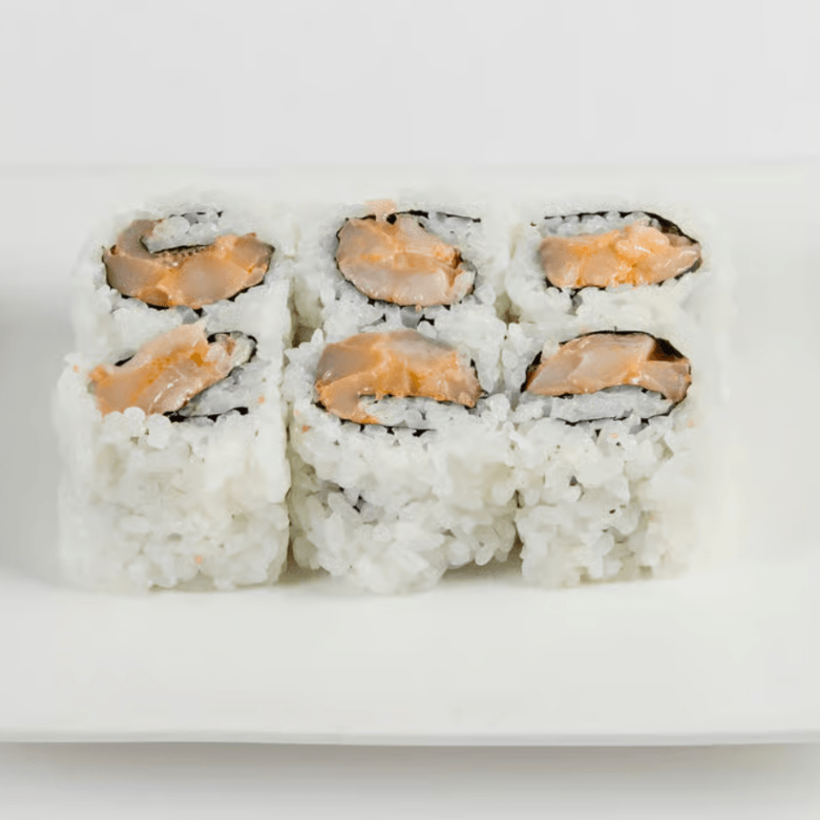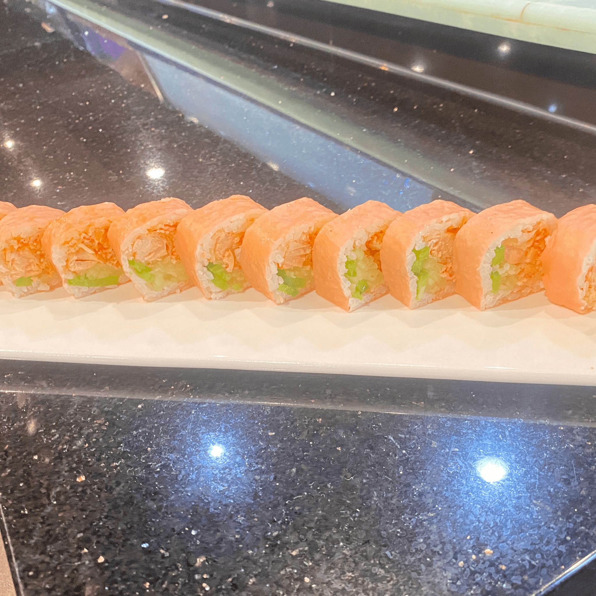 Spicy tuna and avocado inside, topped with spicy crunchy salmon. Spicy