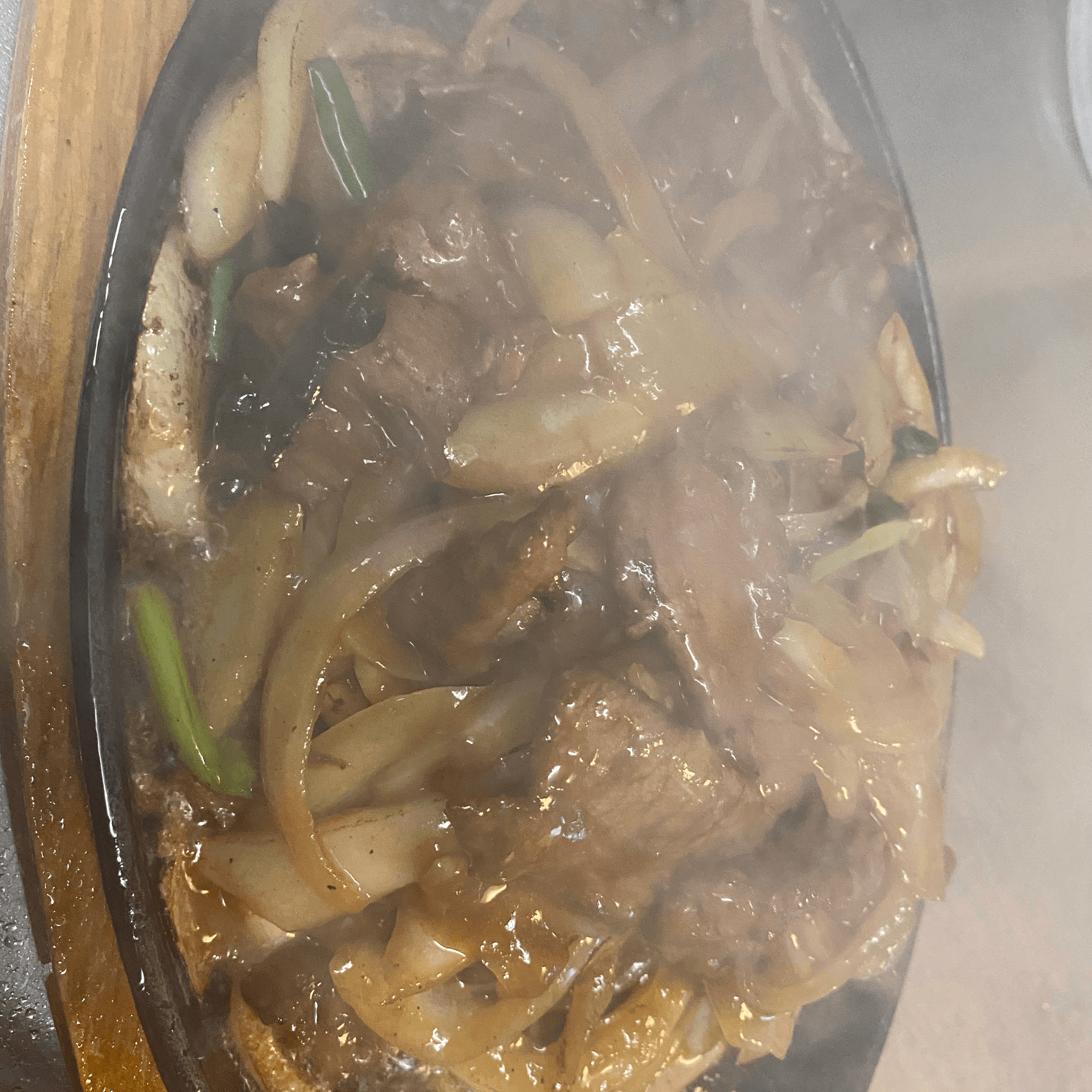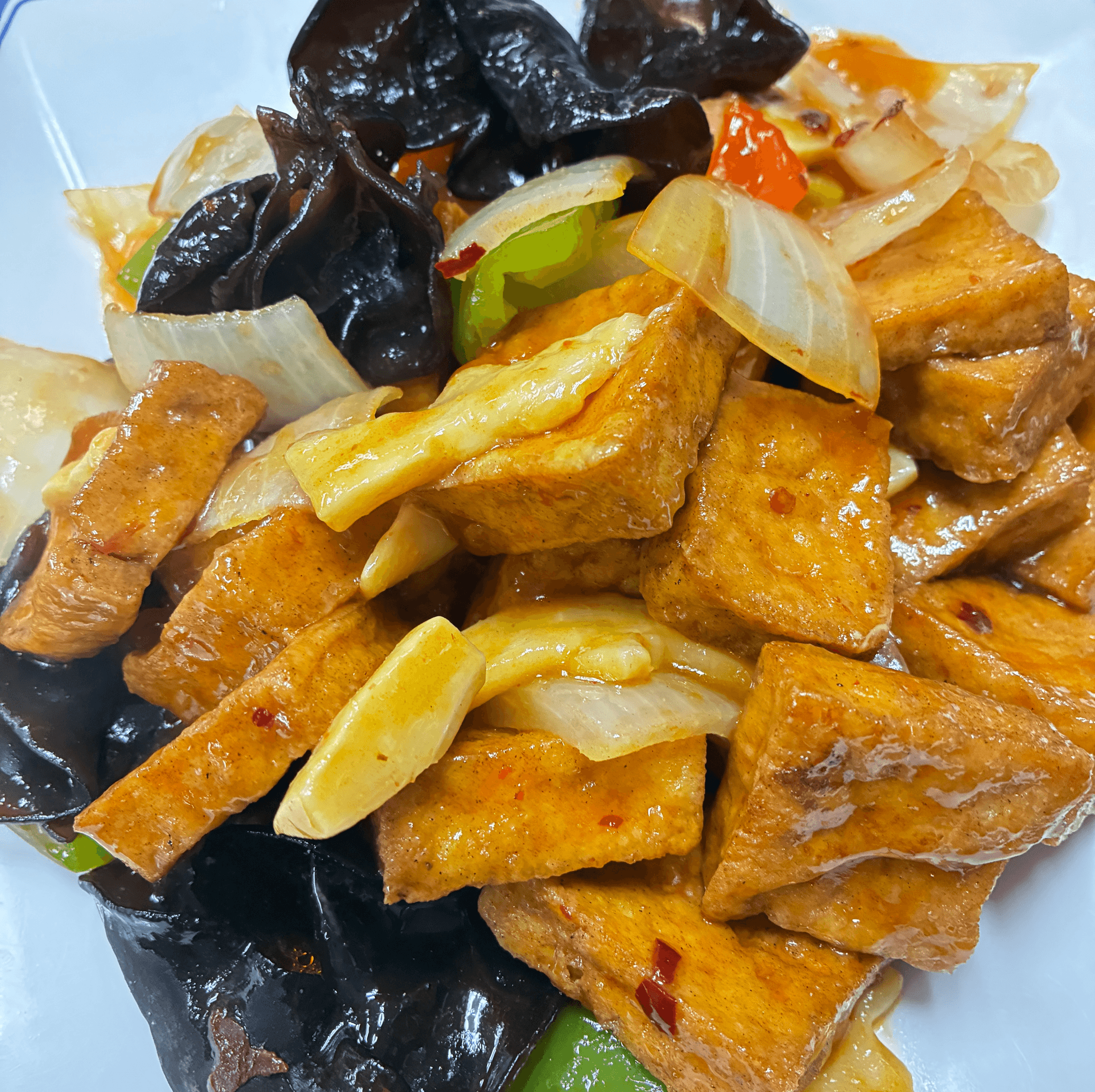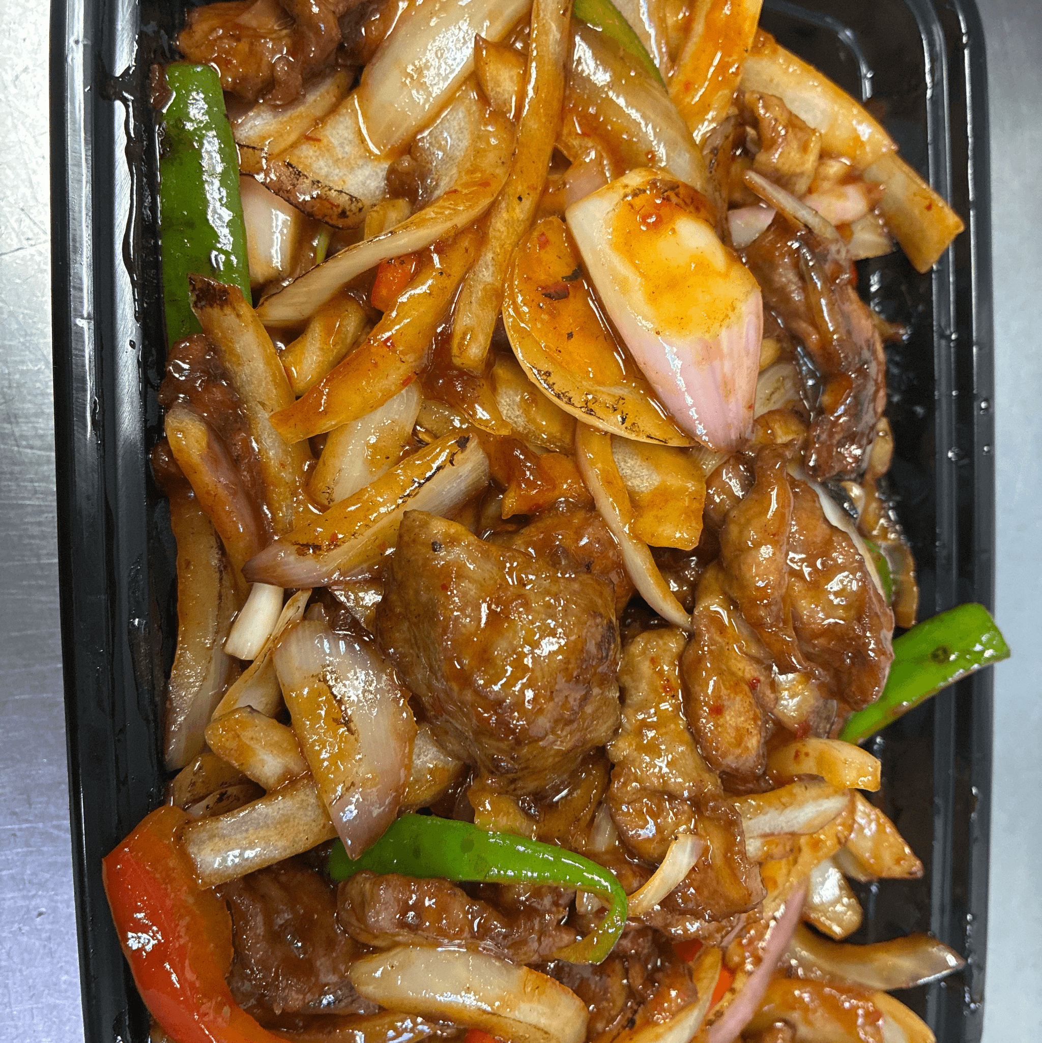 Stir fried beef with fried tofu , potatoes, onions in spicy curry sauce. Served with white rice. Spicy