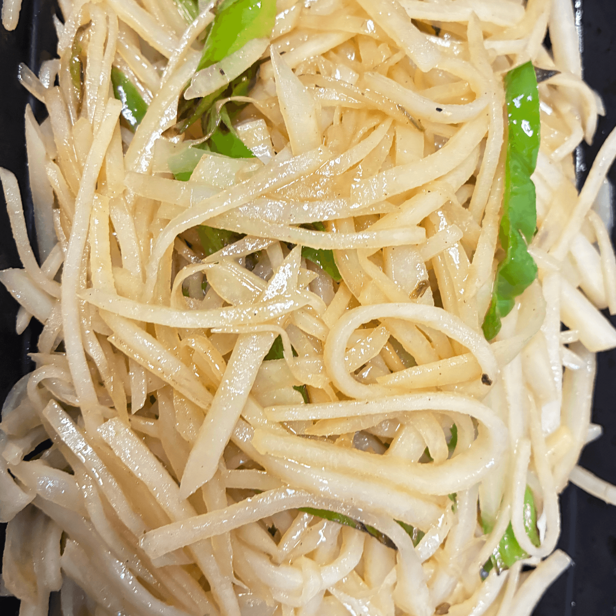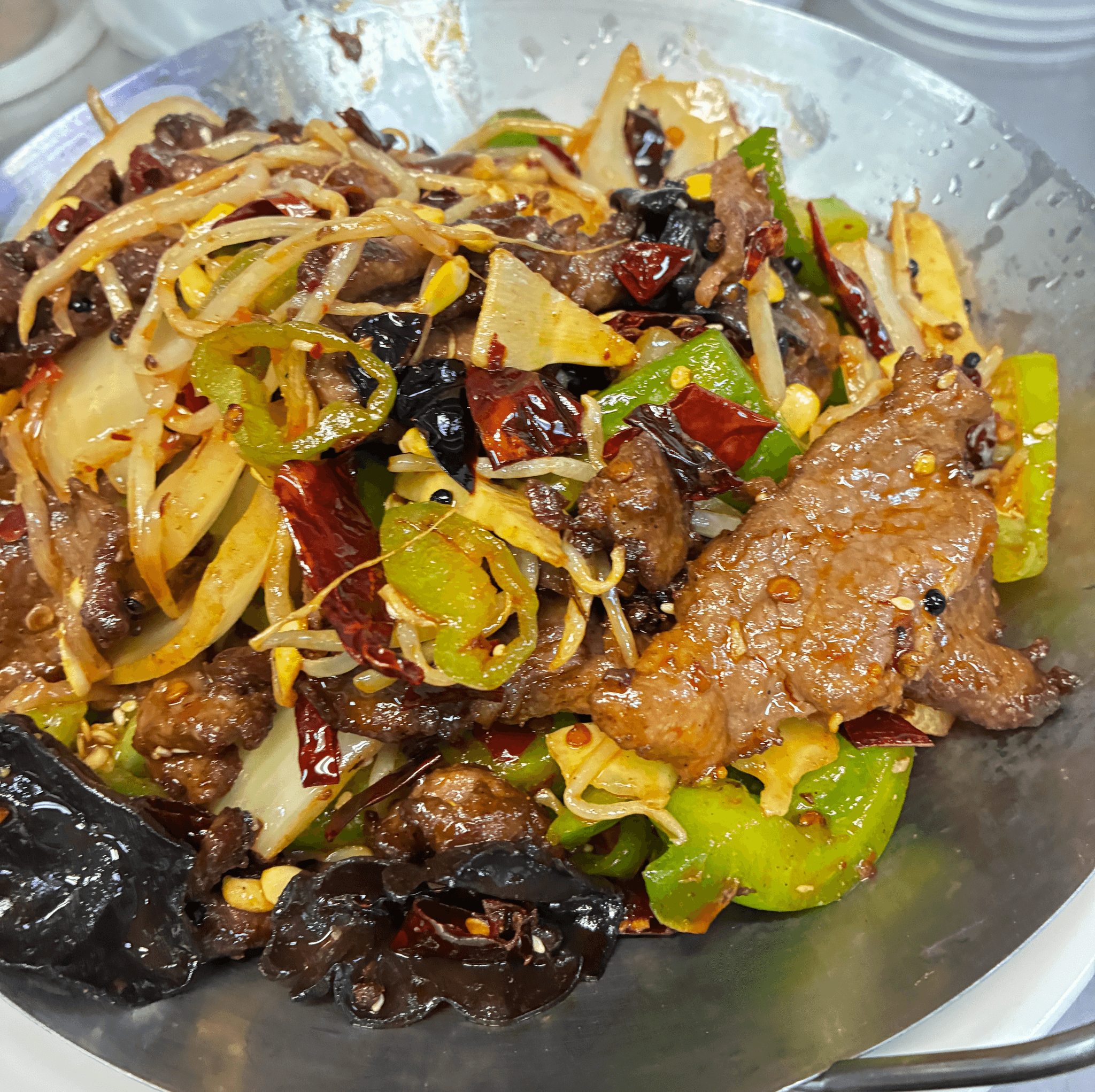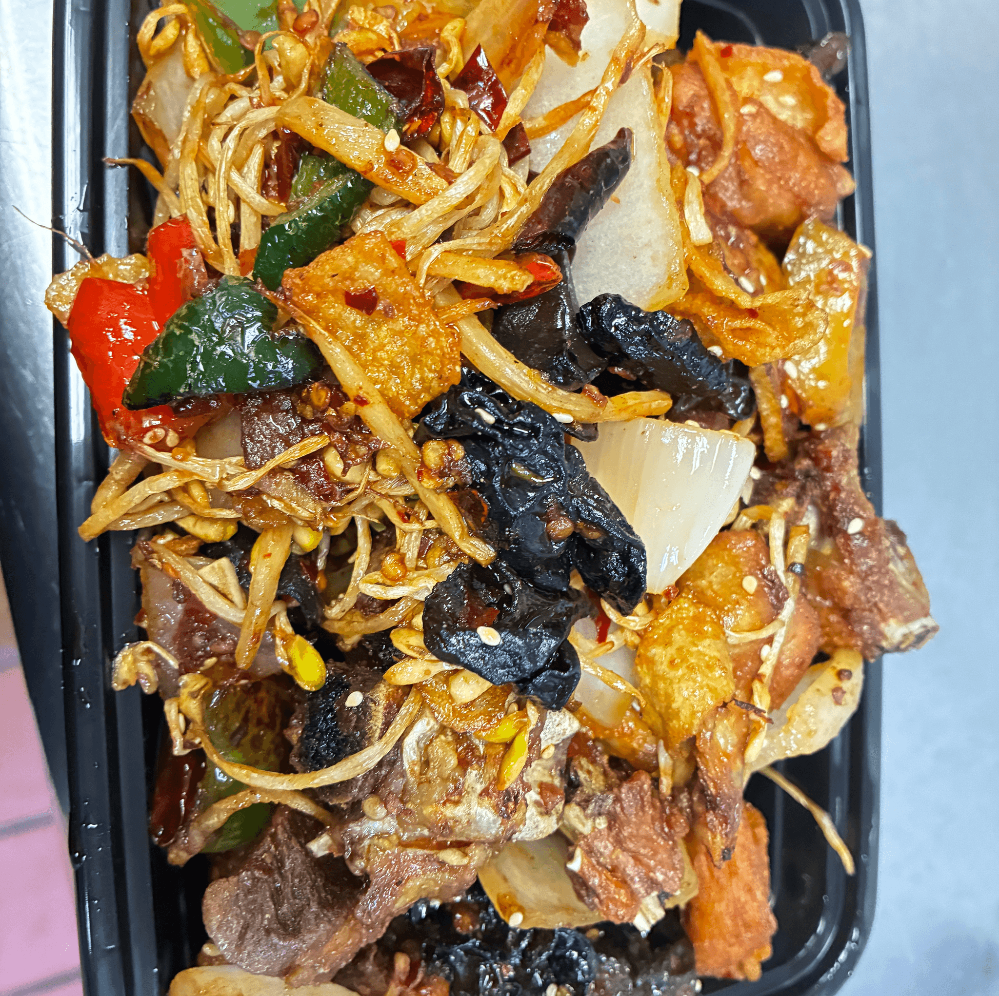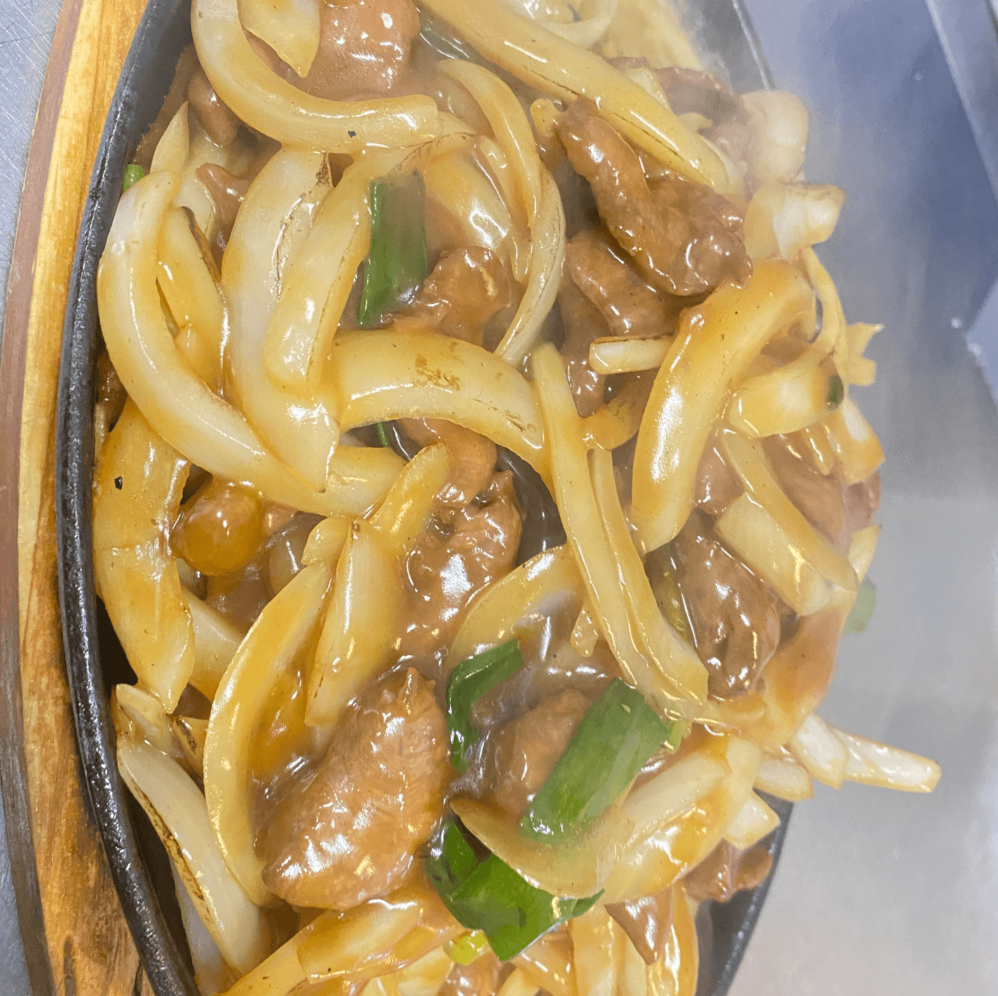 Stir fried beef with fried tofu , potatoes, onions in spicy curry sauce. Served with white rice. Spicy