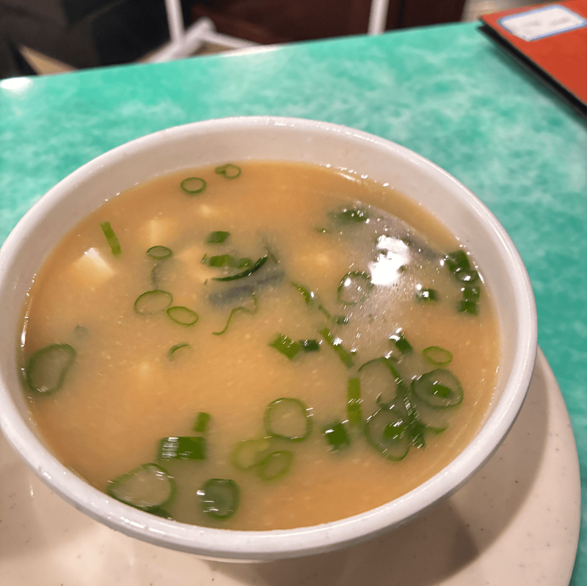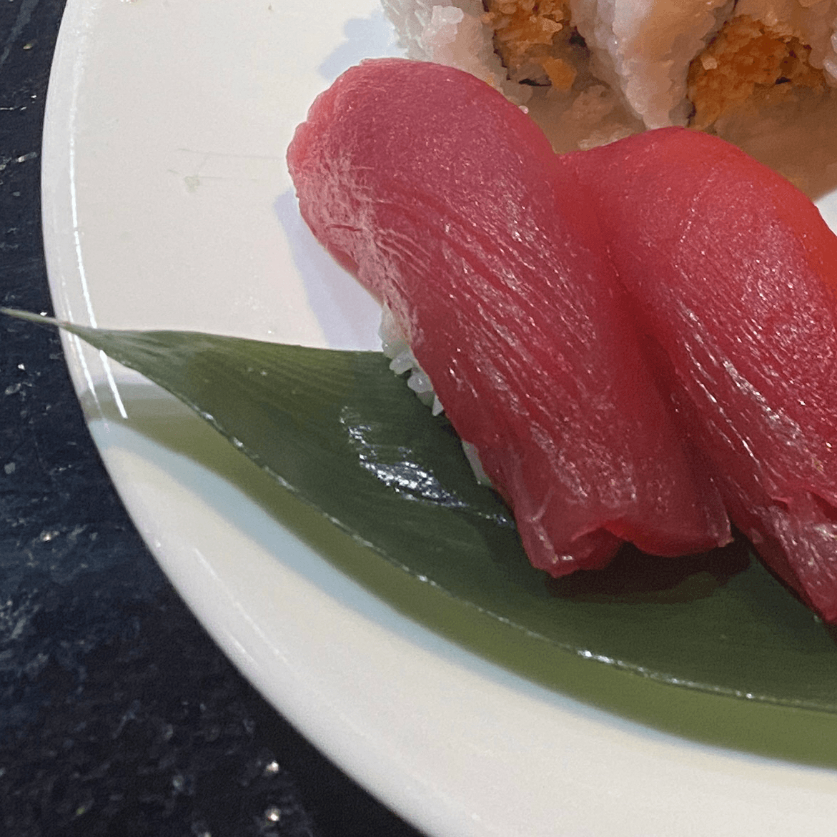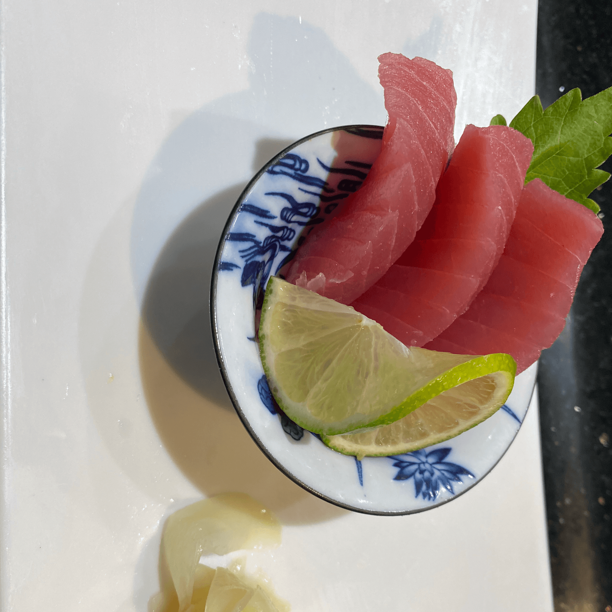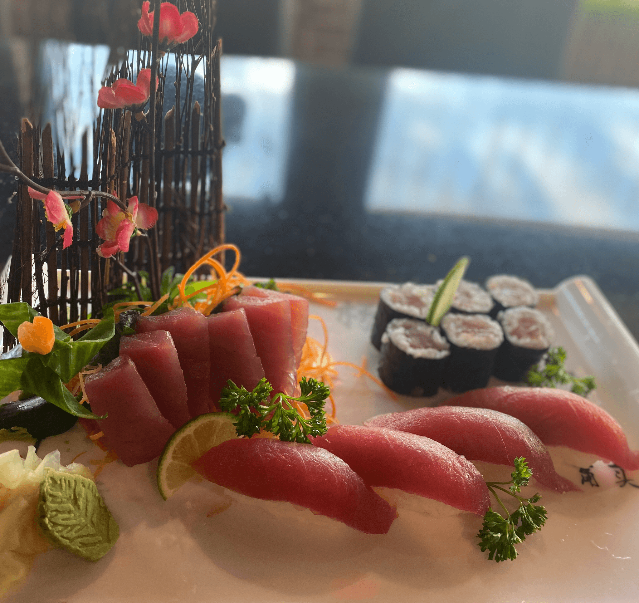 4 pieces of tuna sushi, 6 pieces of tuna sashimi and a tuna roll. Served with soup