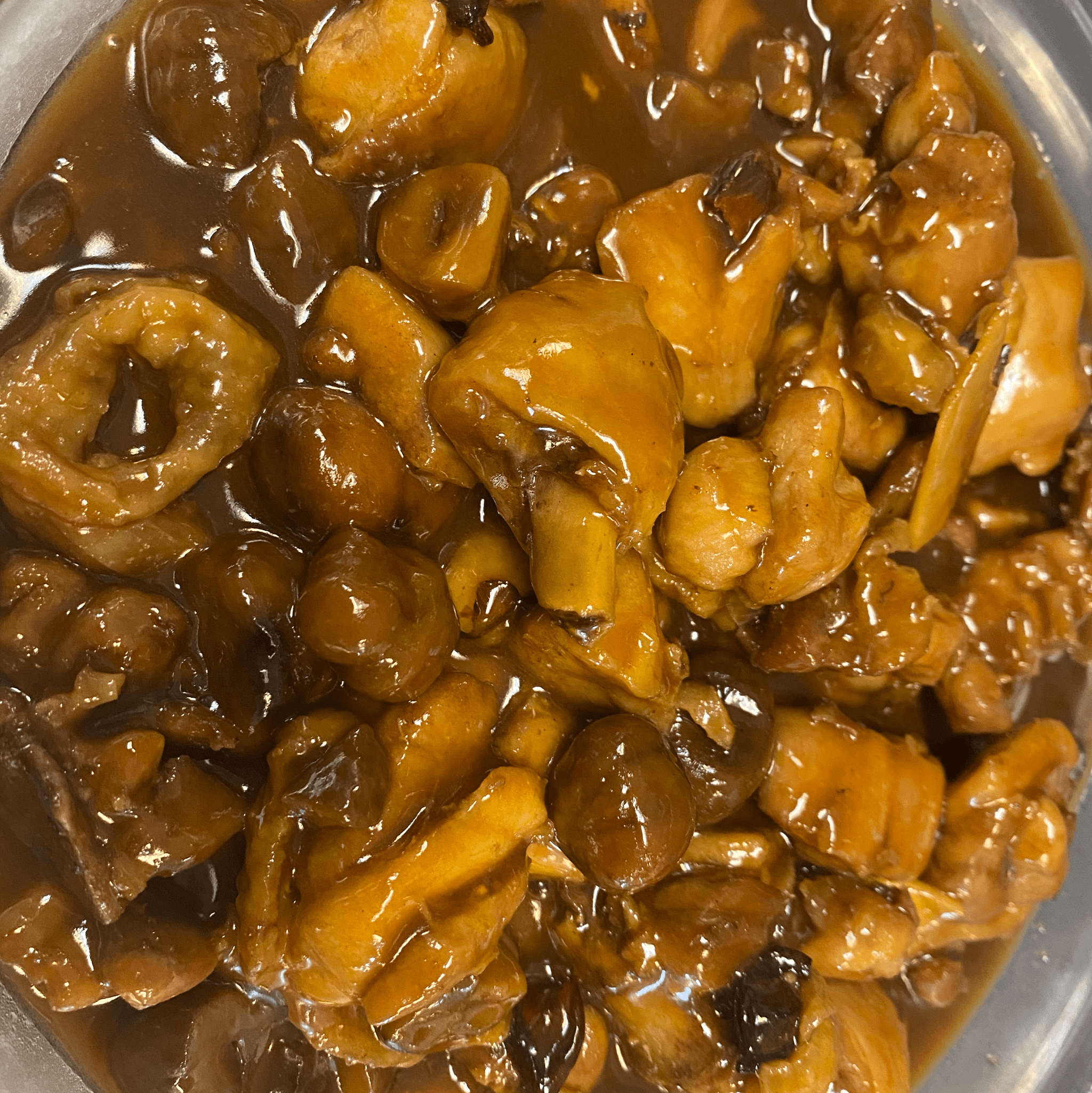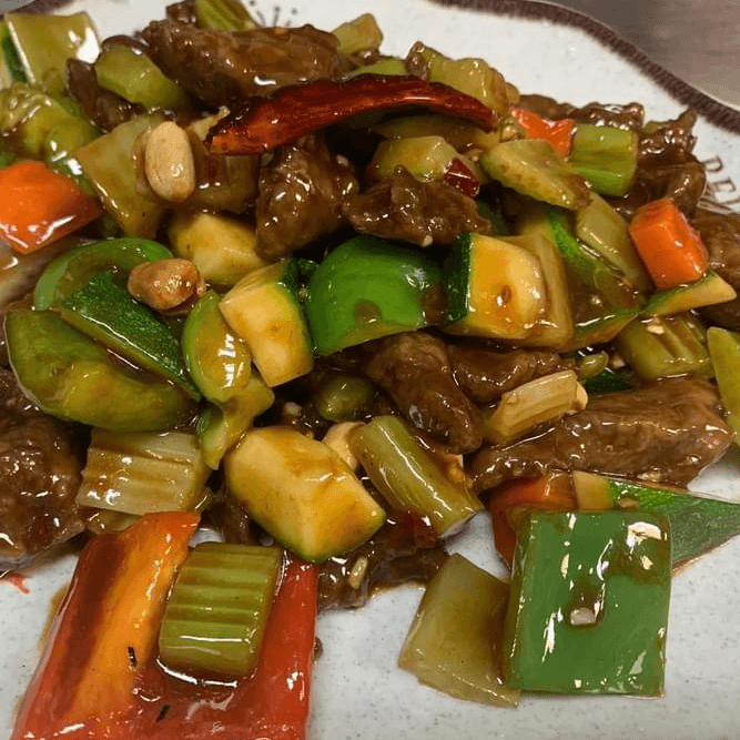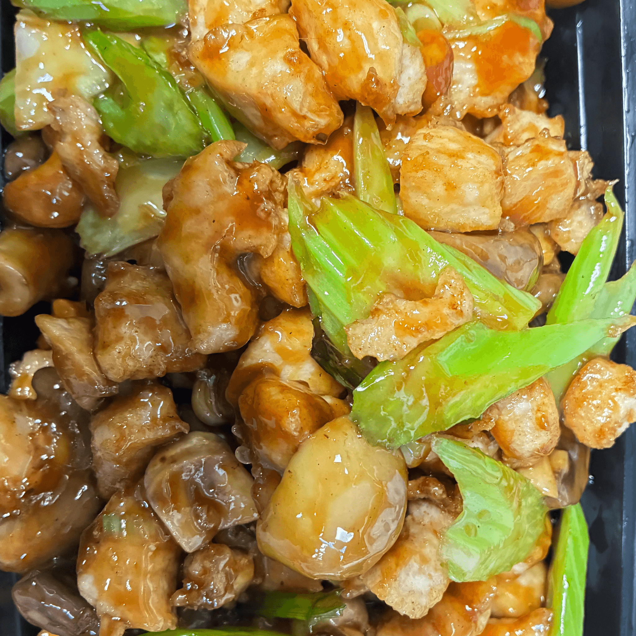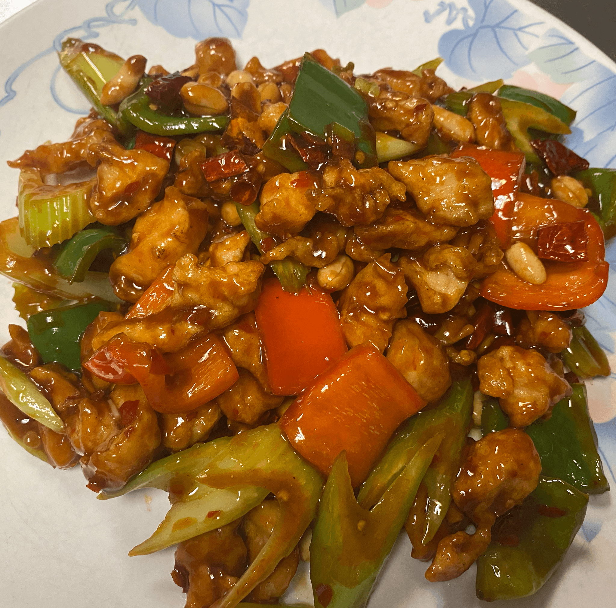 Stir-fried chicken and celery, pepper, and peanuts in spicy brown sauce. Spicy