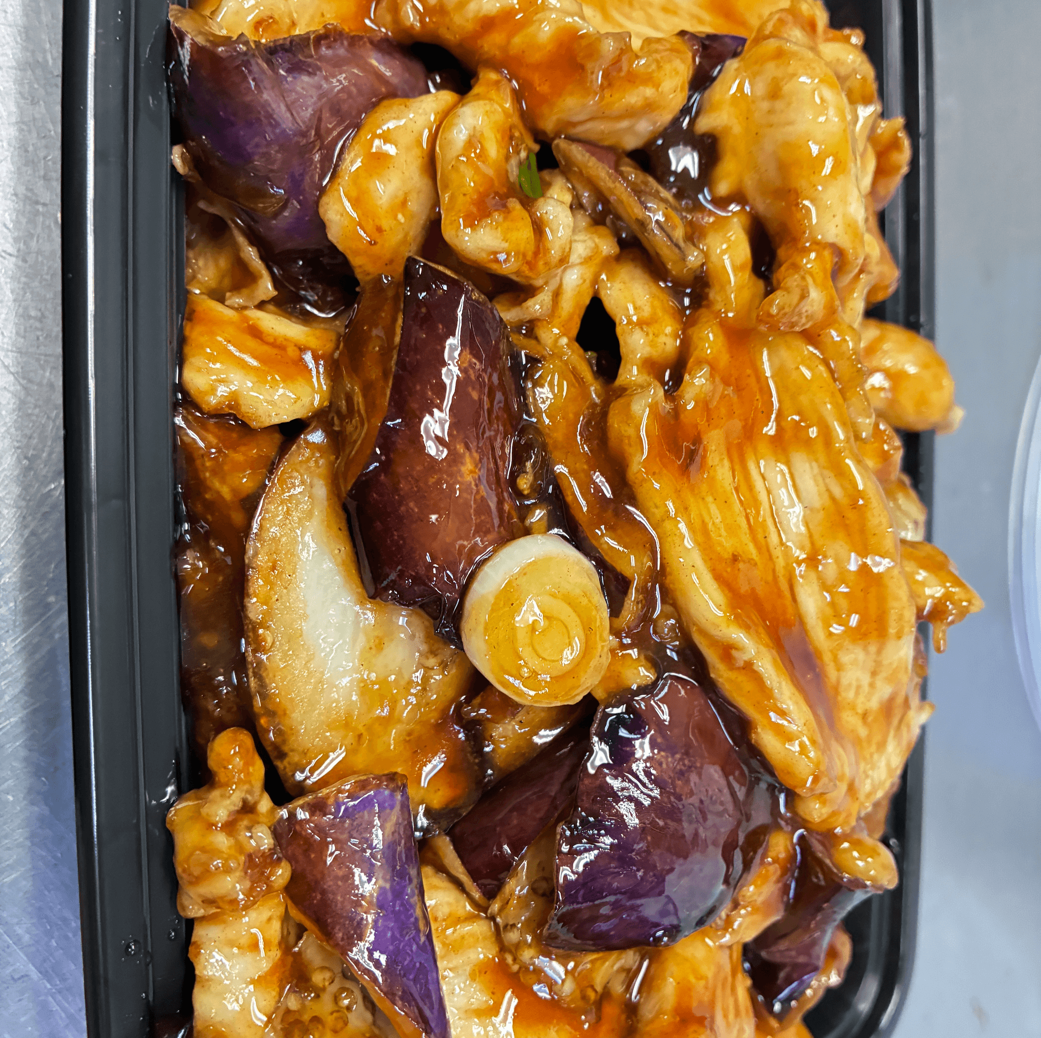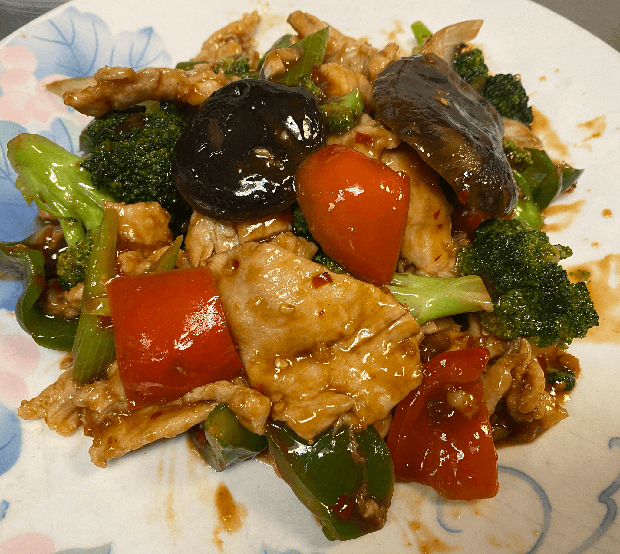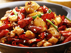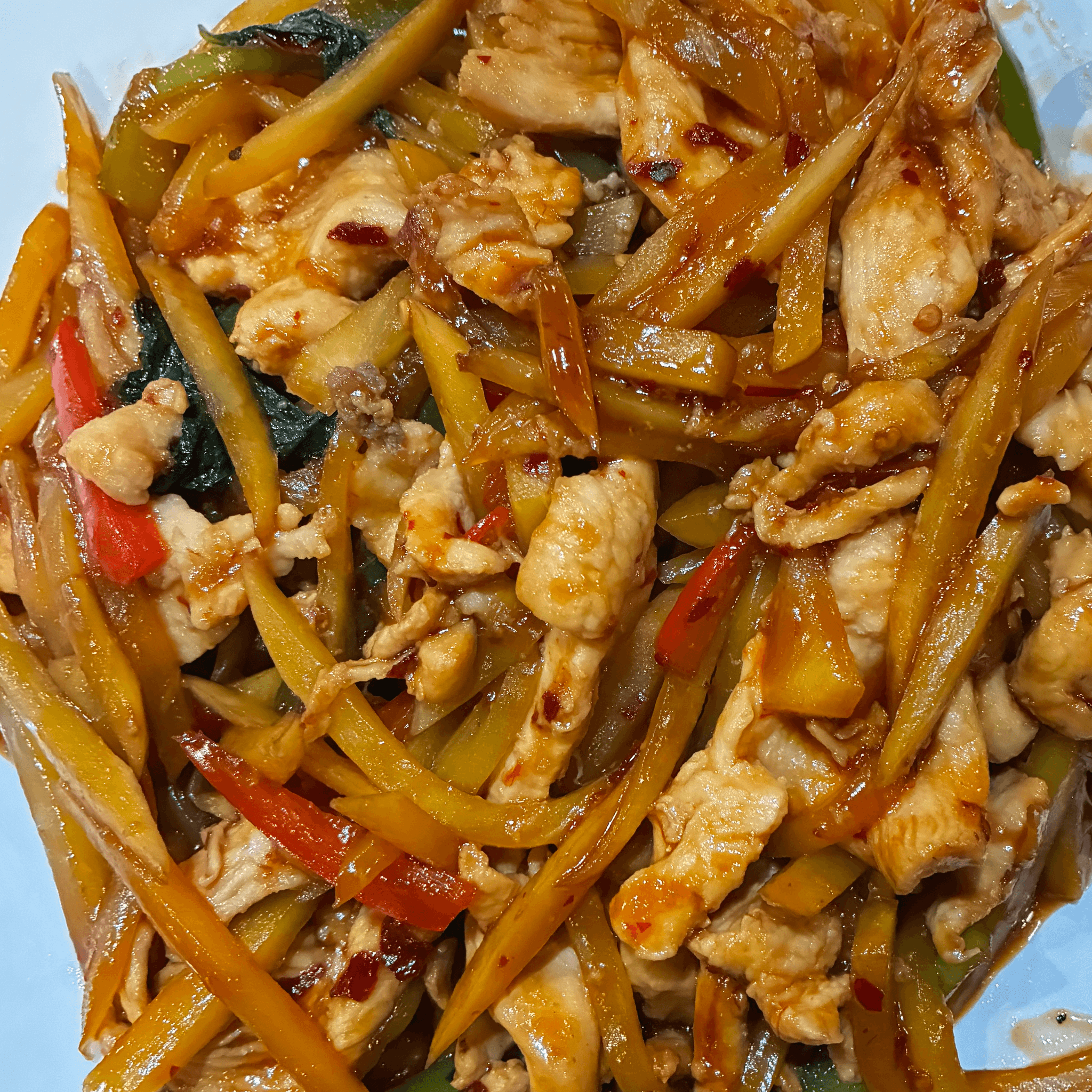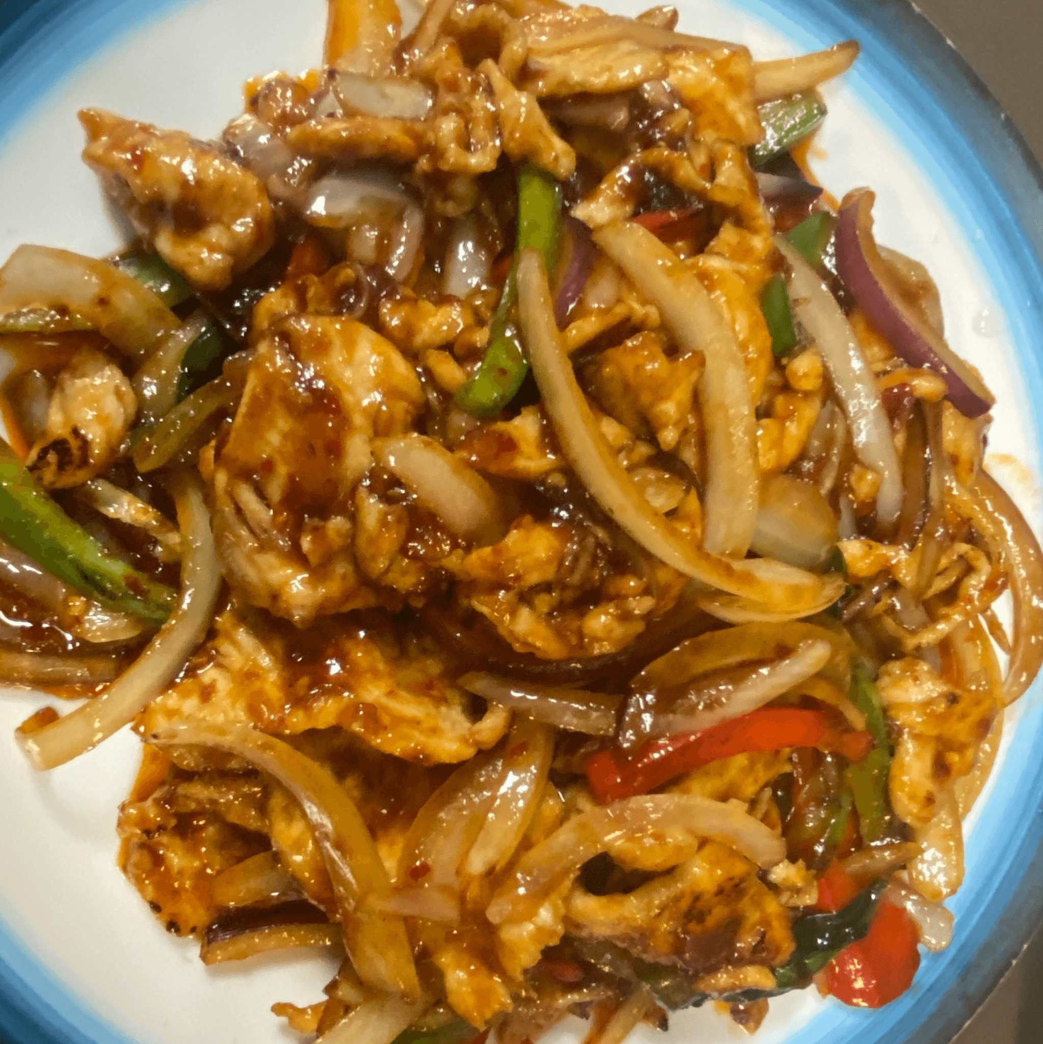Stir-fried chicken and celery, pepper, and peanuts in spicy brown sauce. Spicy