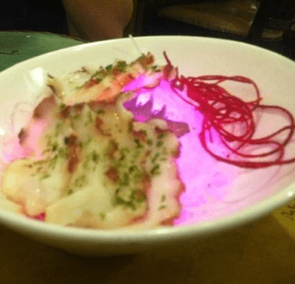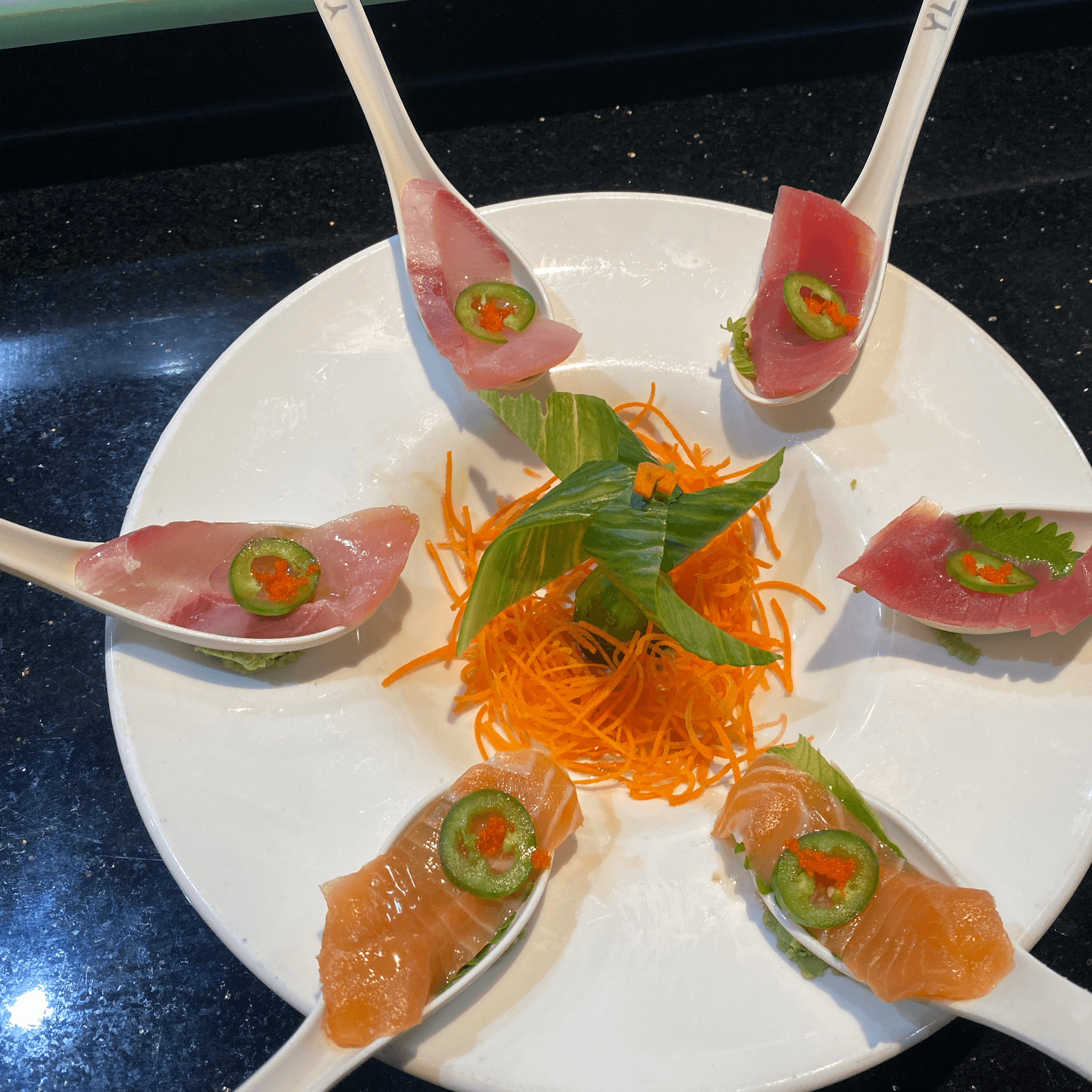 Tuna, salmon and yellowtail topped with jalapeno yuzu sauce. Spicy