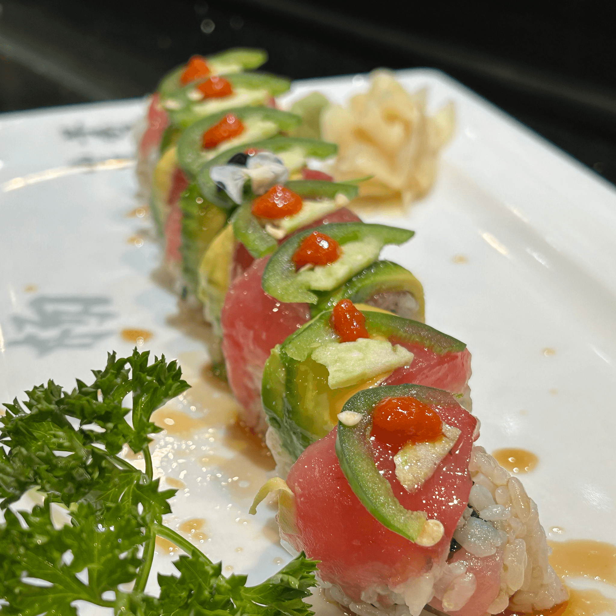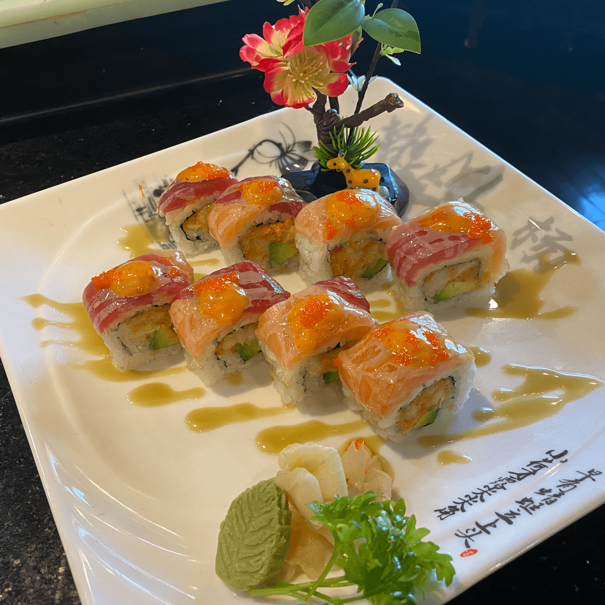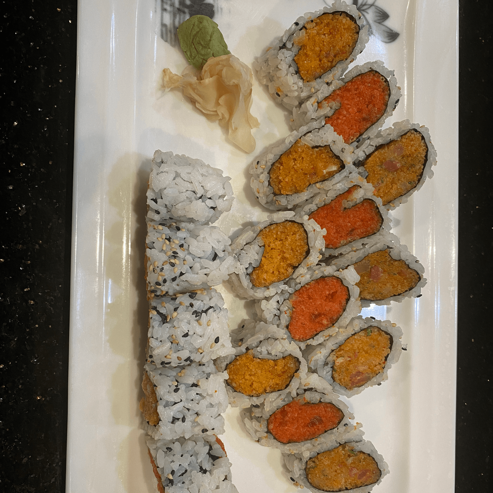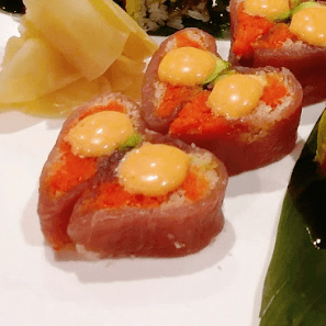 Spicy white tuna, avocado and crunch inside topped with tuna, salmon, fish roe and wasabi sauce. Organic sushi rice. Hot and spicy