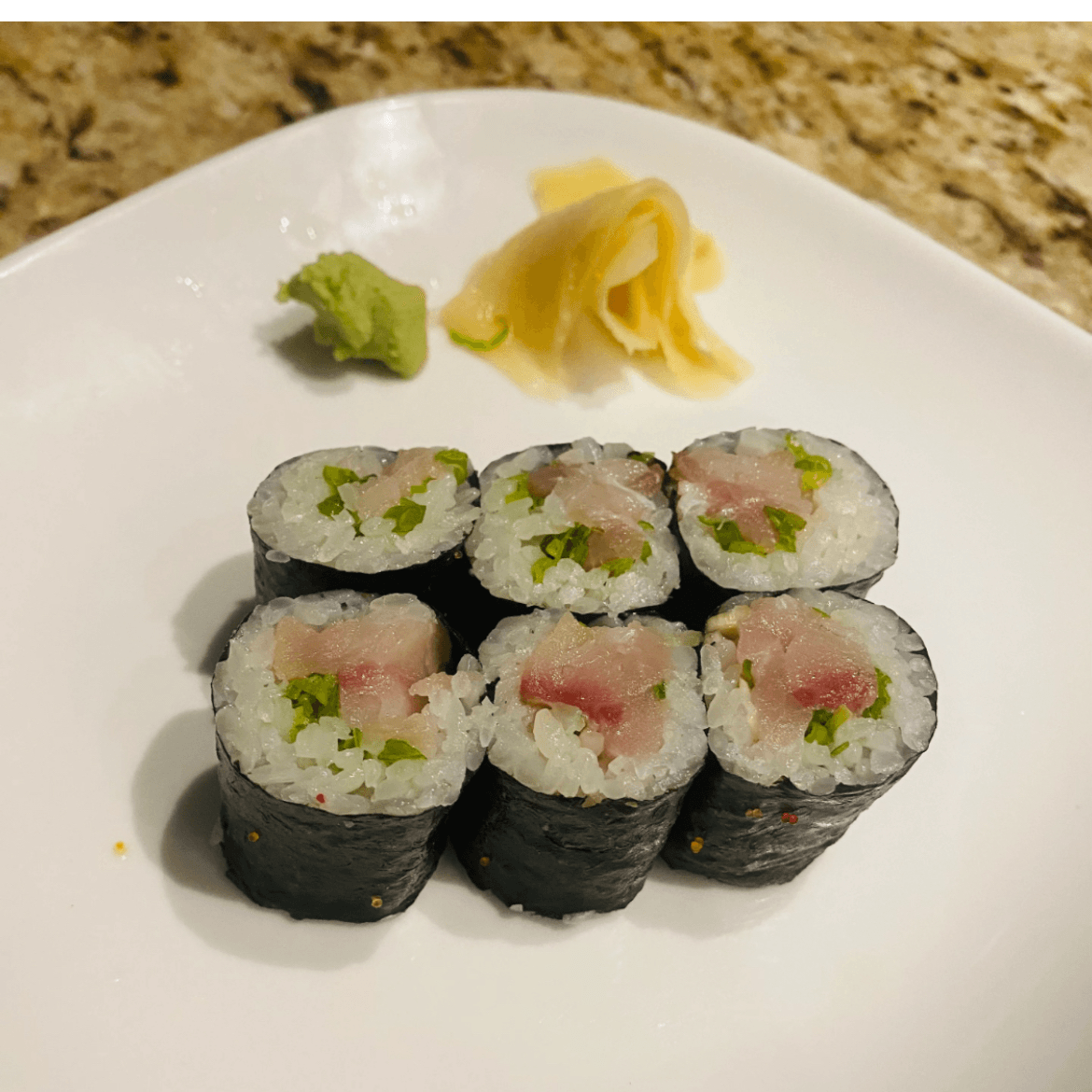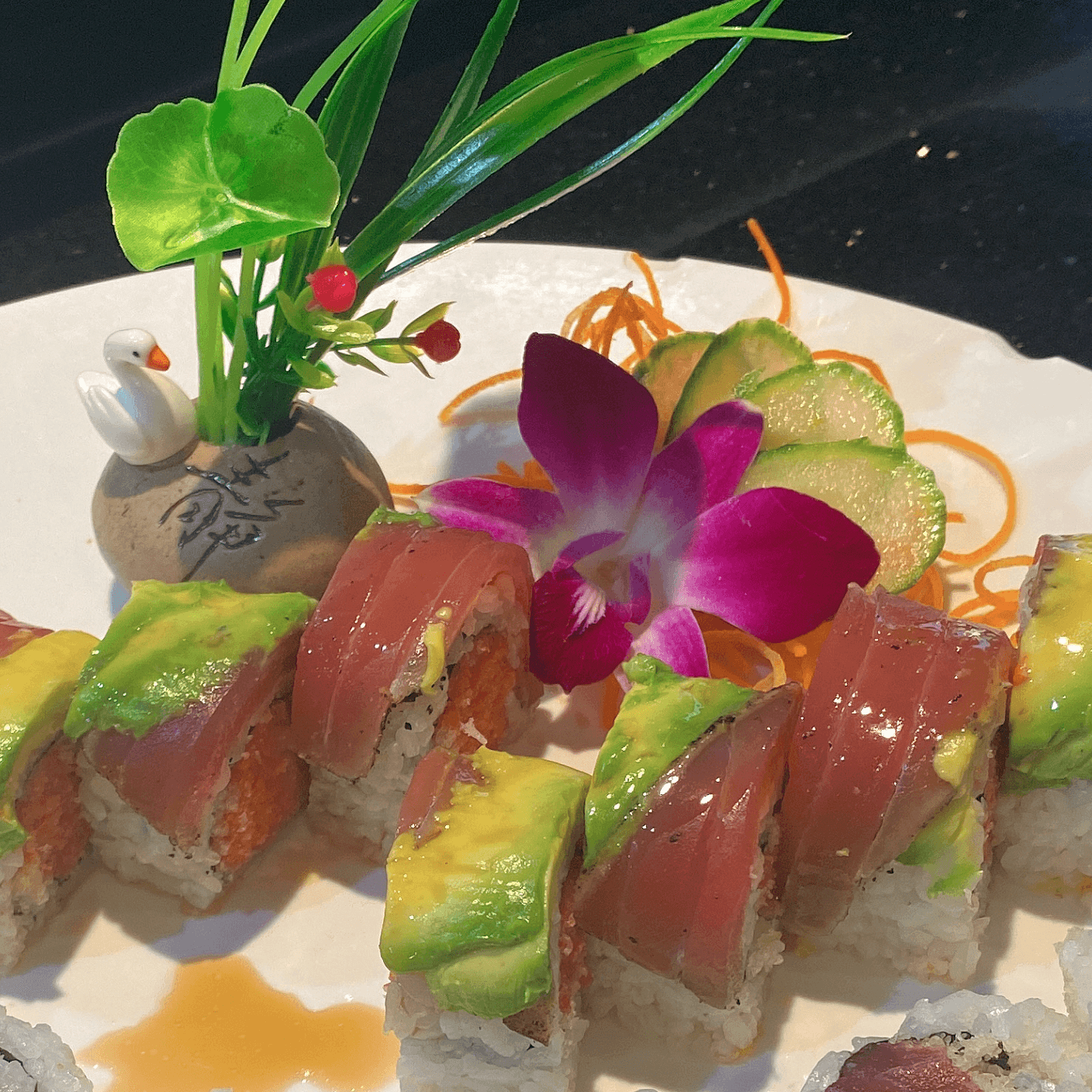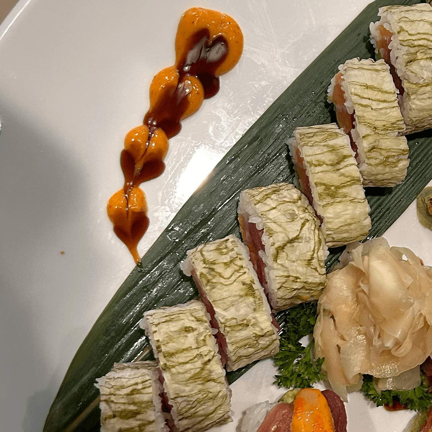 Spicy white tuna, avocado and crunch inside topped with tuna, salmon, fish roe and wasabi sauce. Organic sushi rice. Hot and spicy