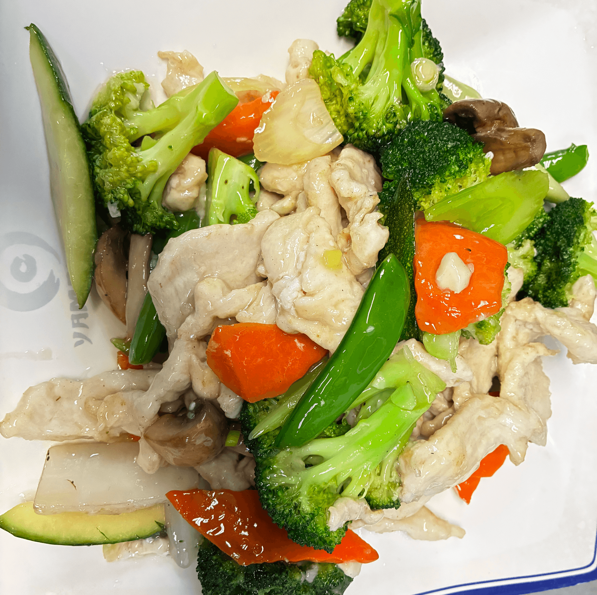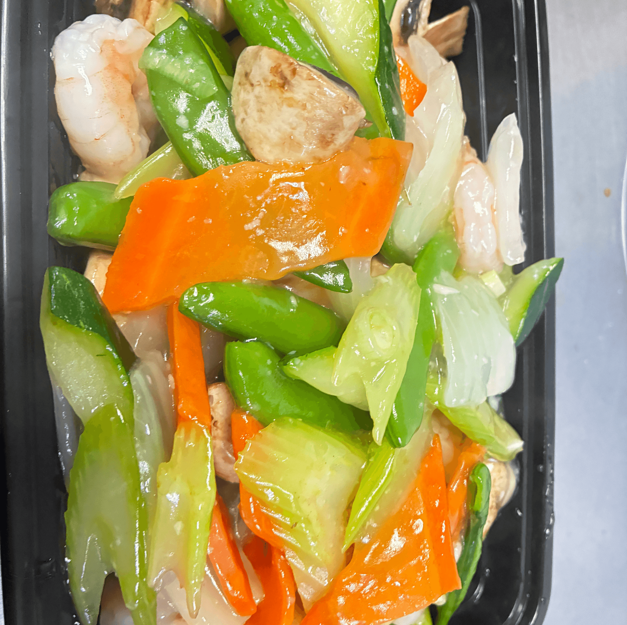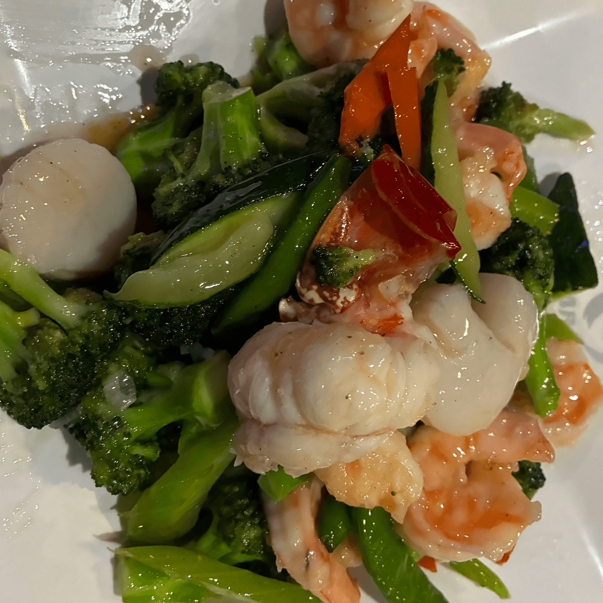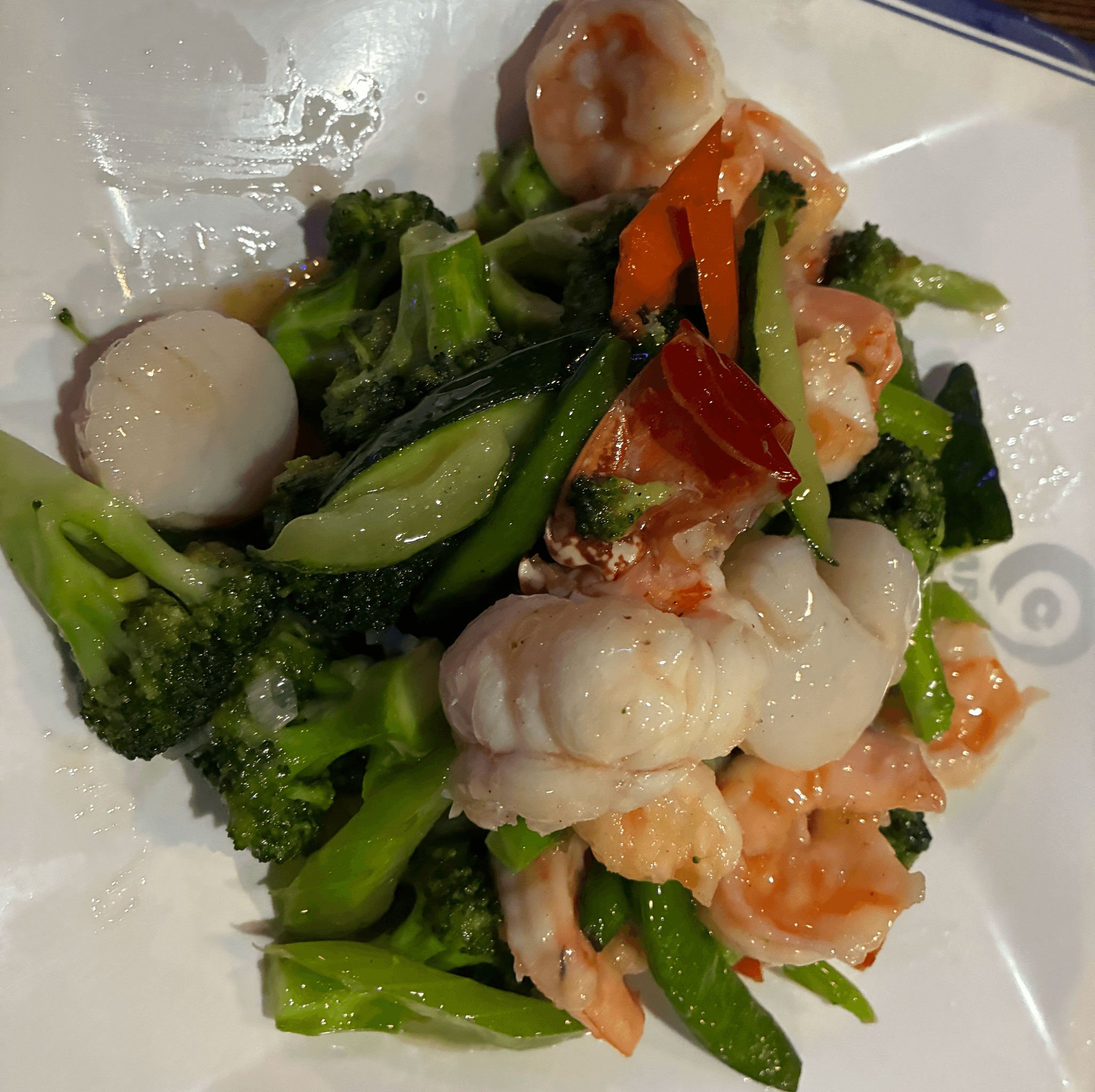 Served with white rice. Shrimp, sea scallops, and lobster tail mixed with Chinese vegetables in a white sauce