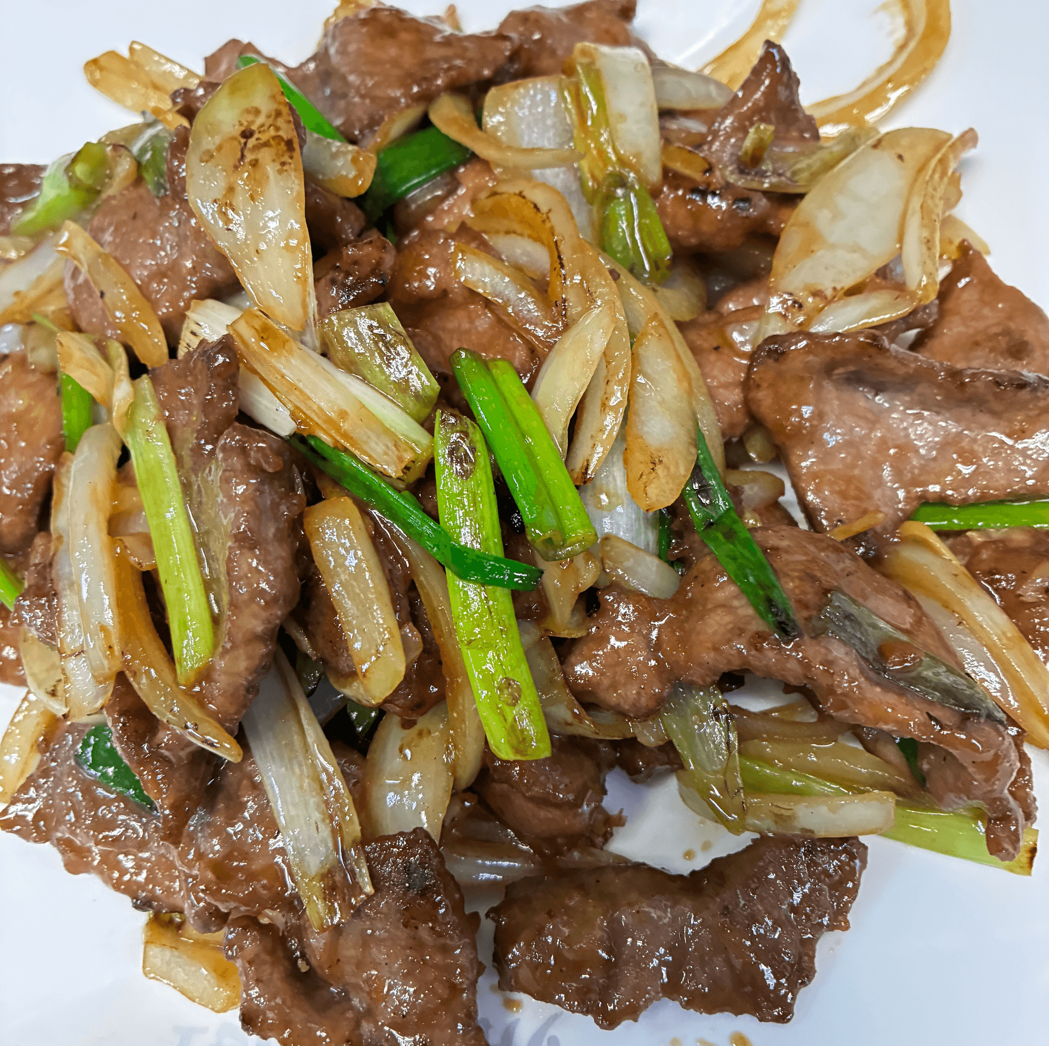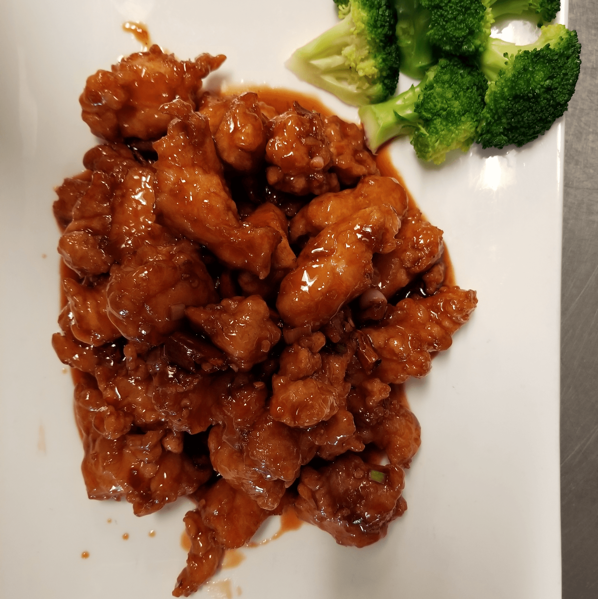 Crispy beef with orange sauce. Served with white rice. Spicy