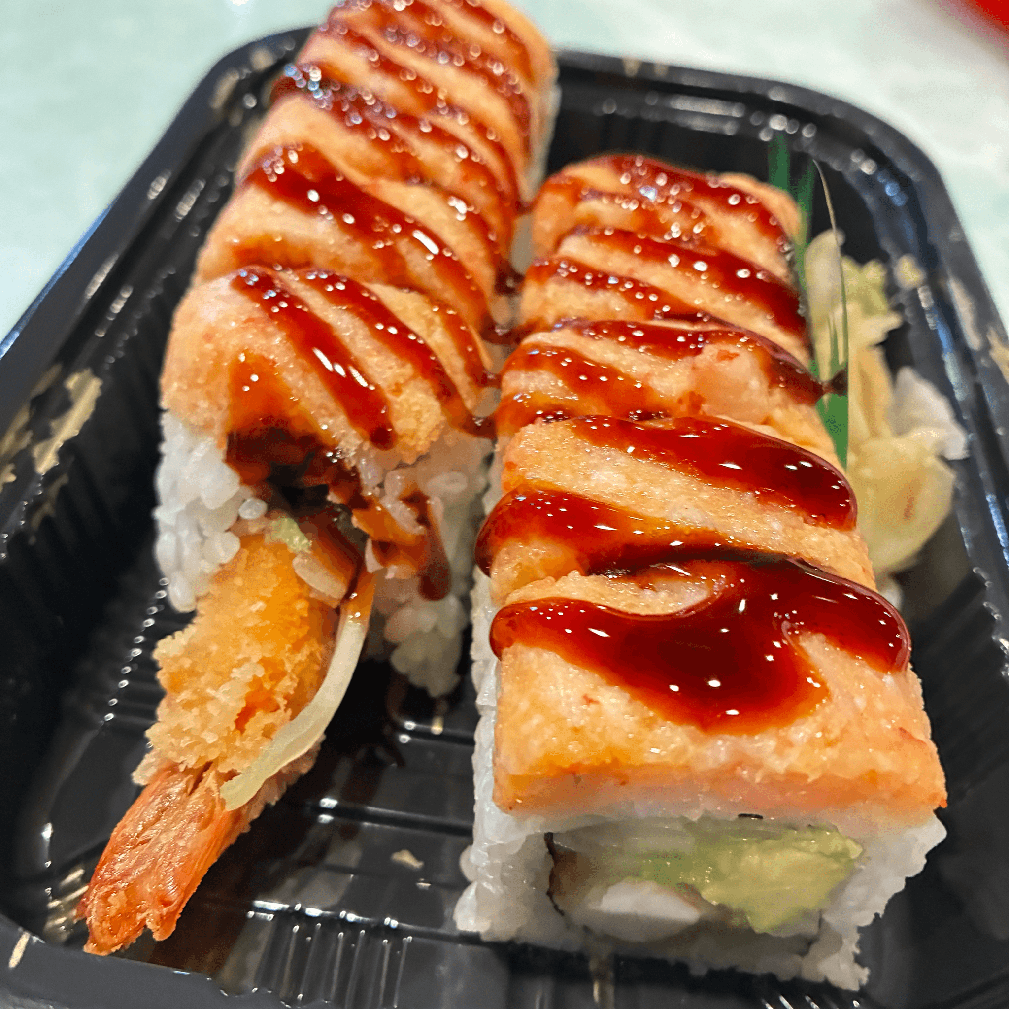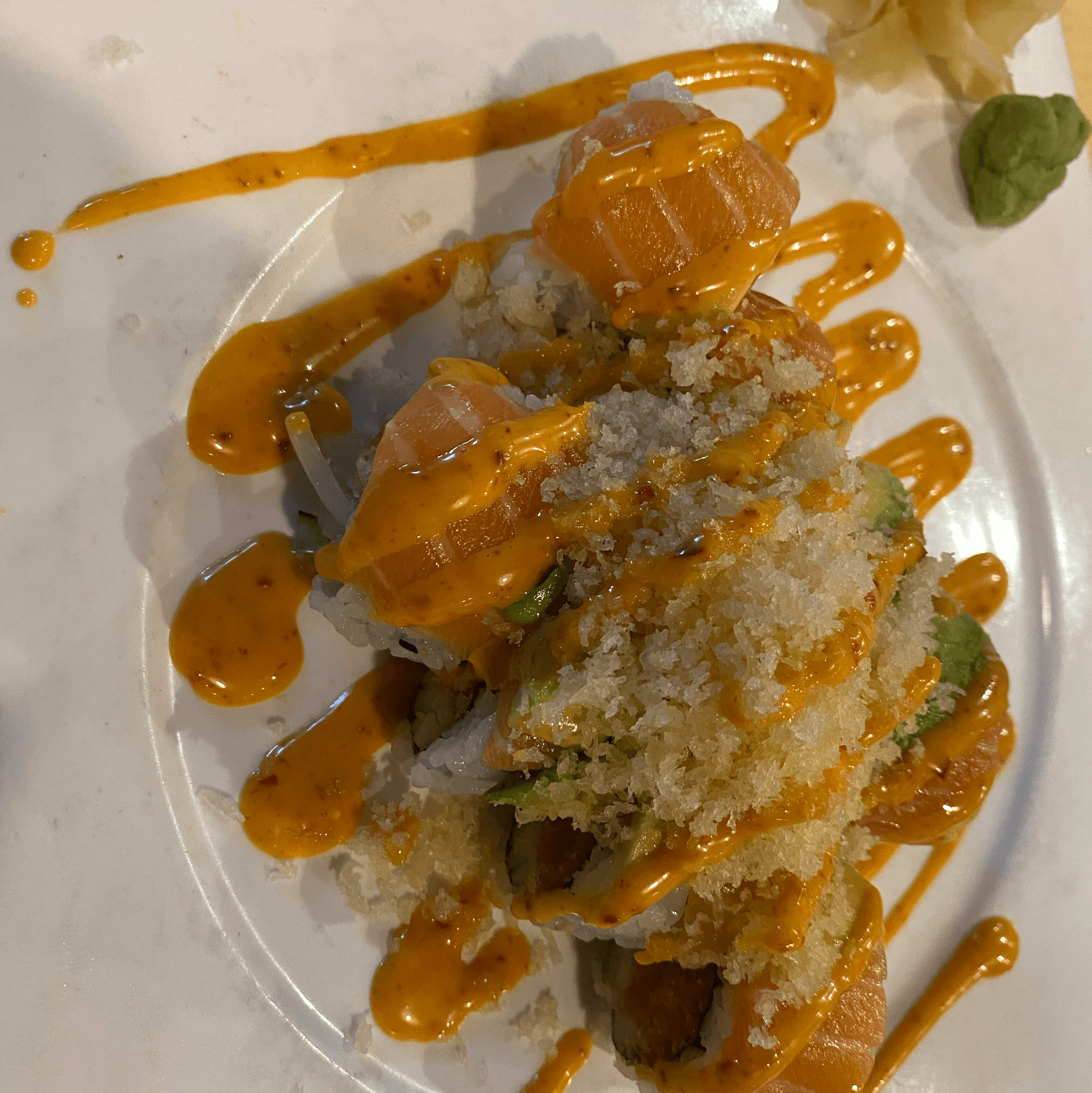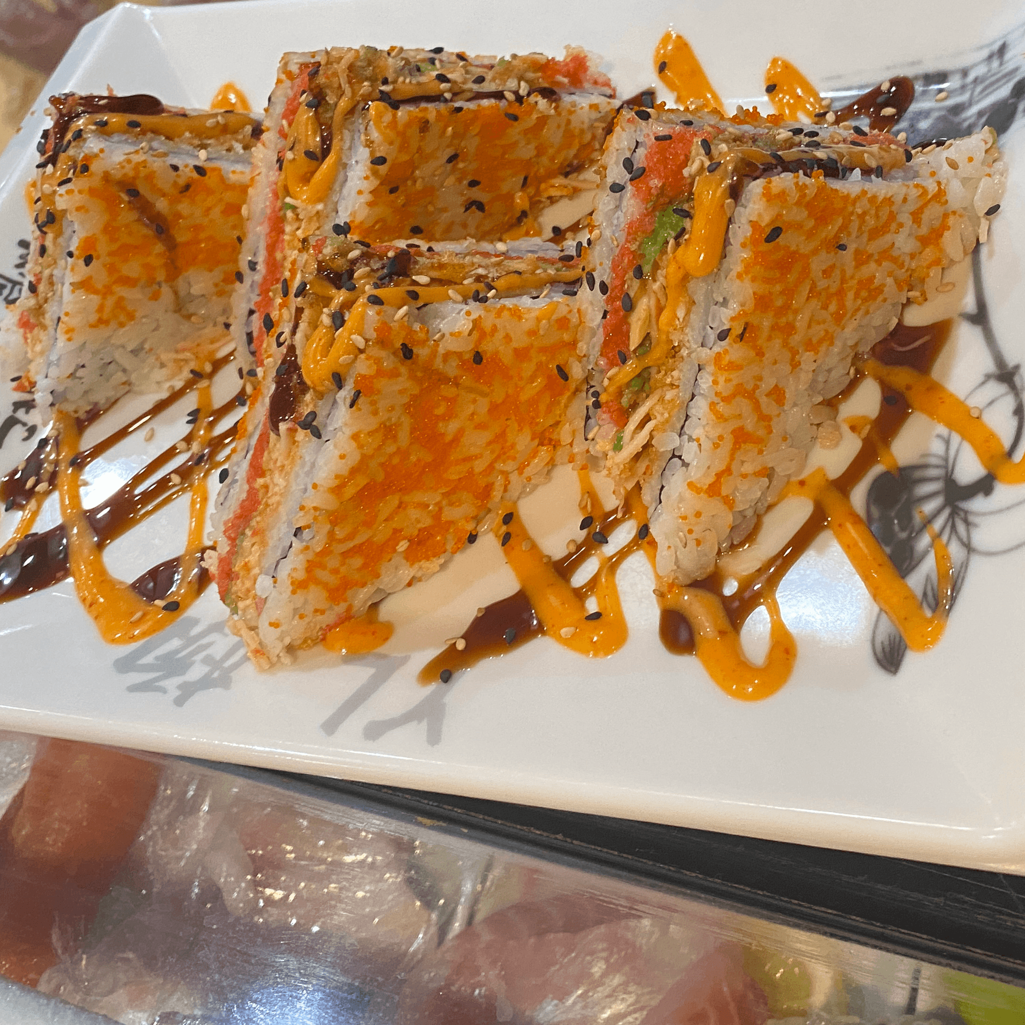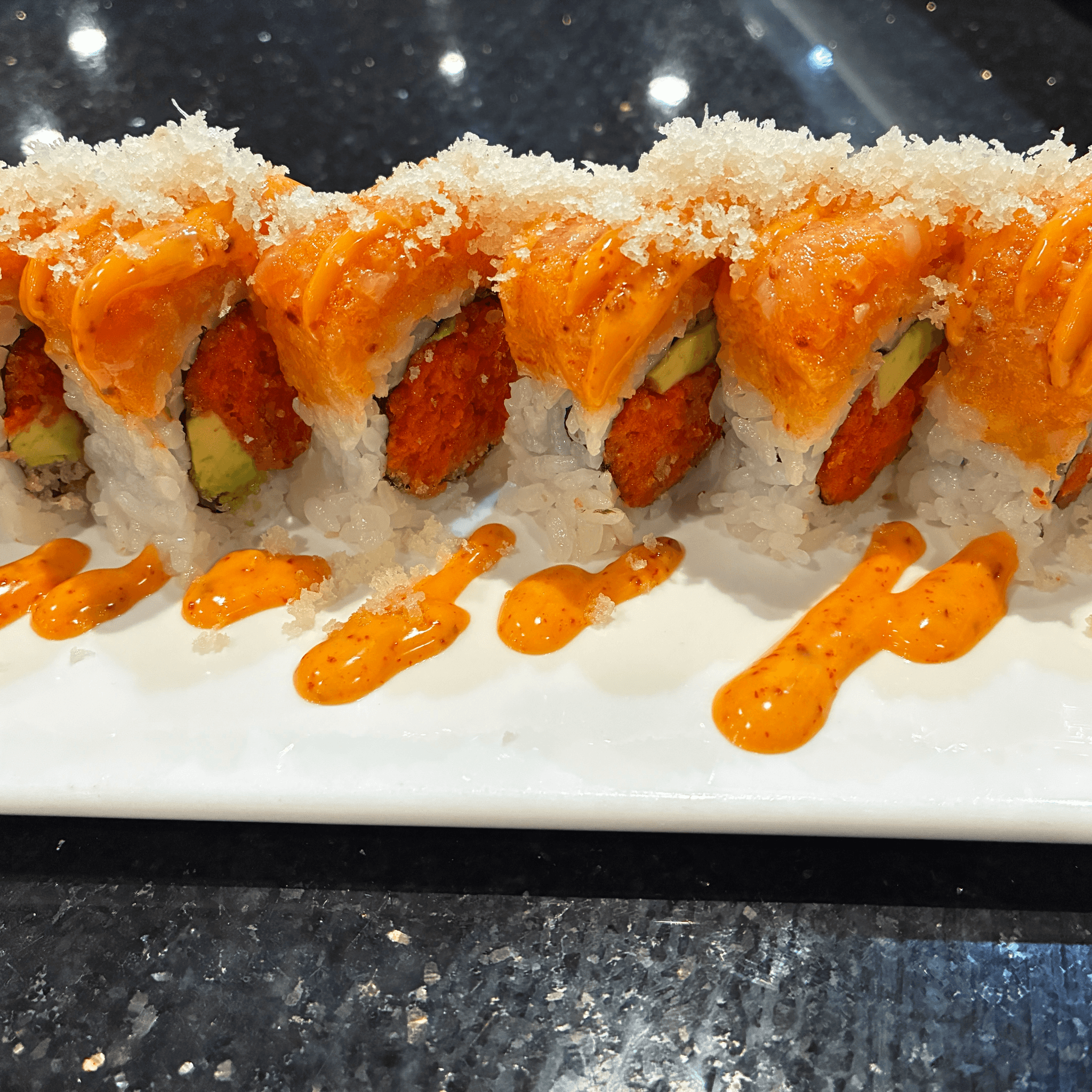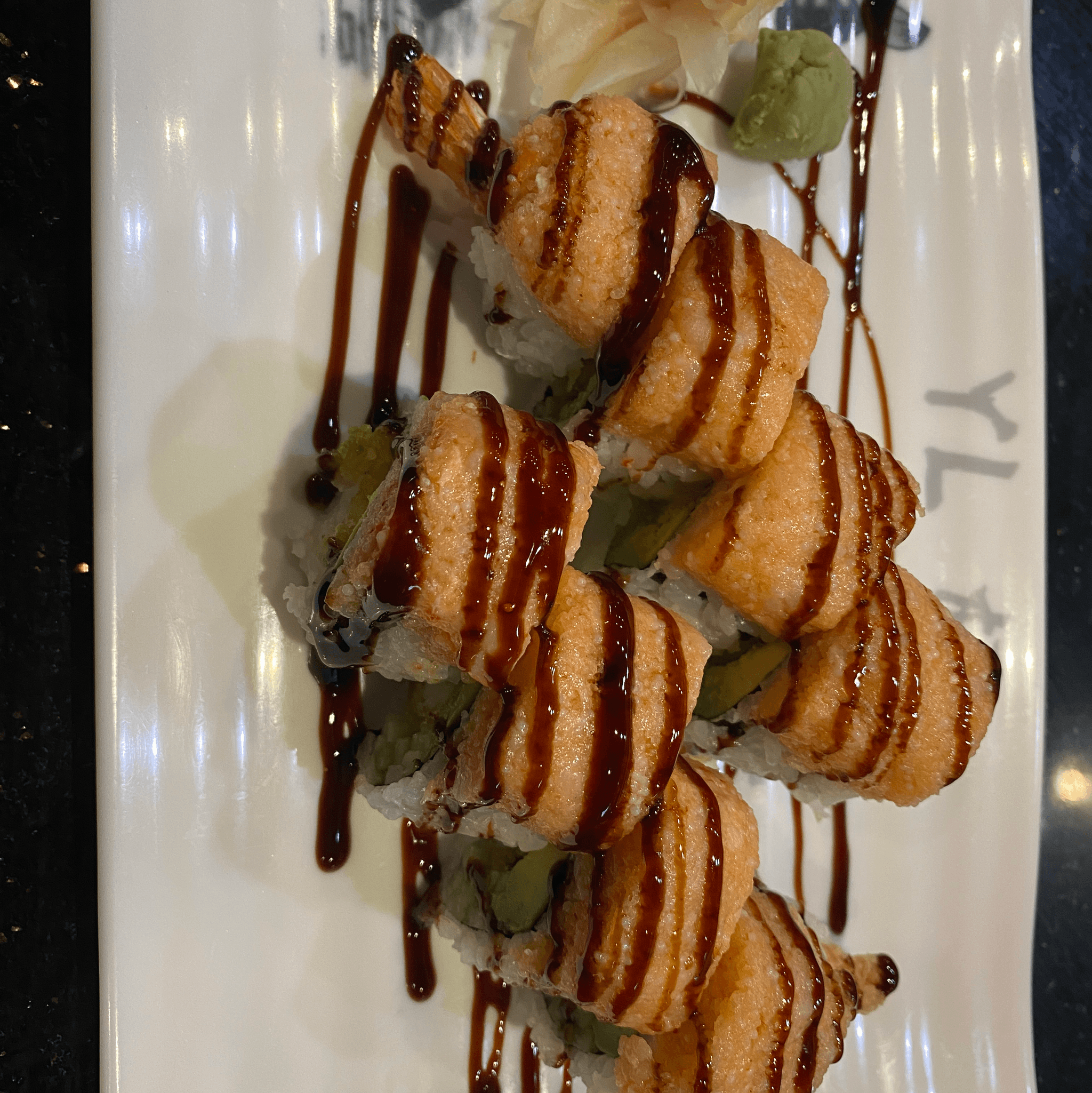 Deep-fried salmon, yellowtail, and avocado roll topped with spicy crabmeat eel sauce spicy mayo