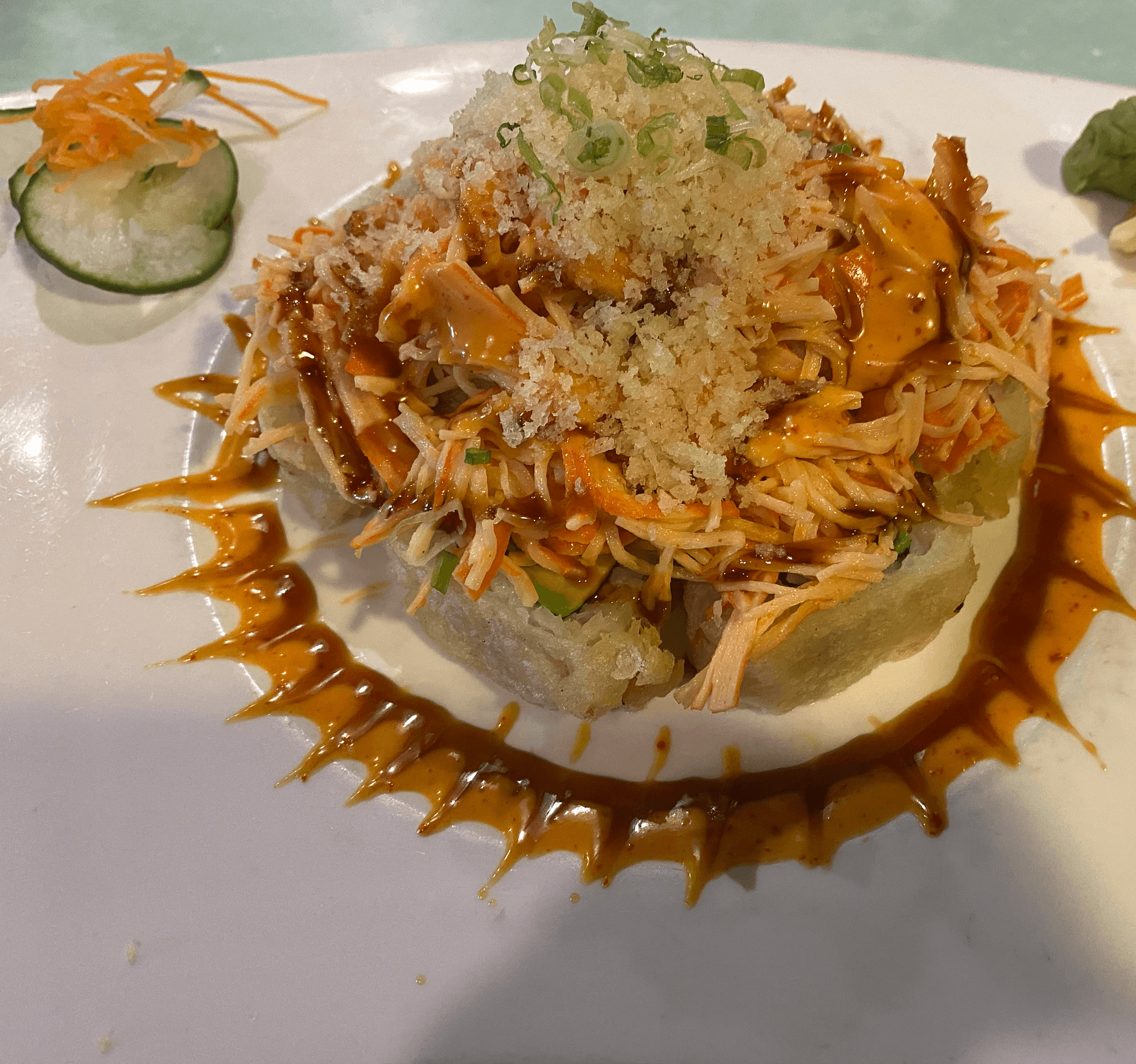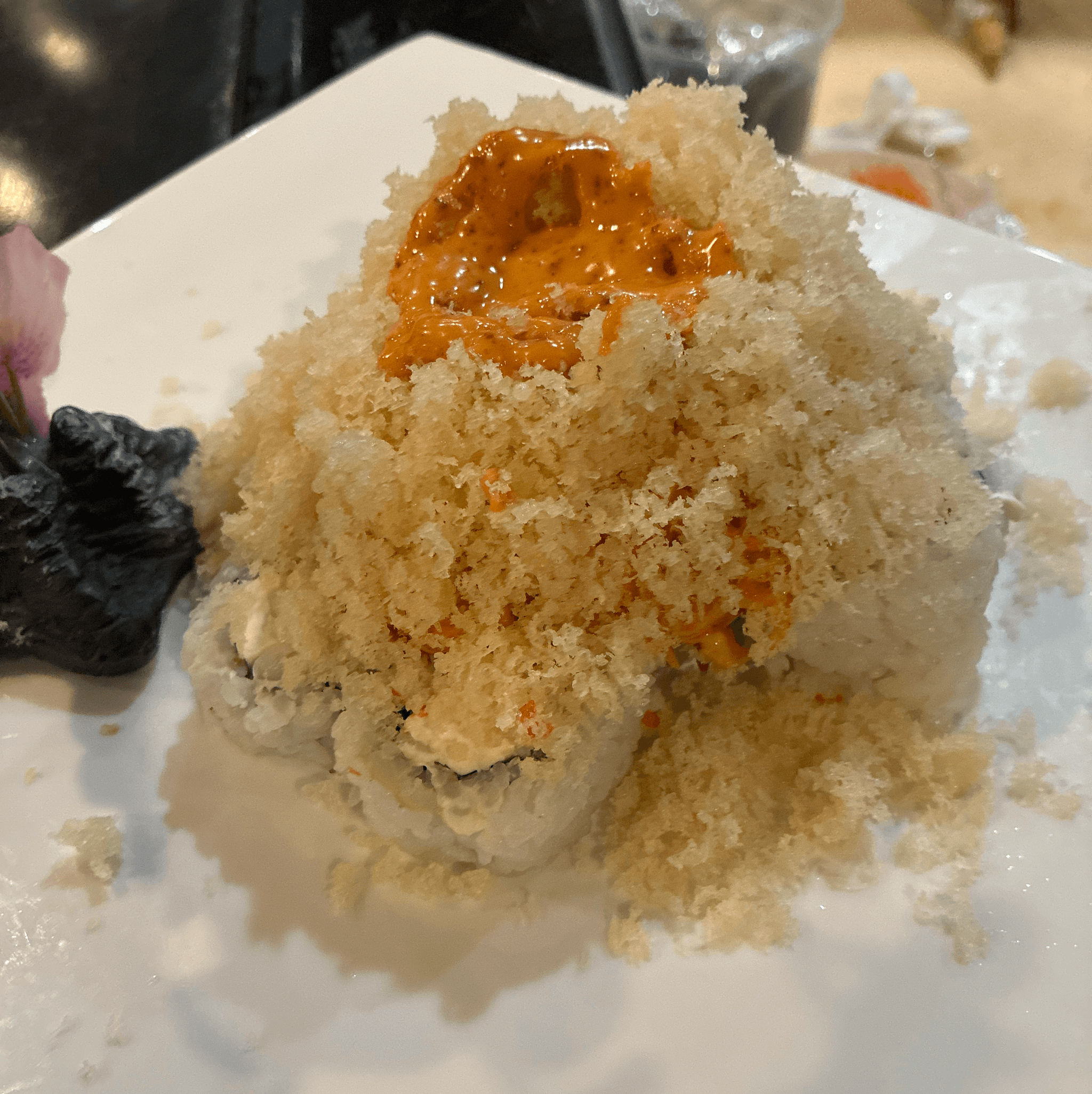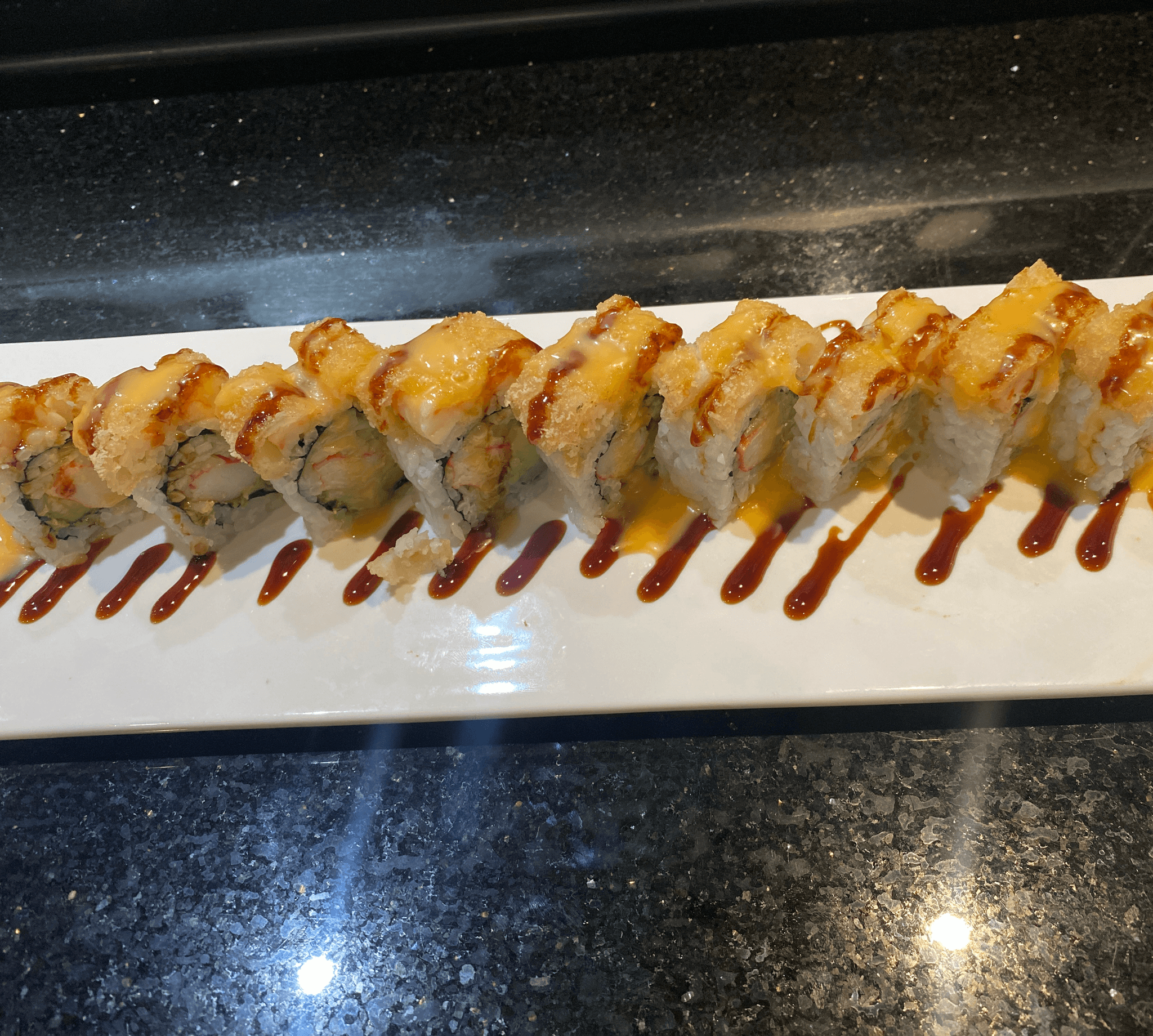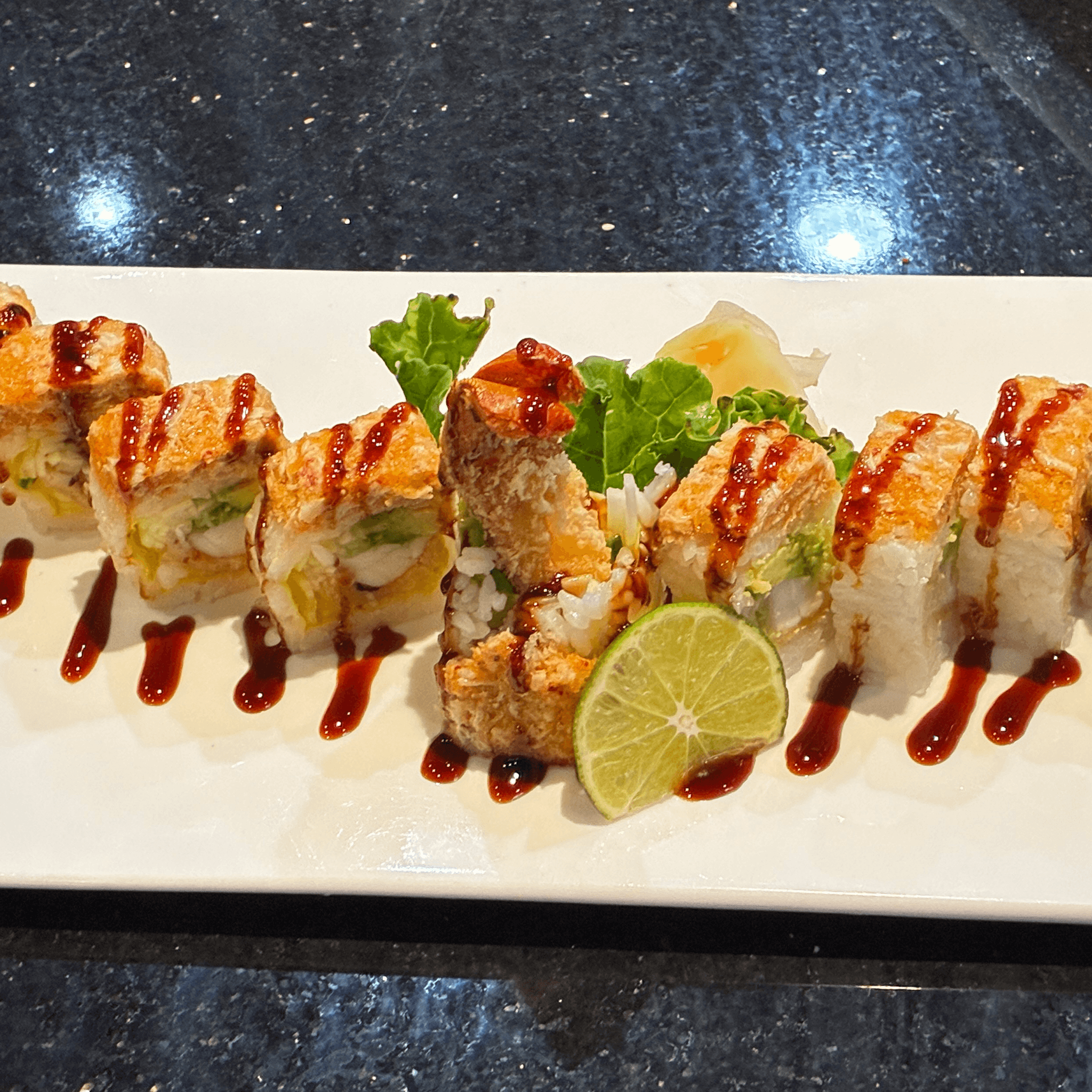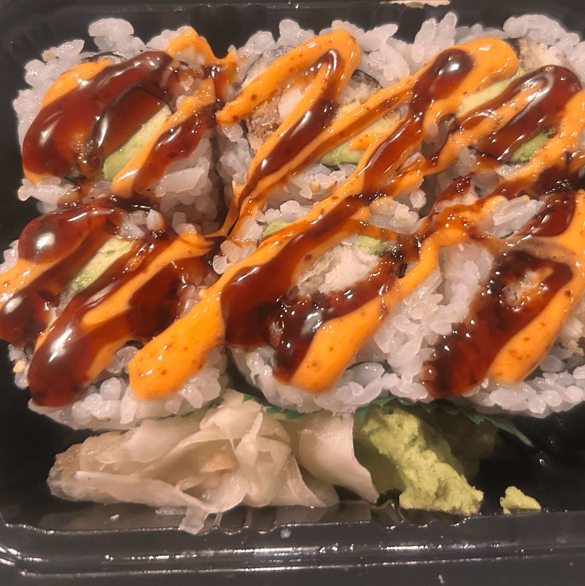 Deep-fried salmon, yellowtail, and avocado roll topped with spicy crabmeat eel sauce spicy mayo