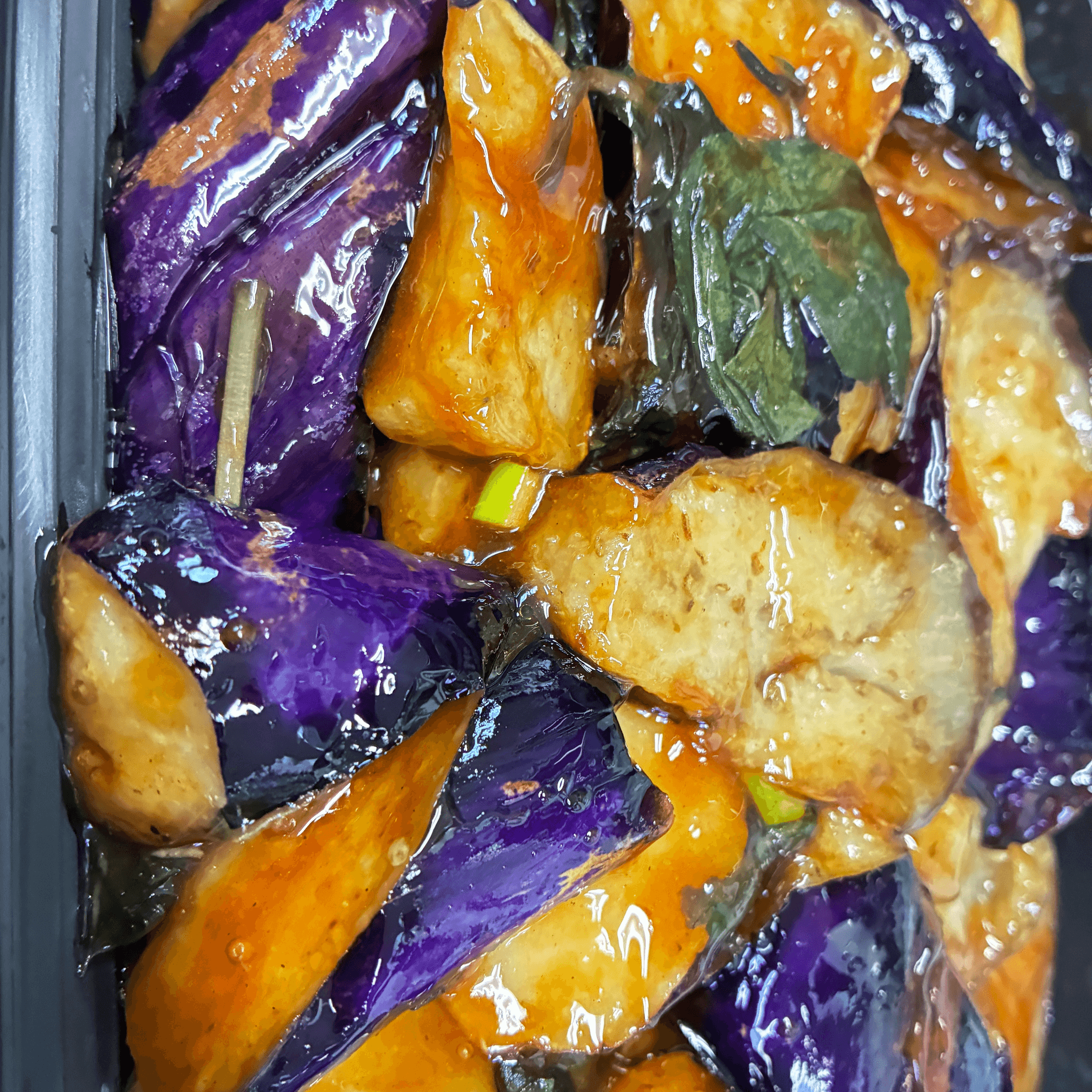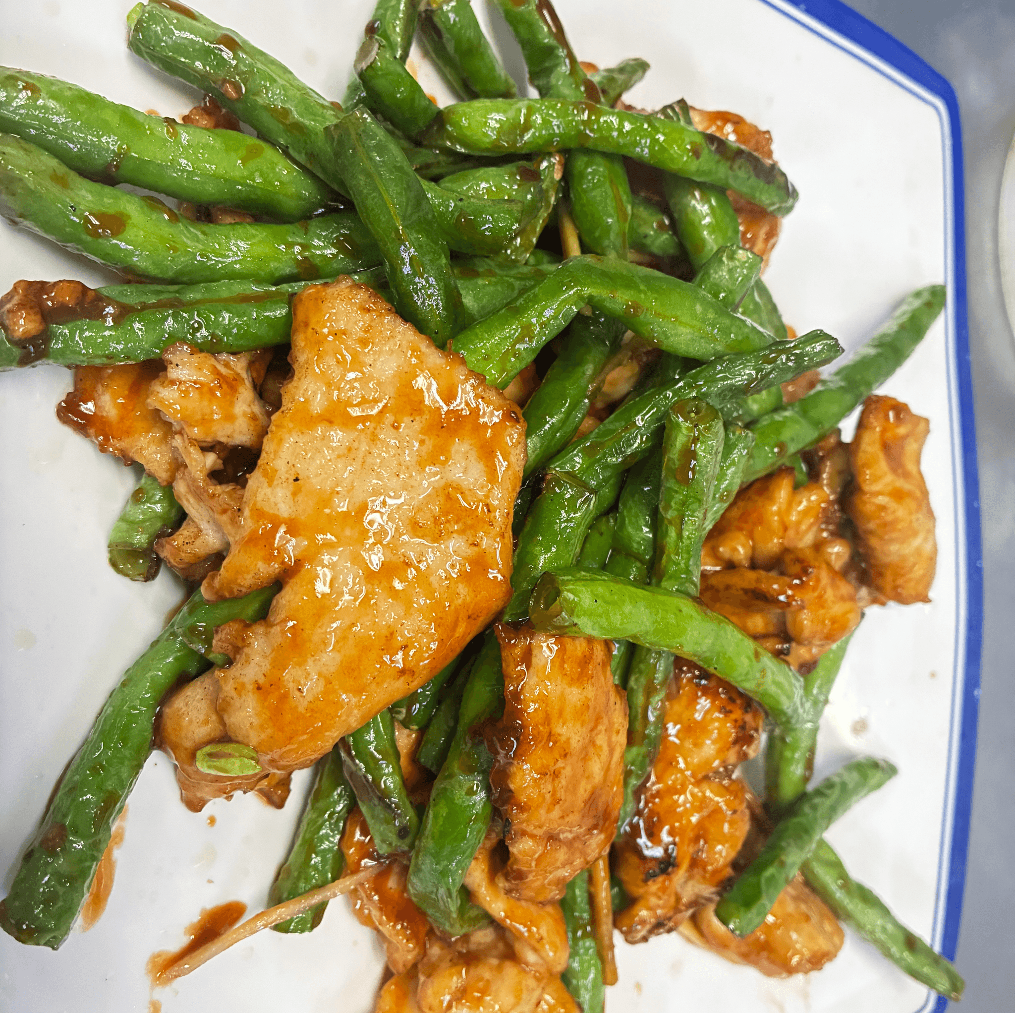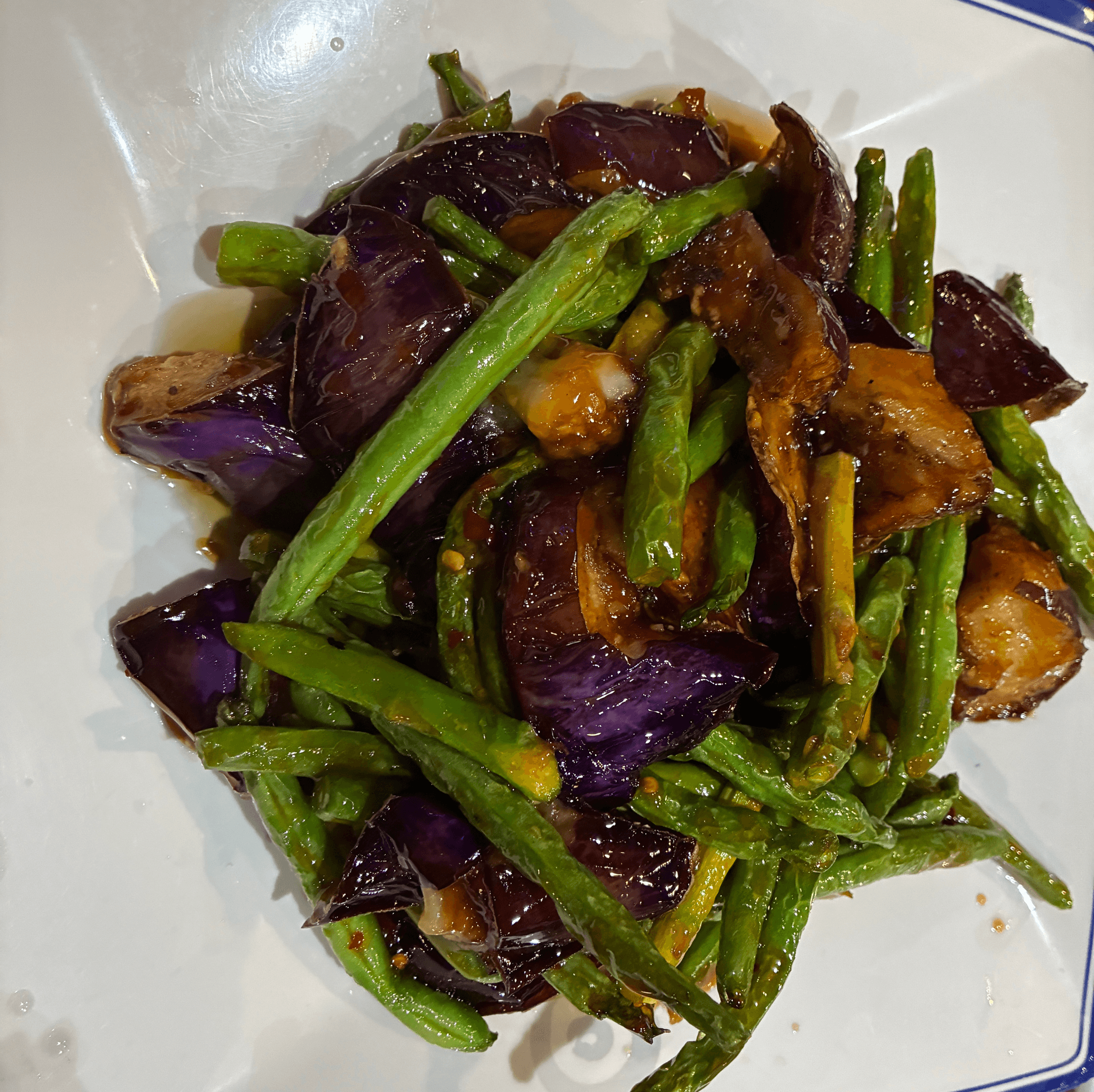 String beans, asparagus, and eggplant. Served with white rice. Spicy