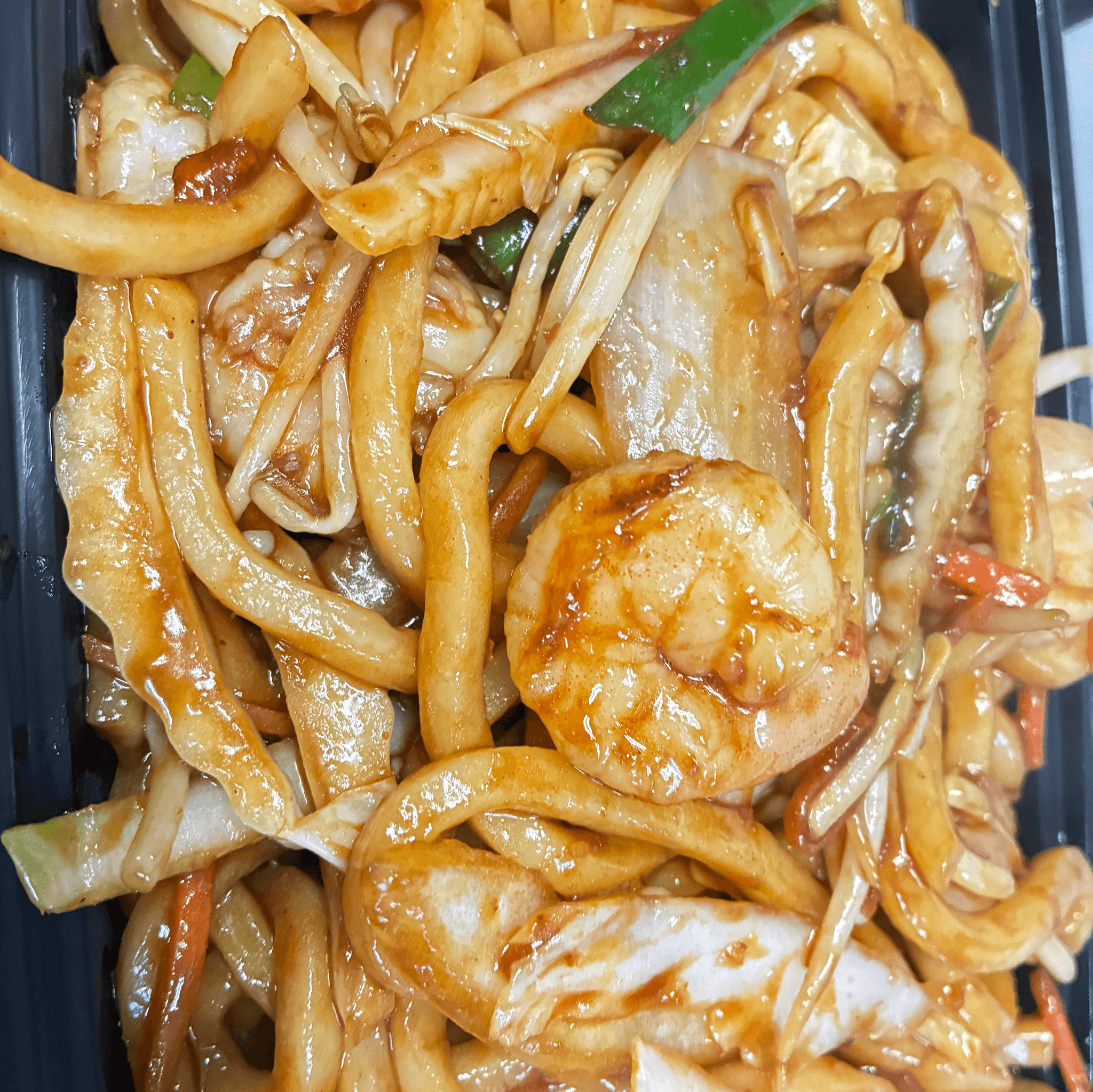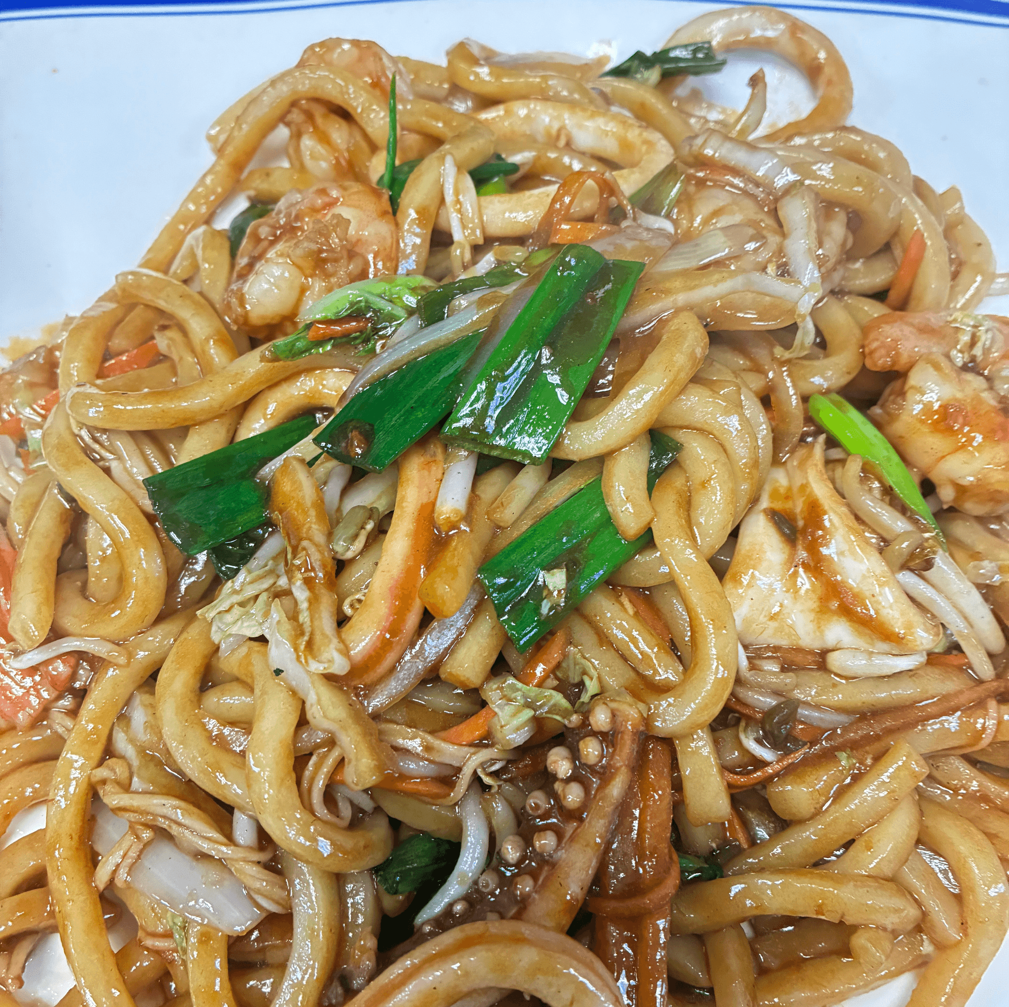 Japanese thick noodles with squid, shrimp, and crabmeat