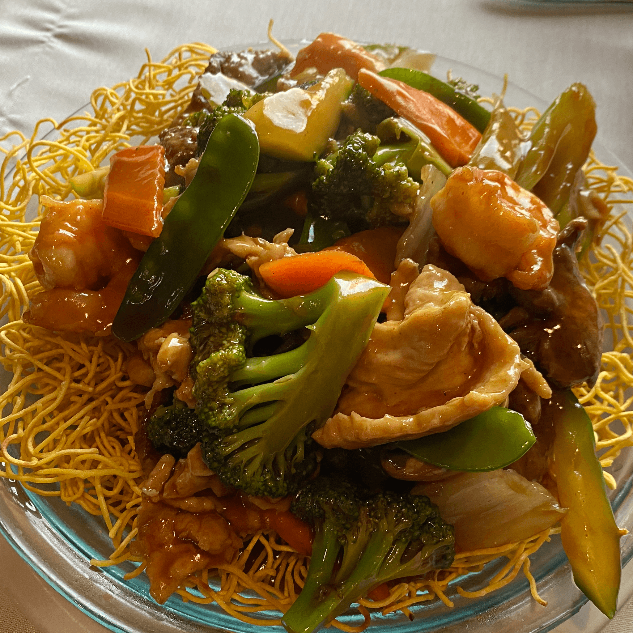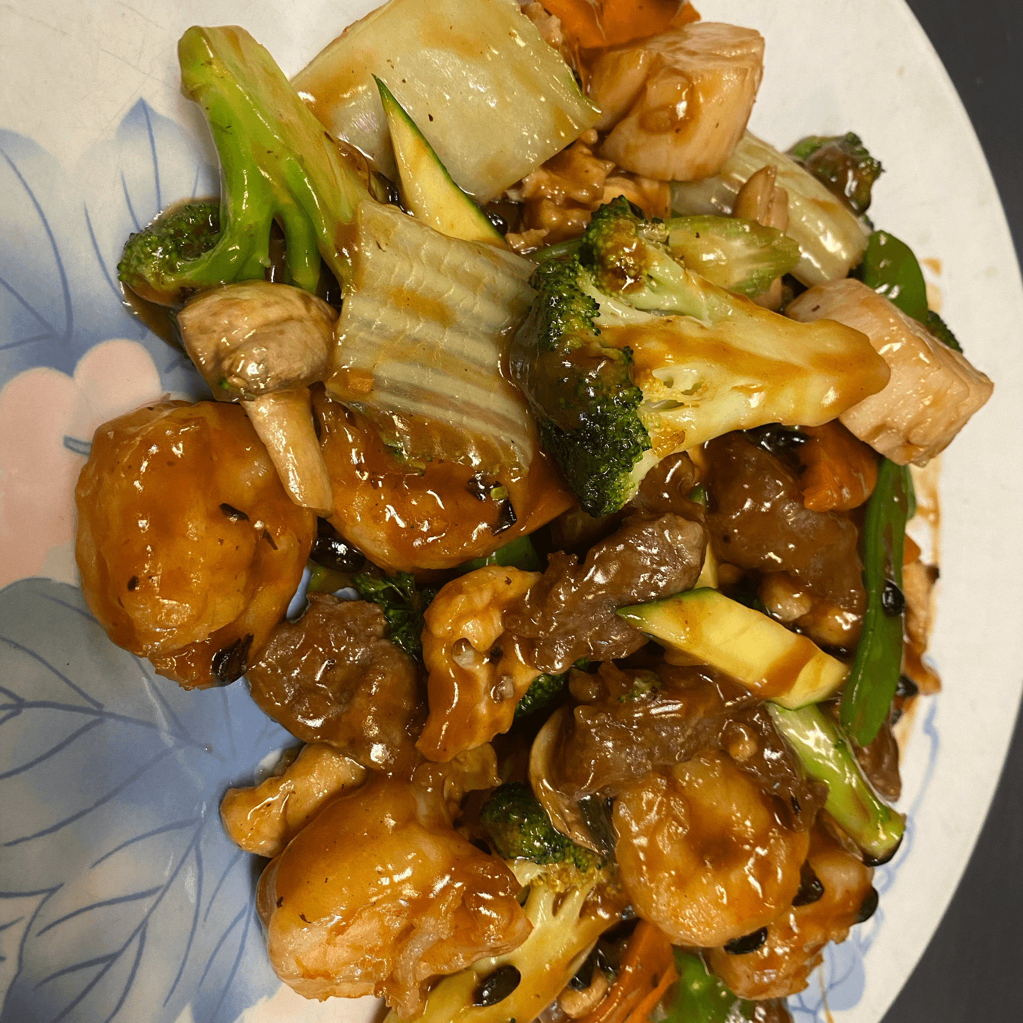 Shrimp, beef, chicken, veggies with house special brown sauce