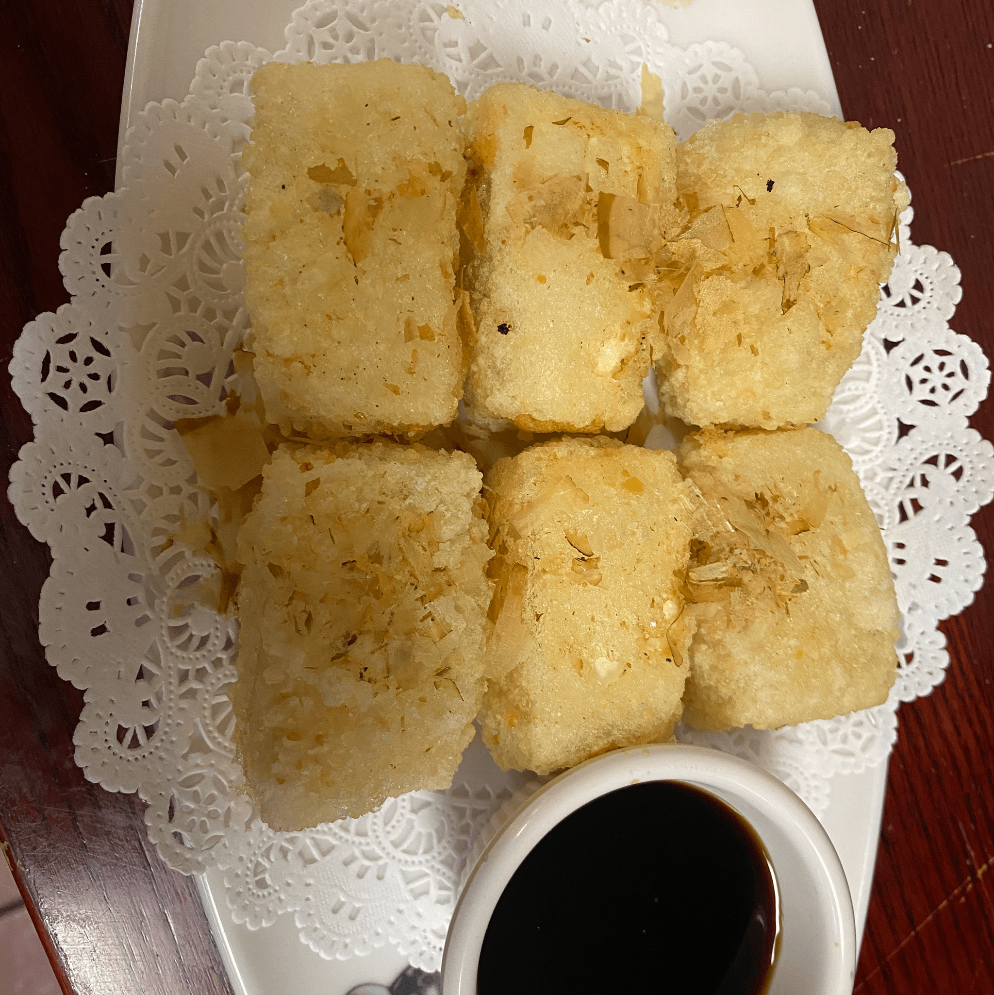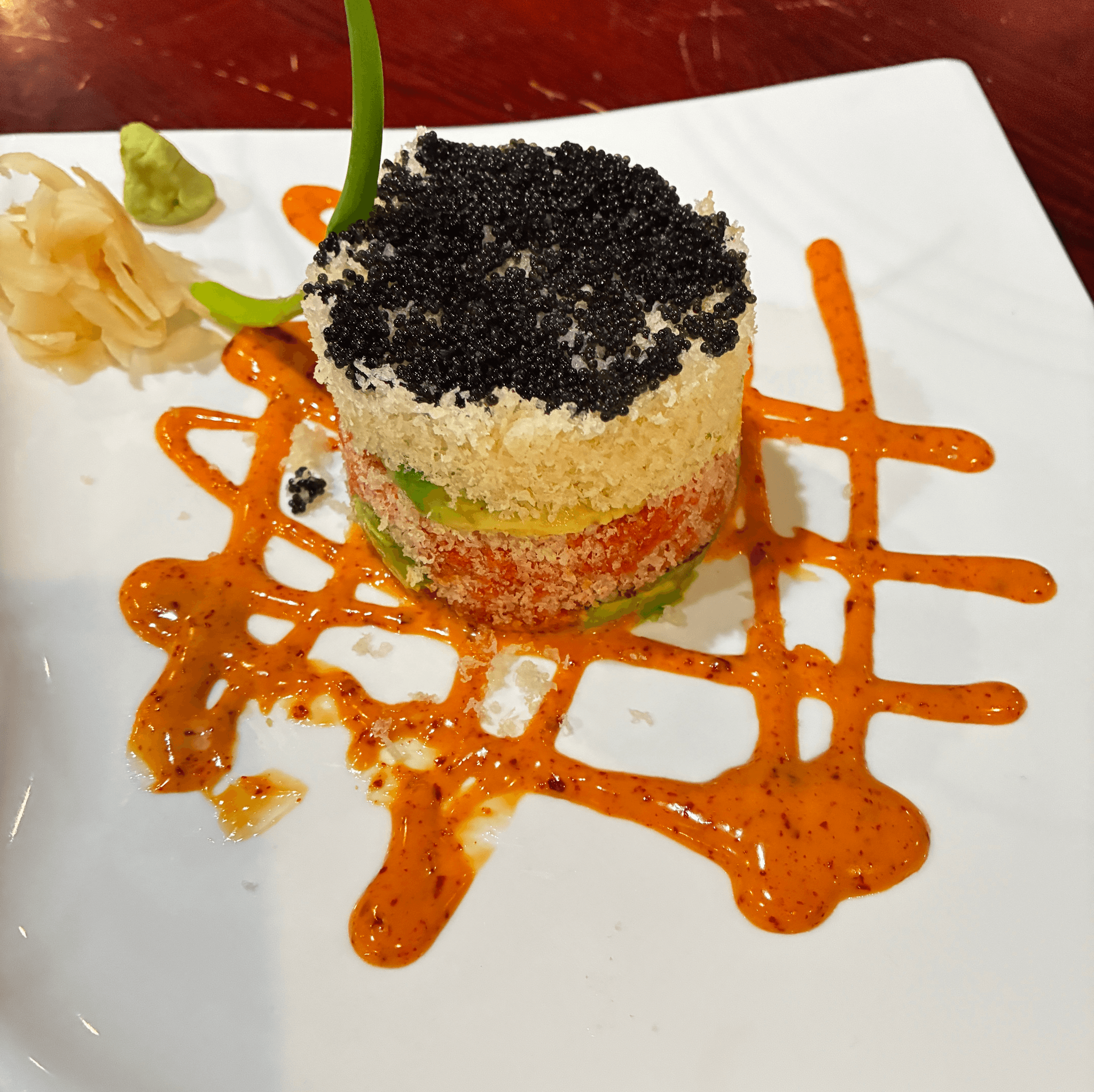 Pan fried Japanese pancake topped with spicy tuna, avocado, spicy mayo and tobiko. Spicy