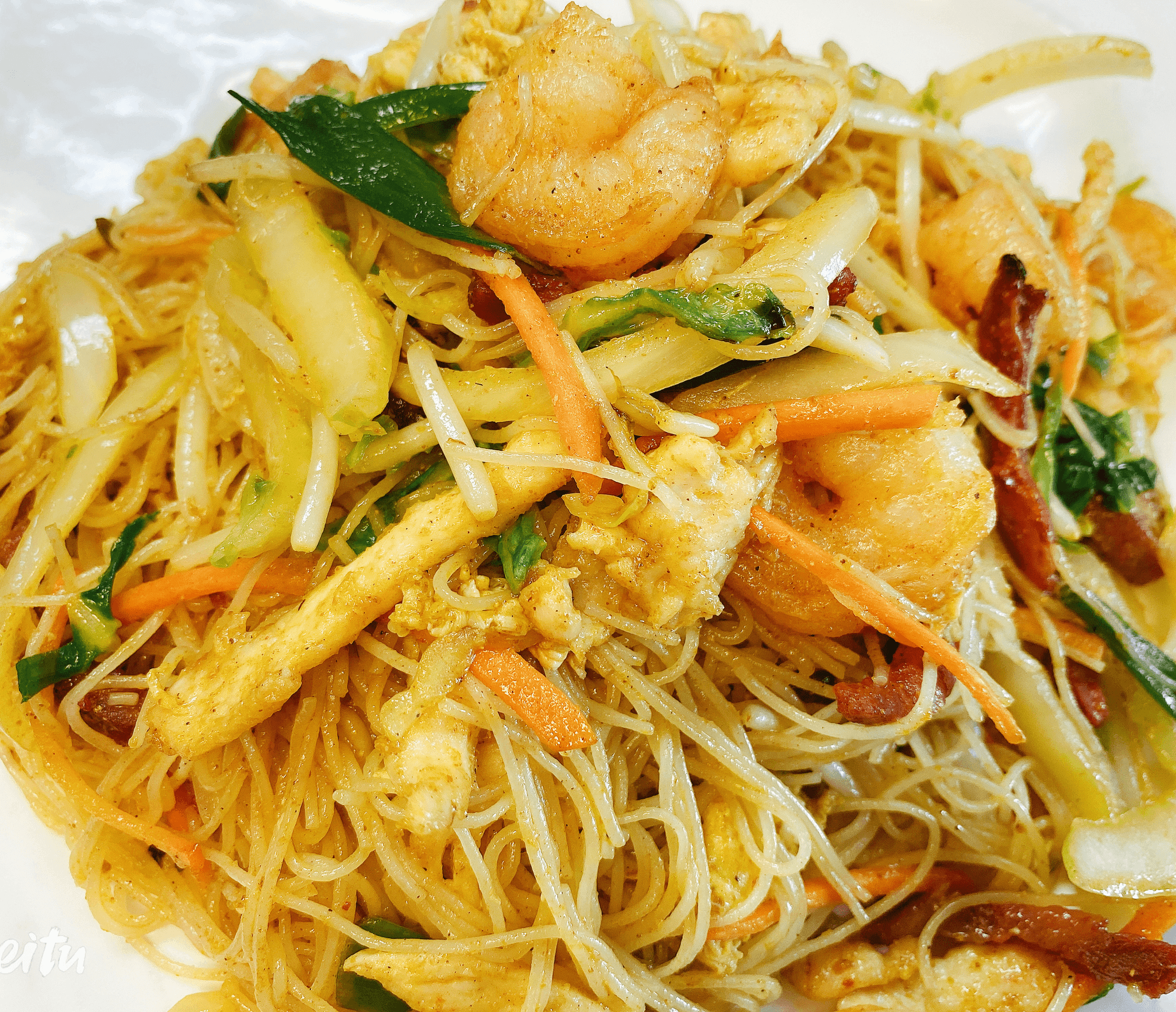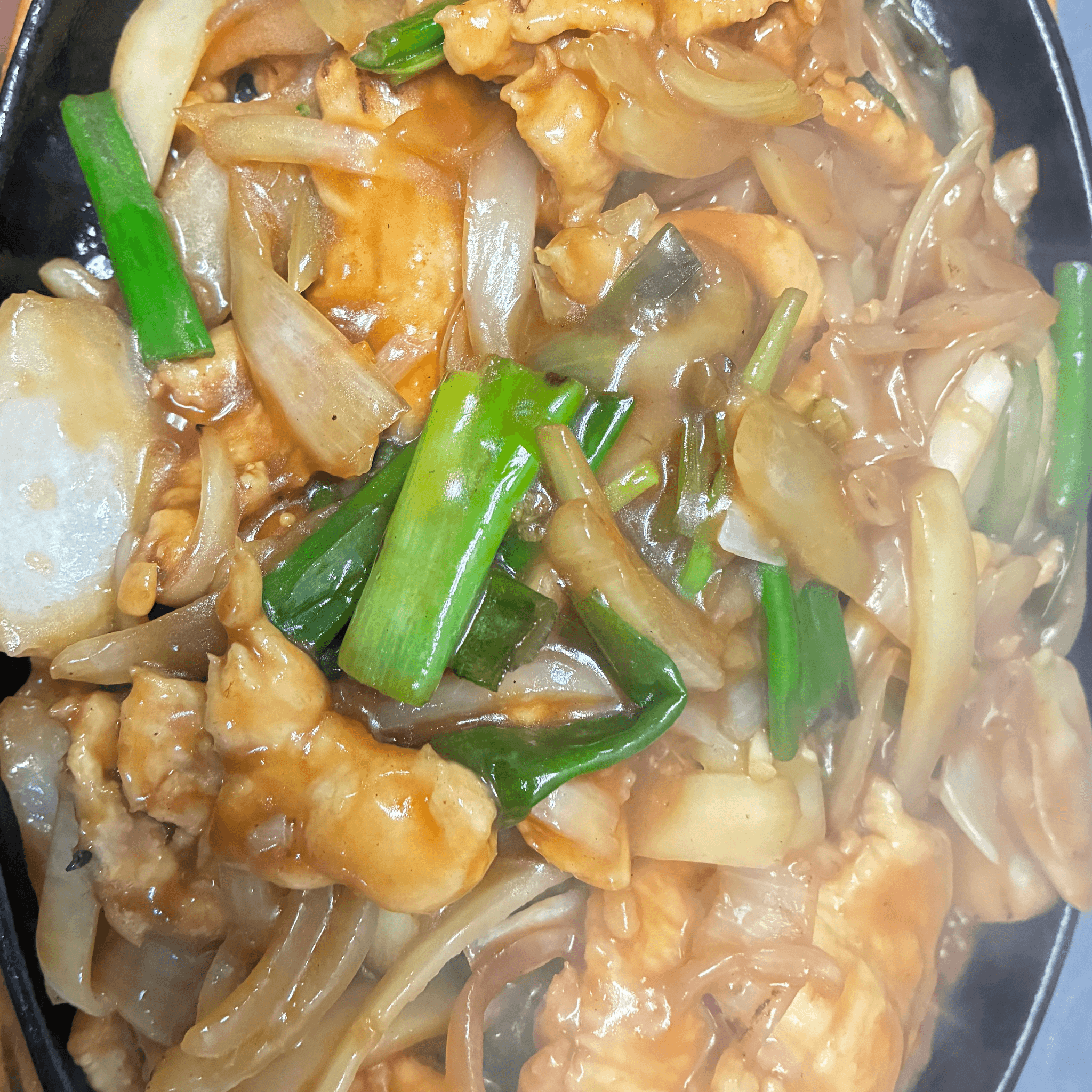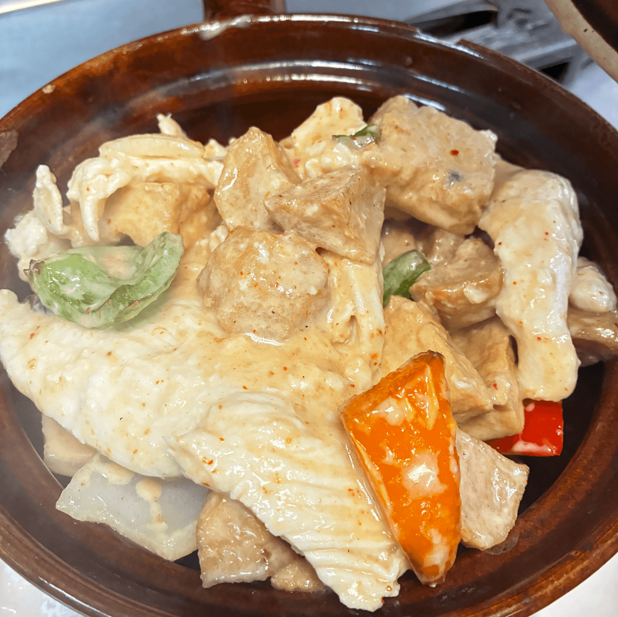 Chicken, pork, and shrimp with curry sauce. Spicy