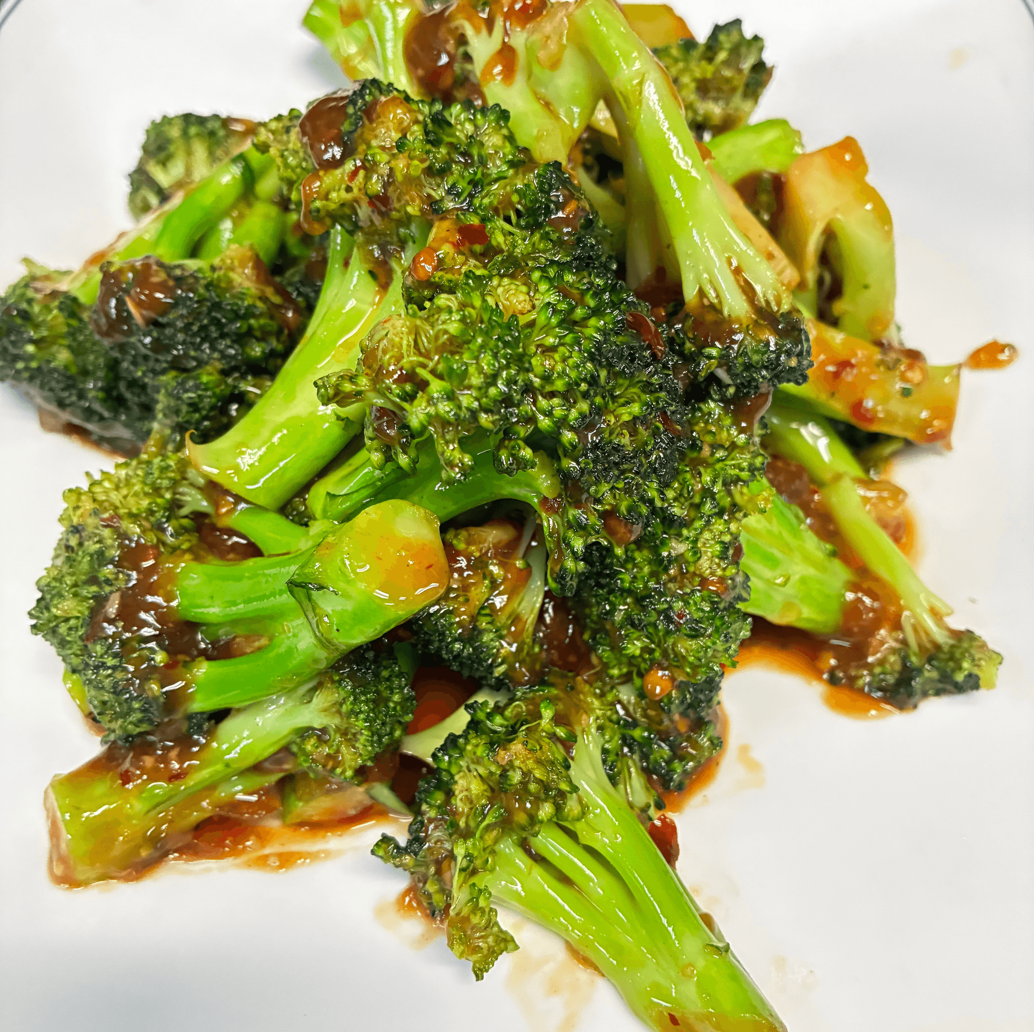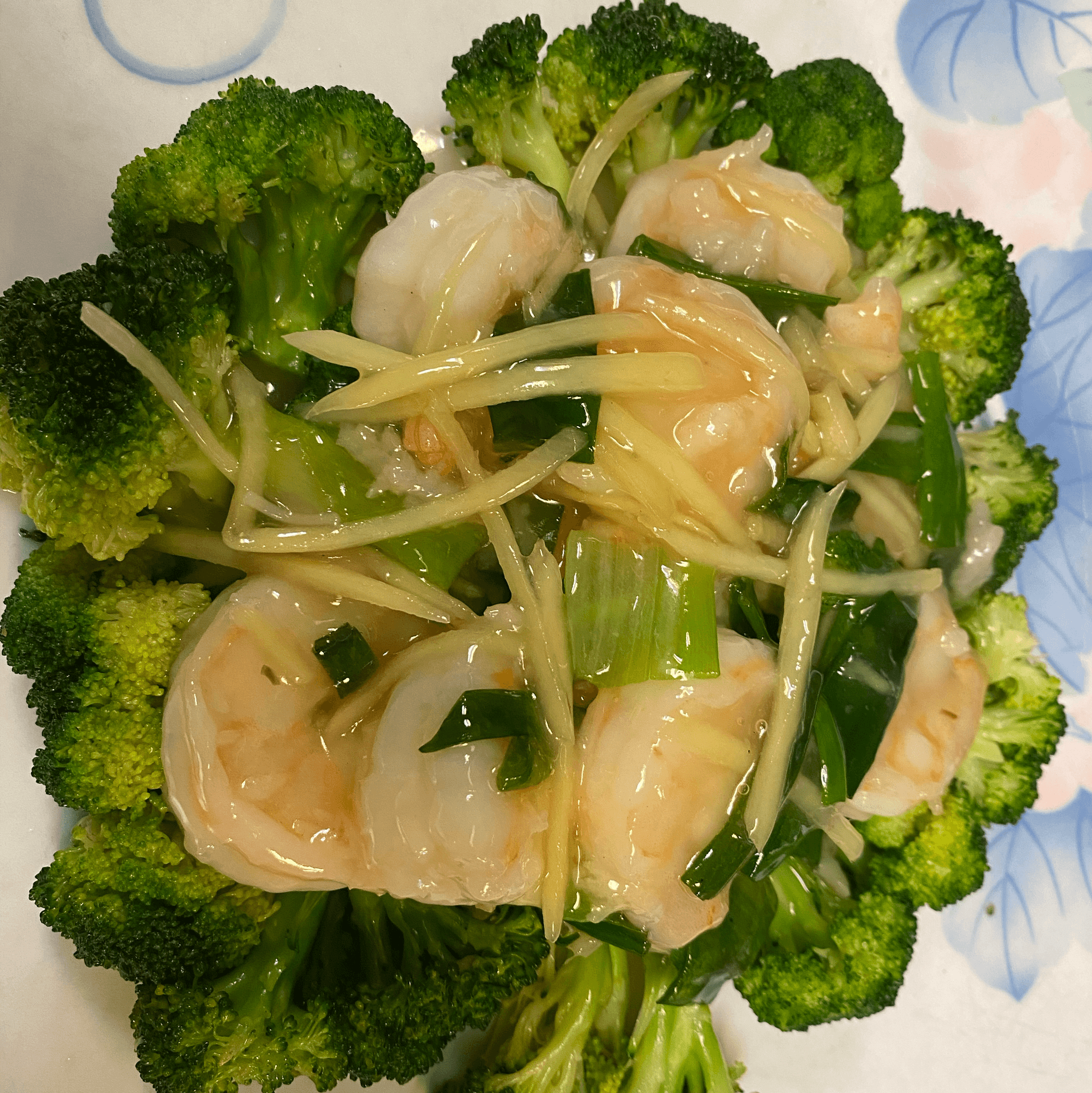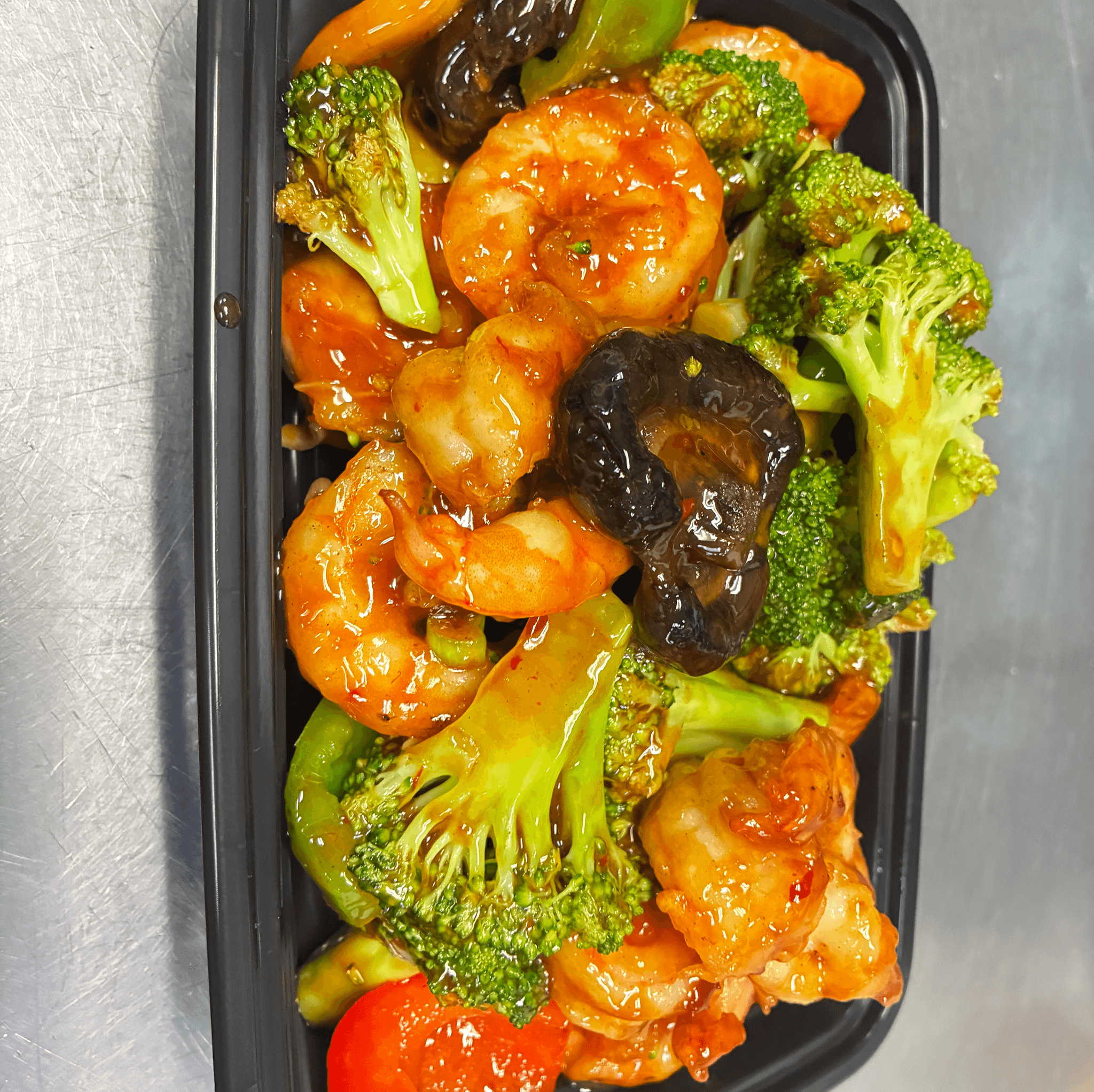Jumbo shrimp with broccoli in brown sauce. Served with white rice