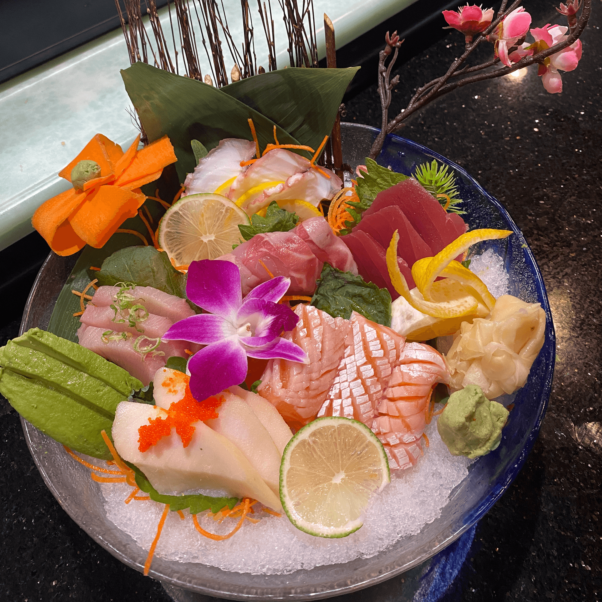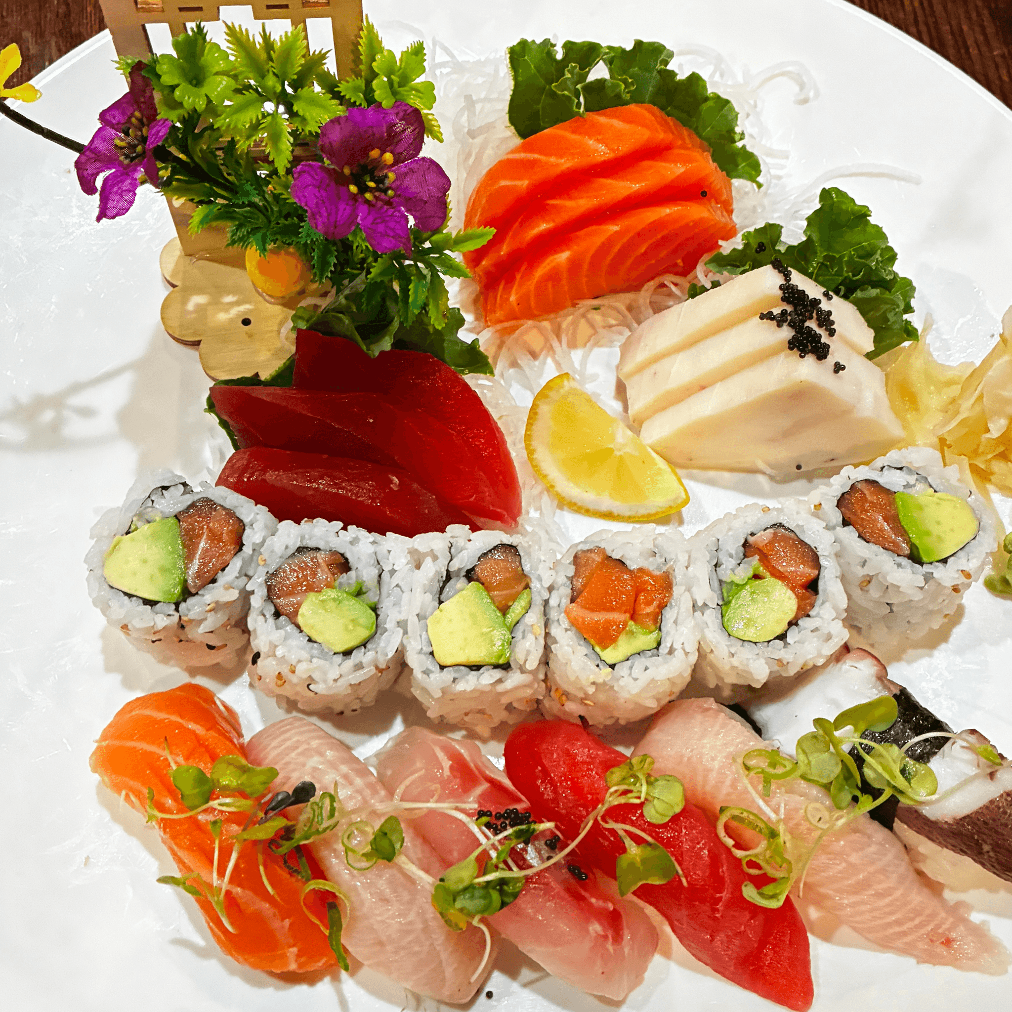 chef's choice four pieces of sushi, six pieces of sashimi and one salmon avocado roll