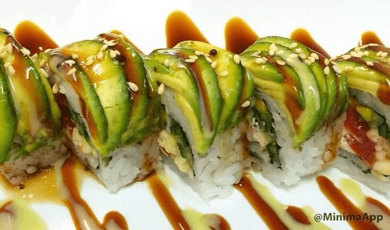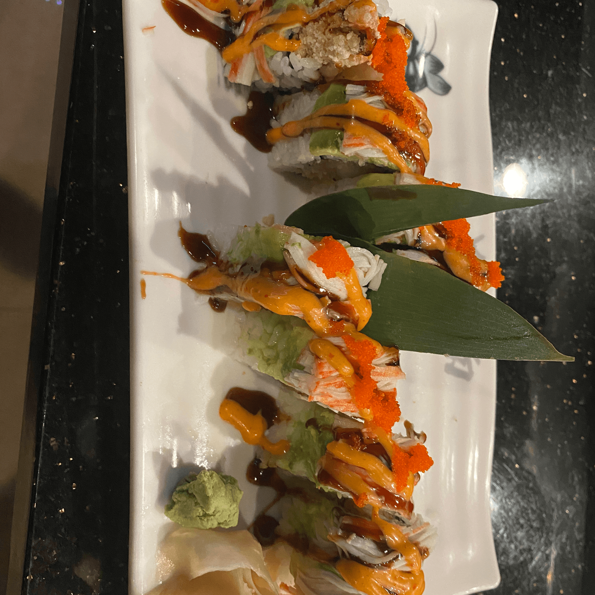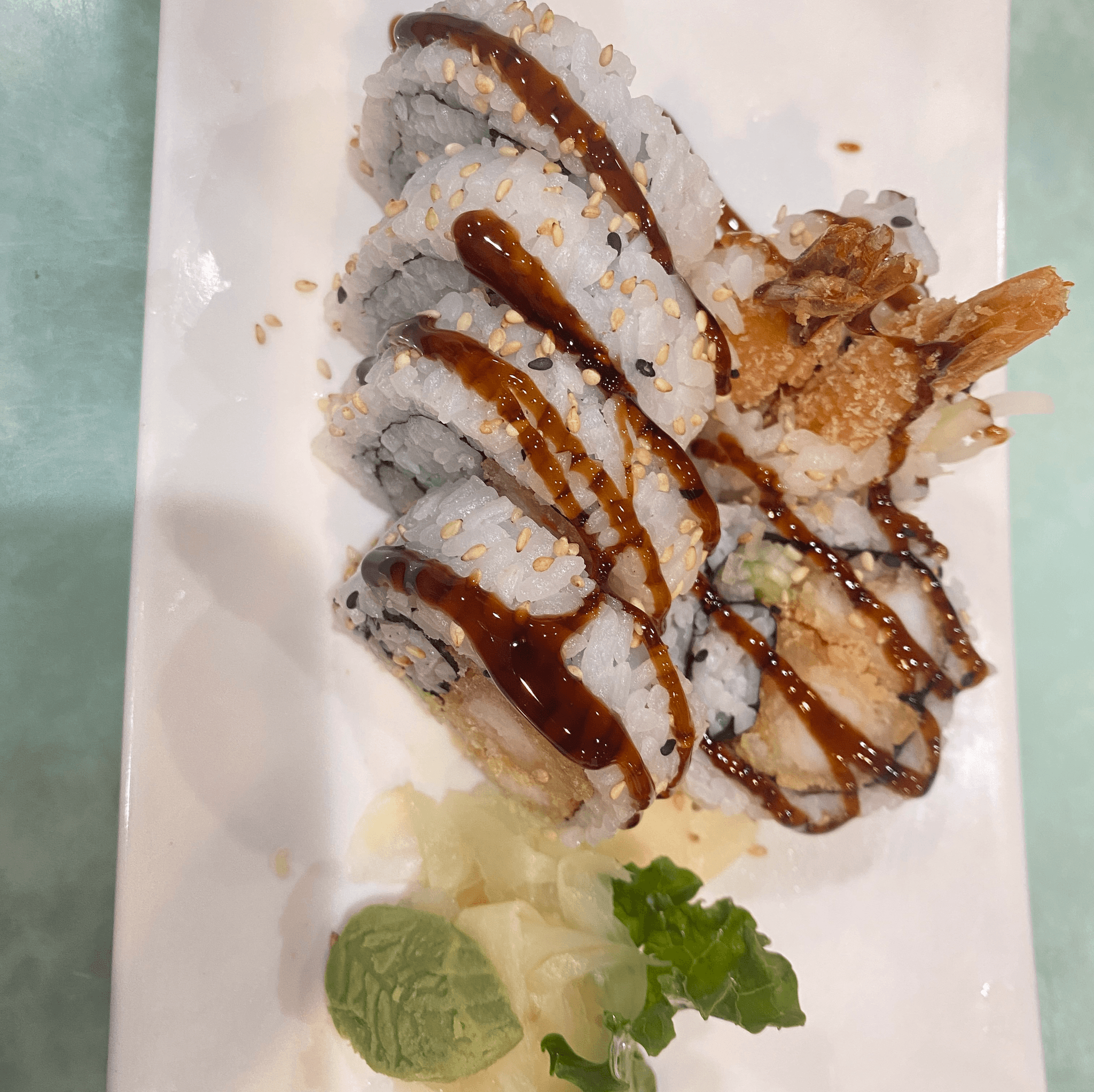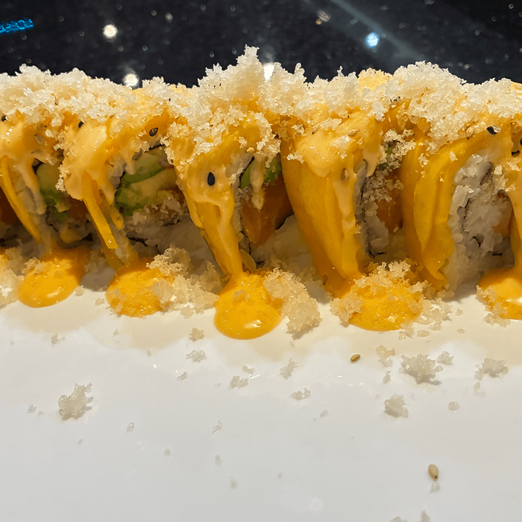 Crabmeat, avocado, cucumber inside topped with shrimp tempura mango sauce, eel sauce