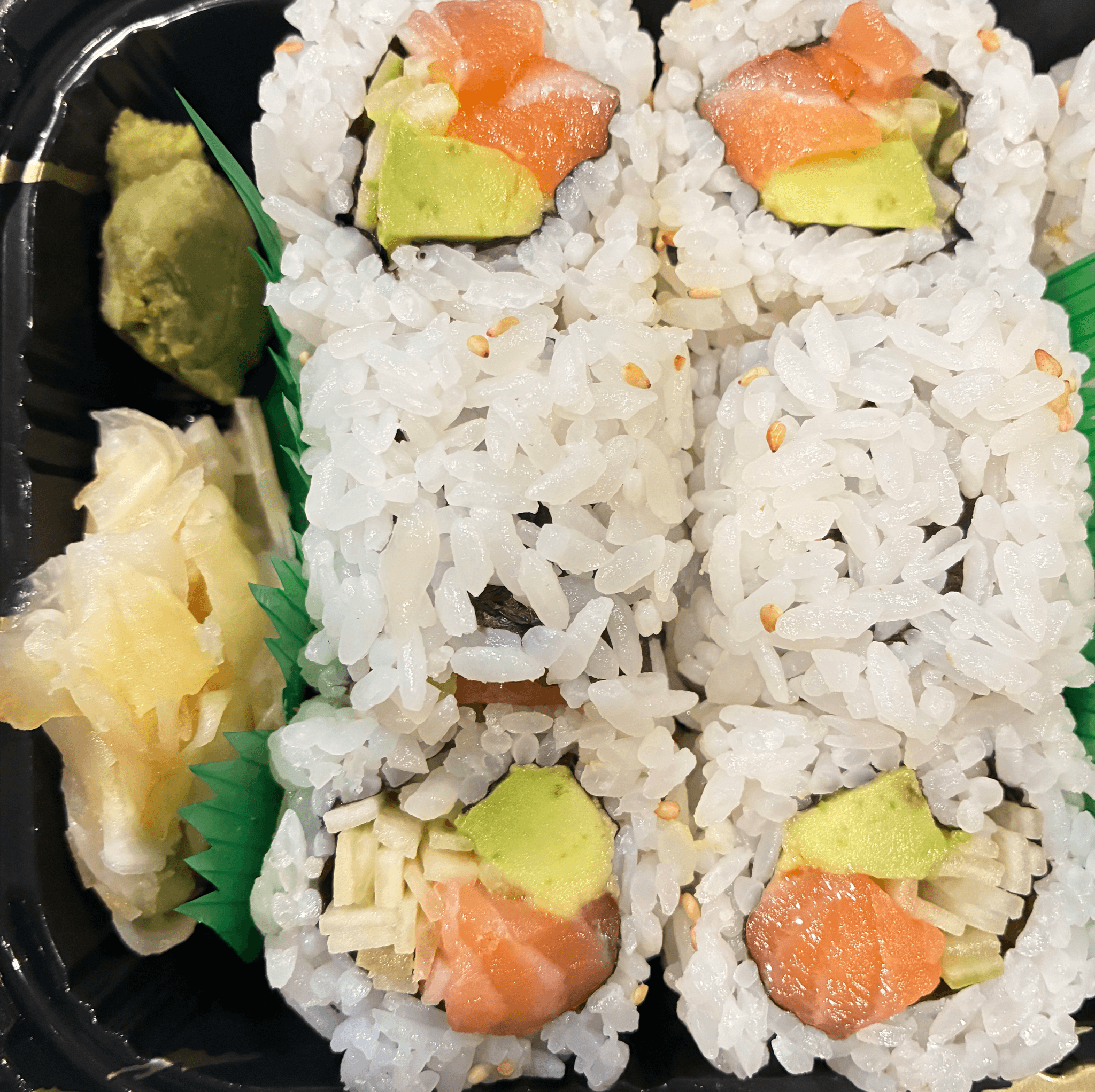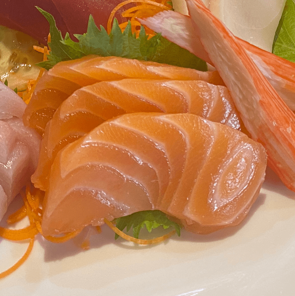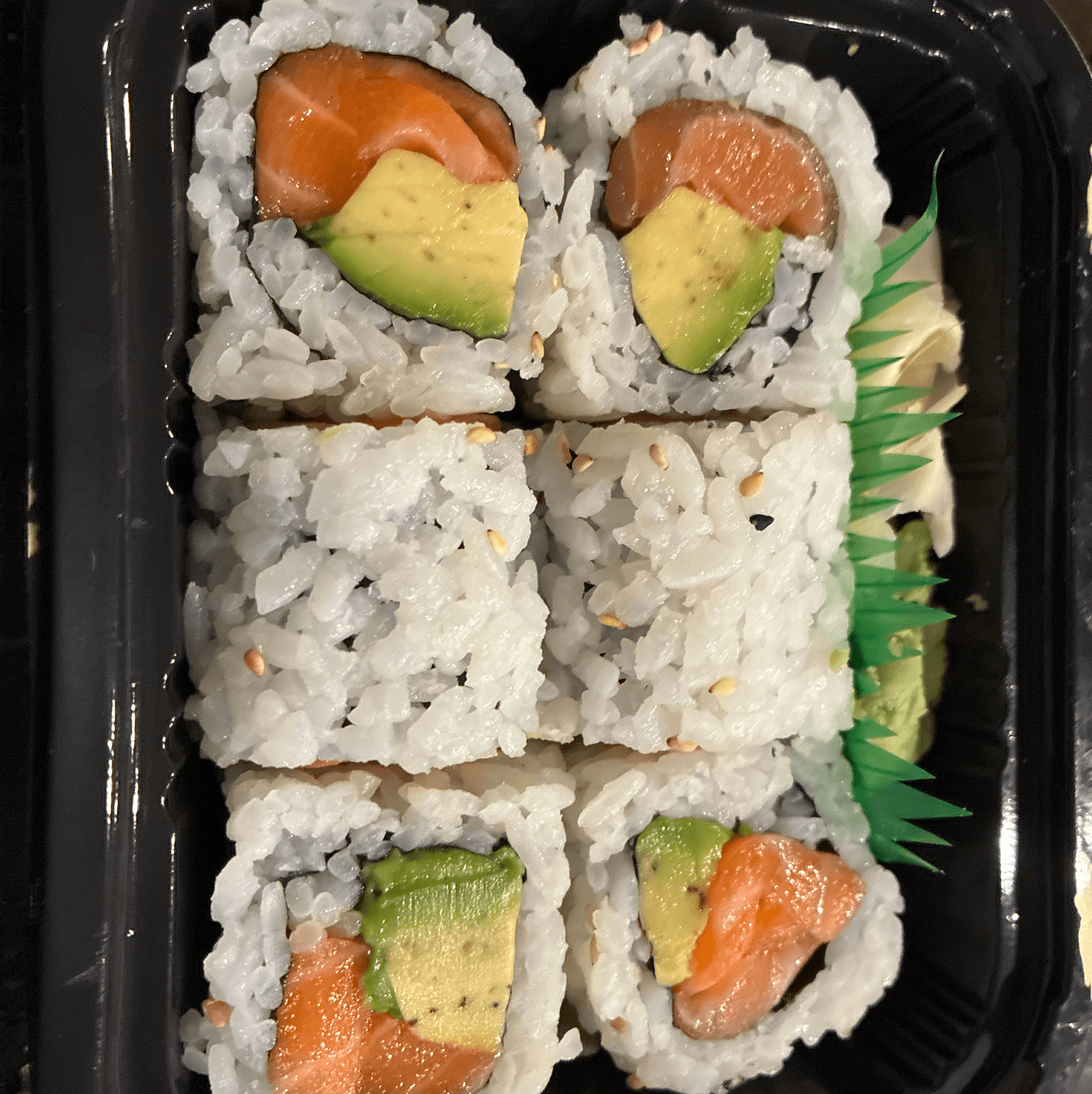6 pieces of sushi, 9 pieces of sashimi and a salmon avocado roll. Served with soup