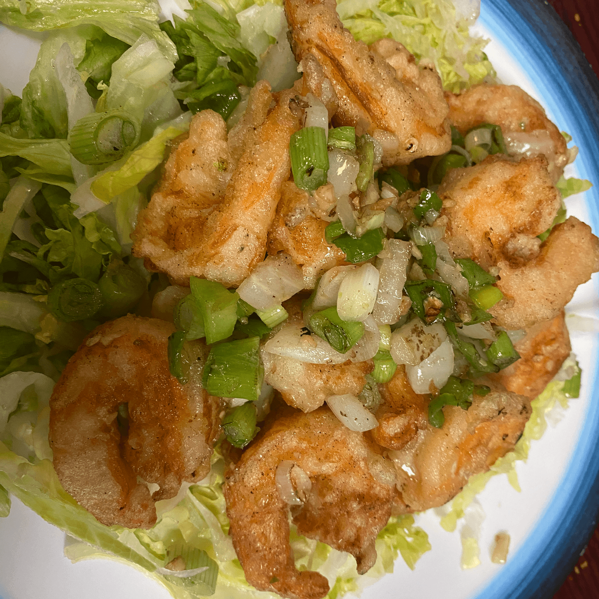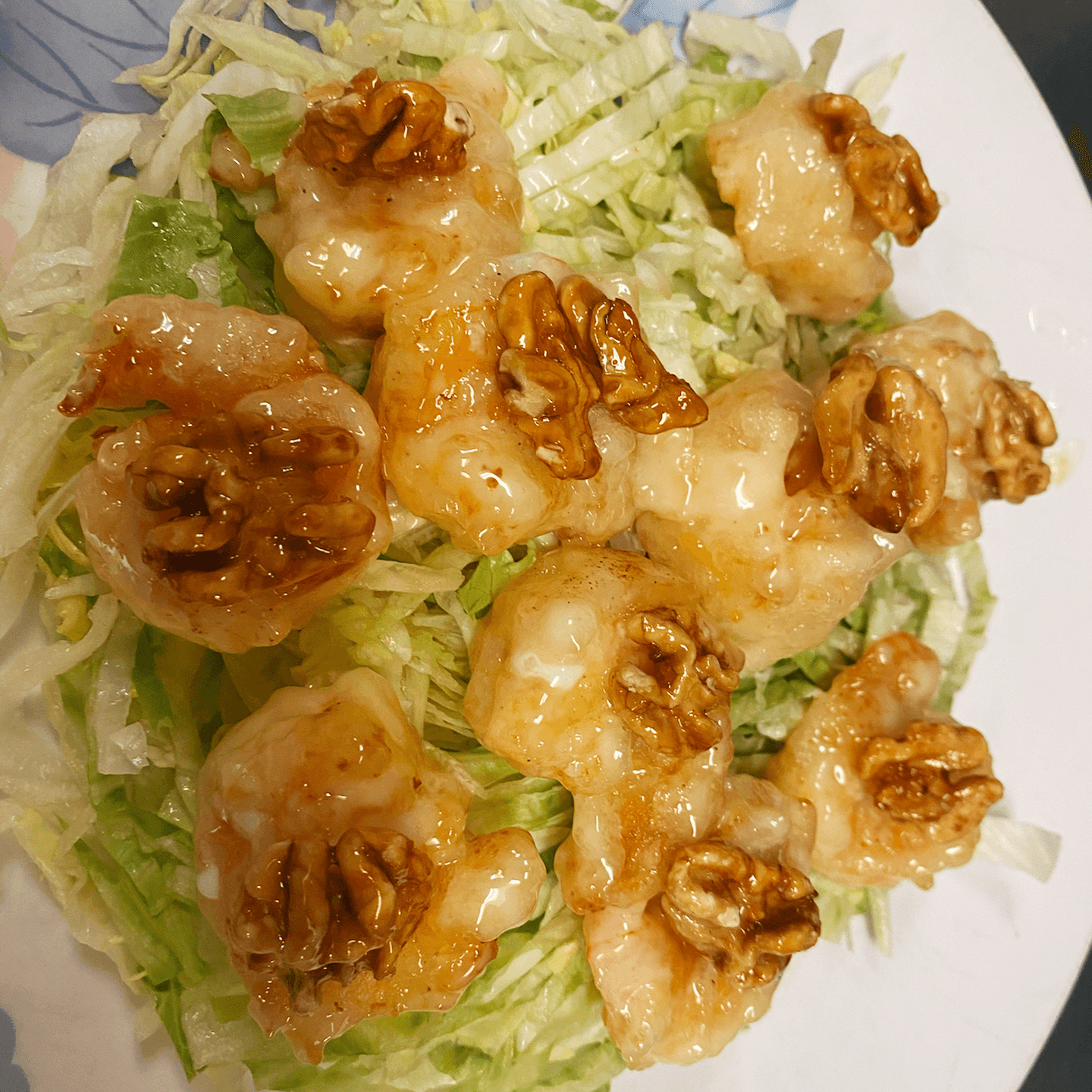 Jumbo shrimp with coconut sauce and walnuts on top. Served with white rice