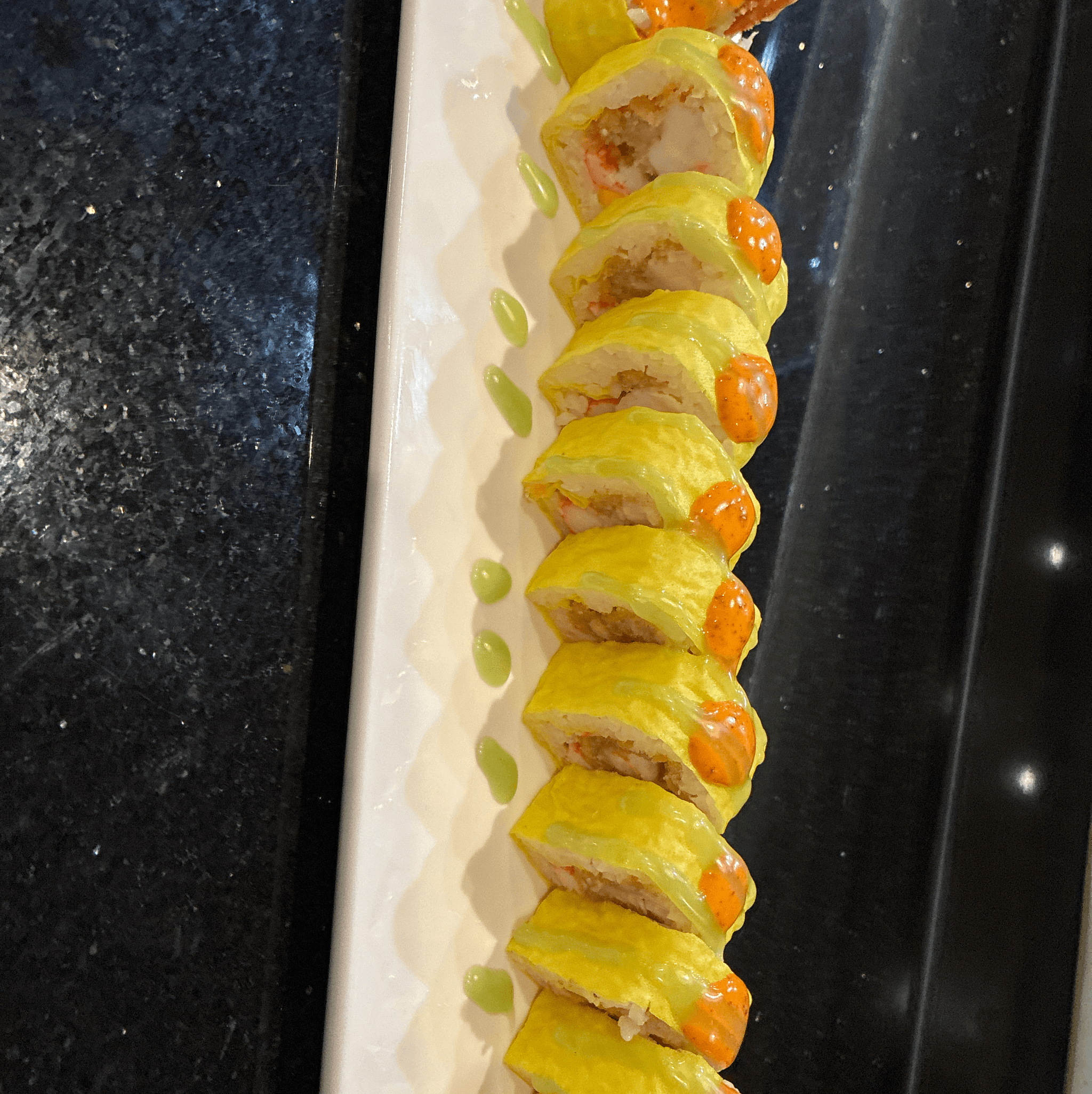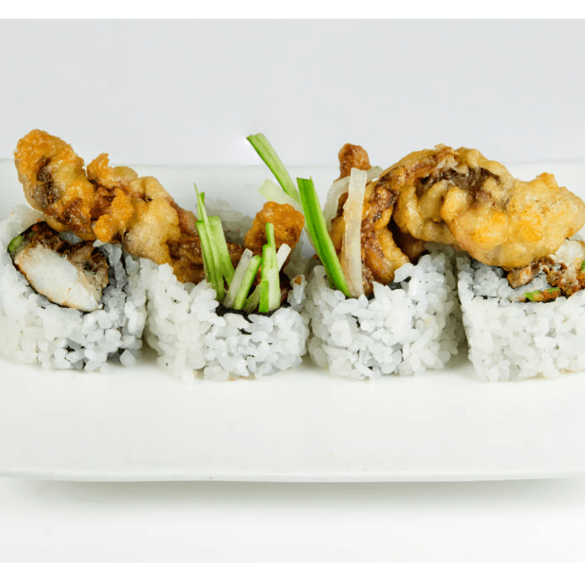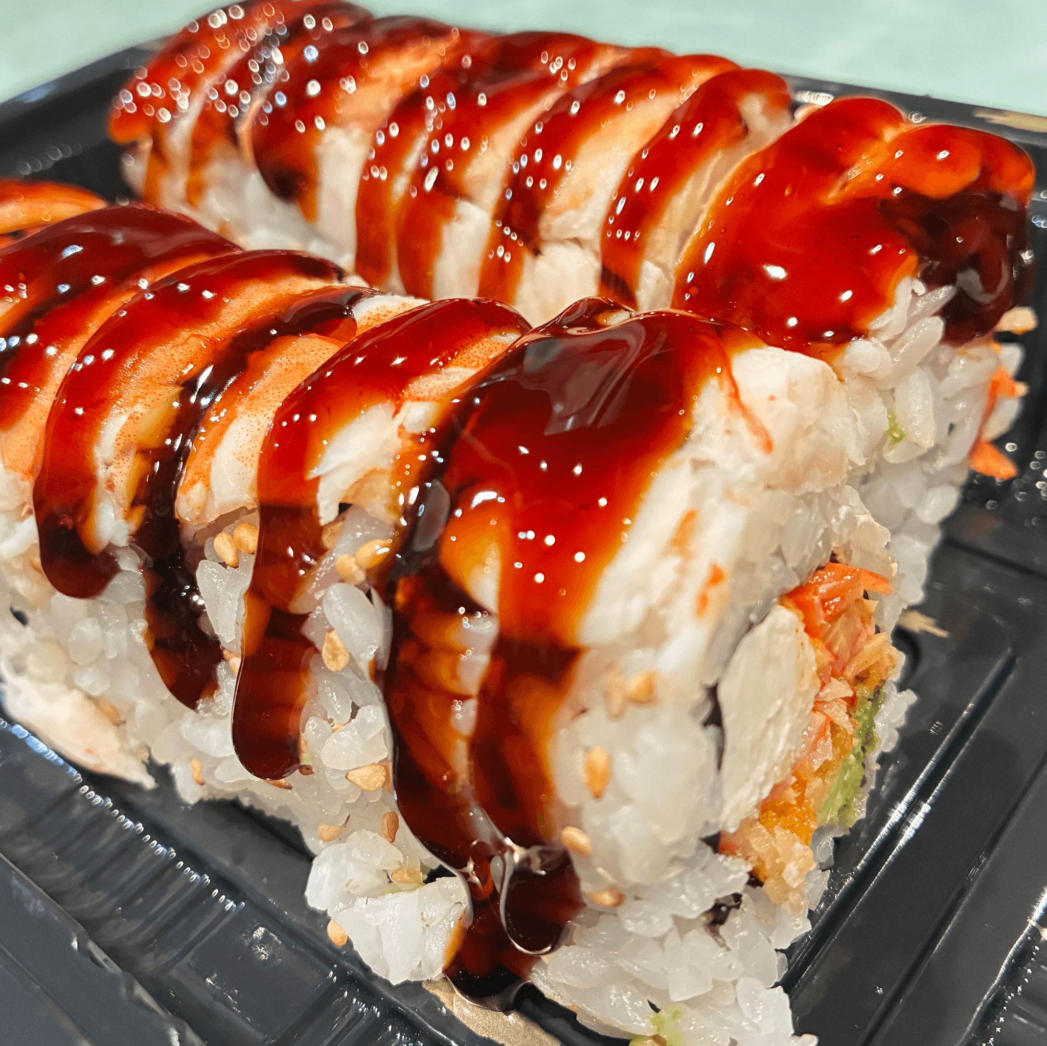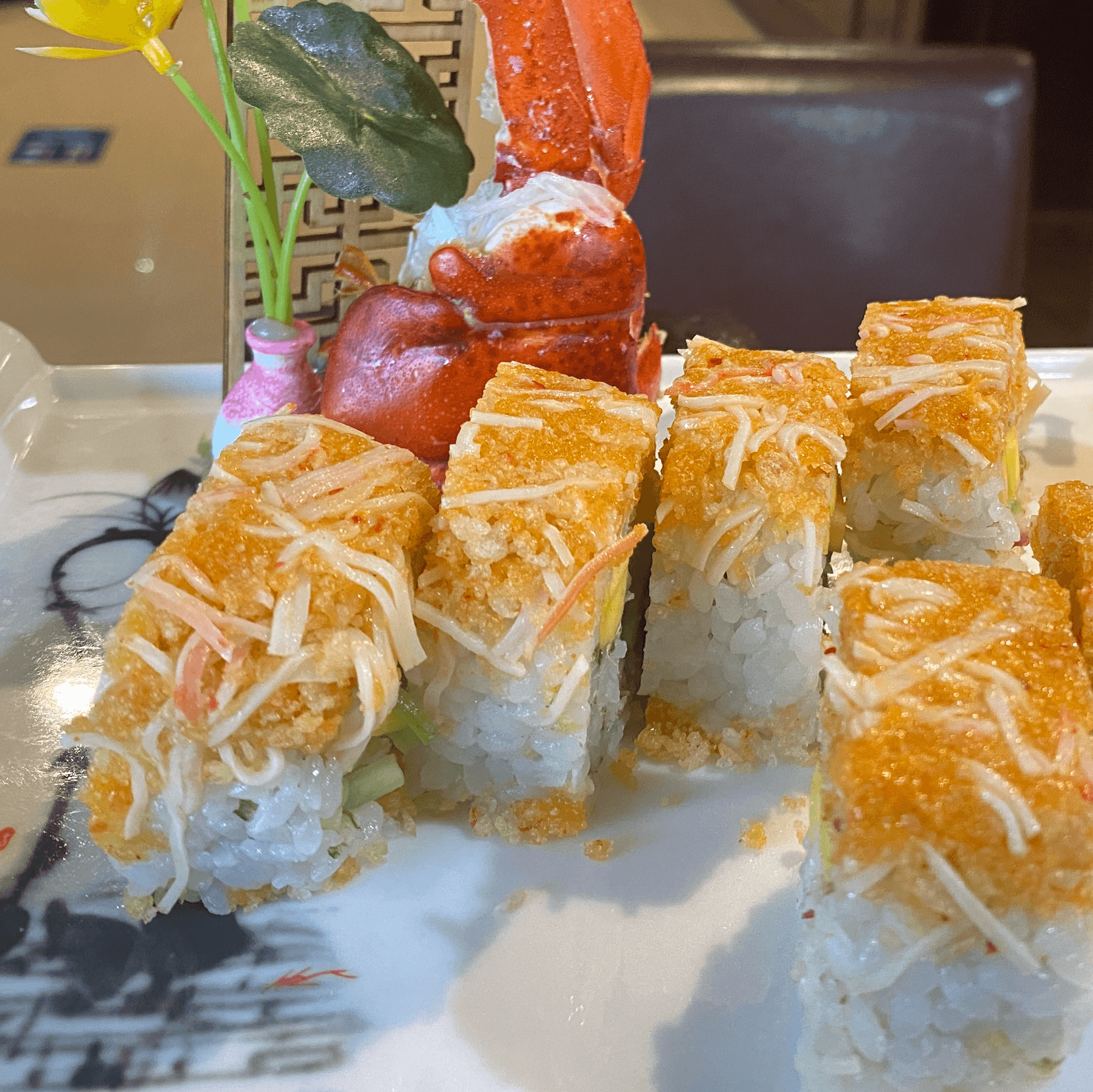 Lobster tempura avocado, cucumber, inside fresh spicy blue crab on top. Organic sushi rice