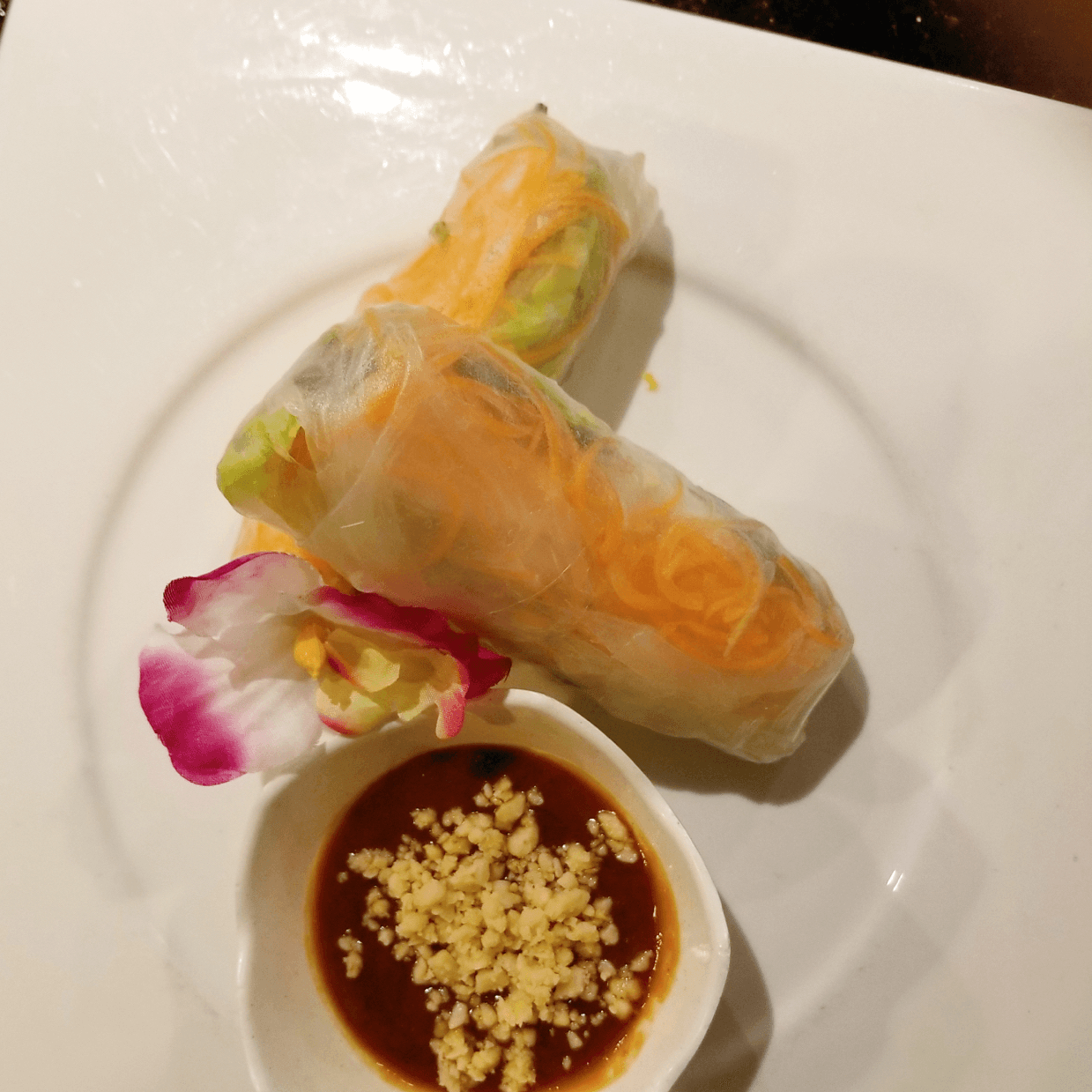Rice paper wrap with rice noodles, basil, cucumber, carrots, and shrimp, served with peanut sauce