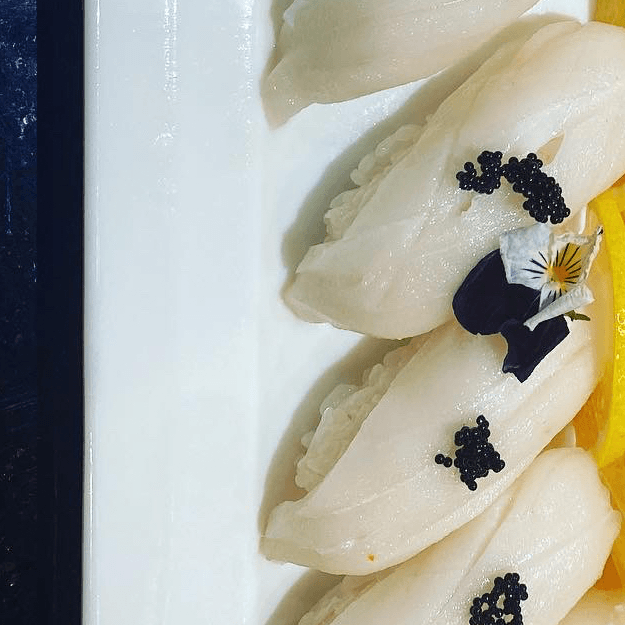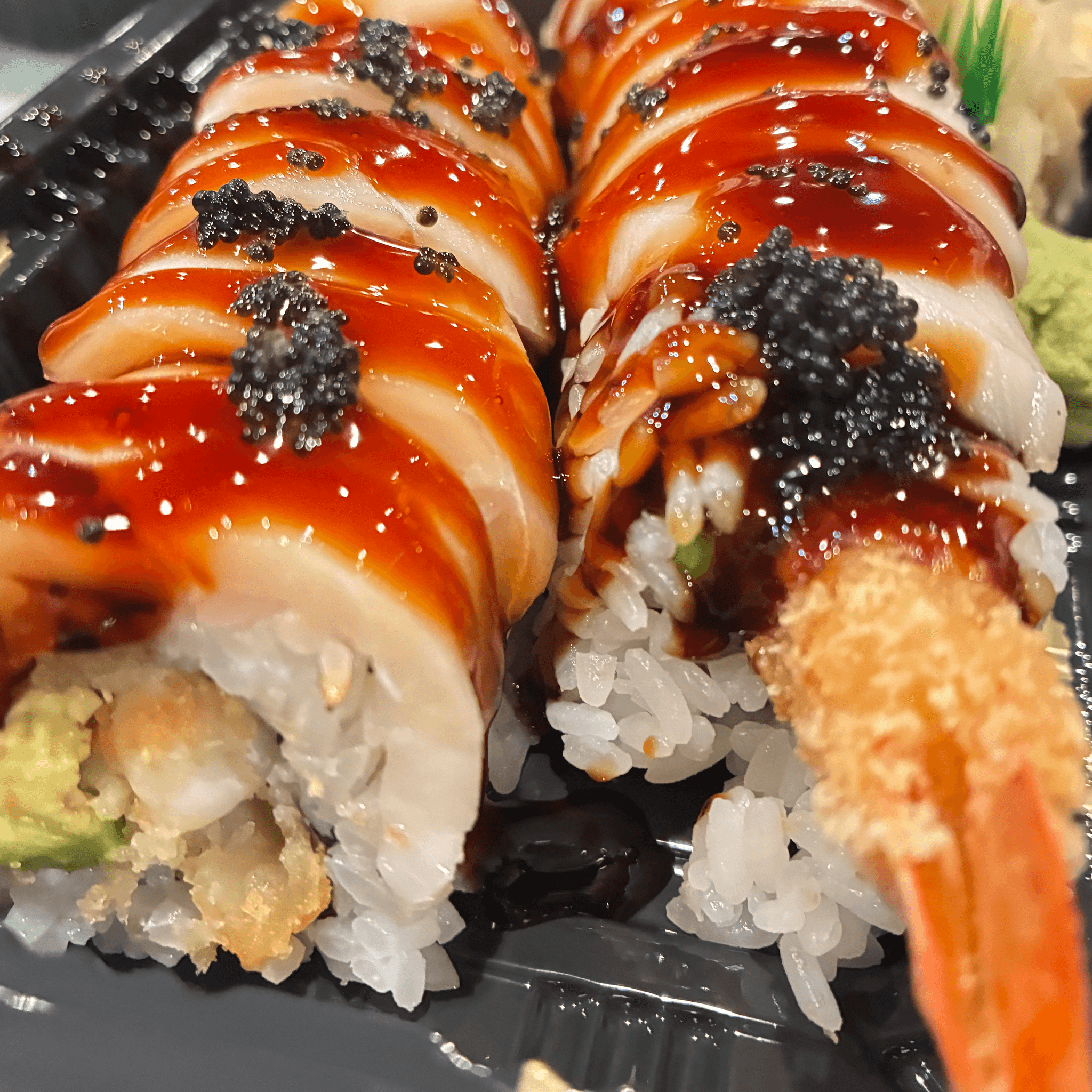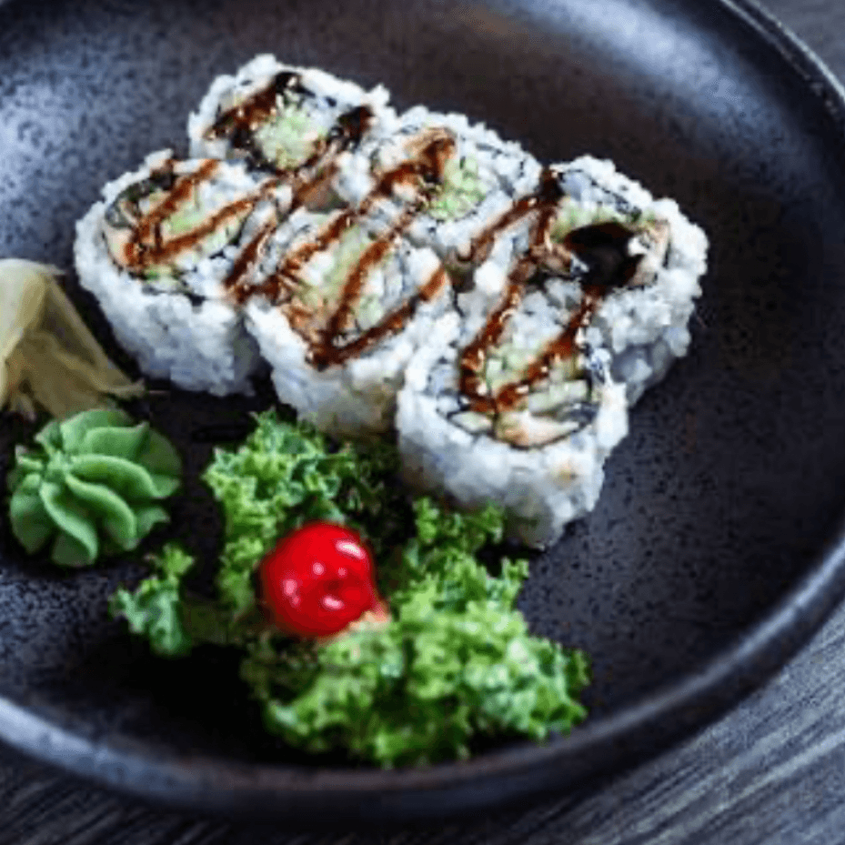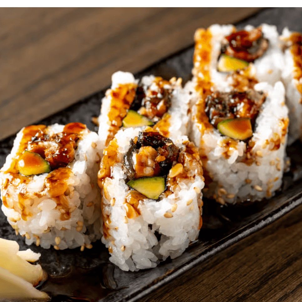 Shrimp tempura inside topped with eel, avocado, eel sauce and black tobiko. Organic sushi rice
