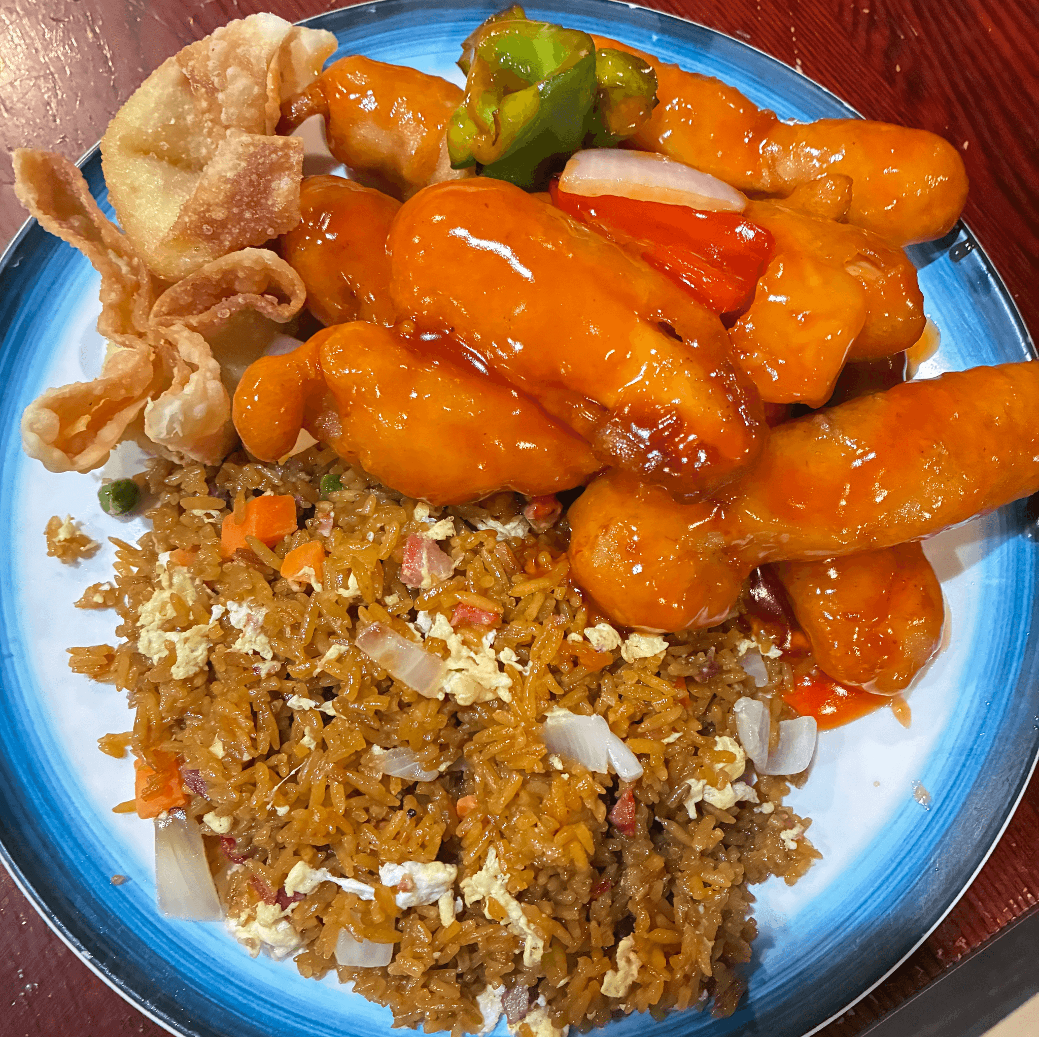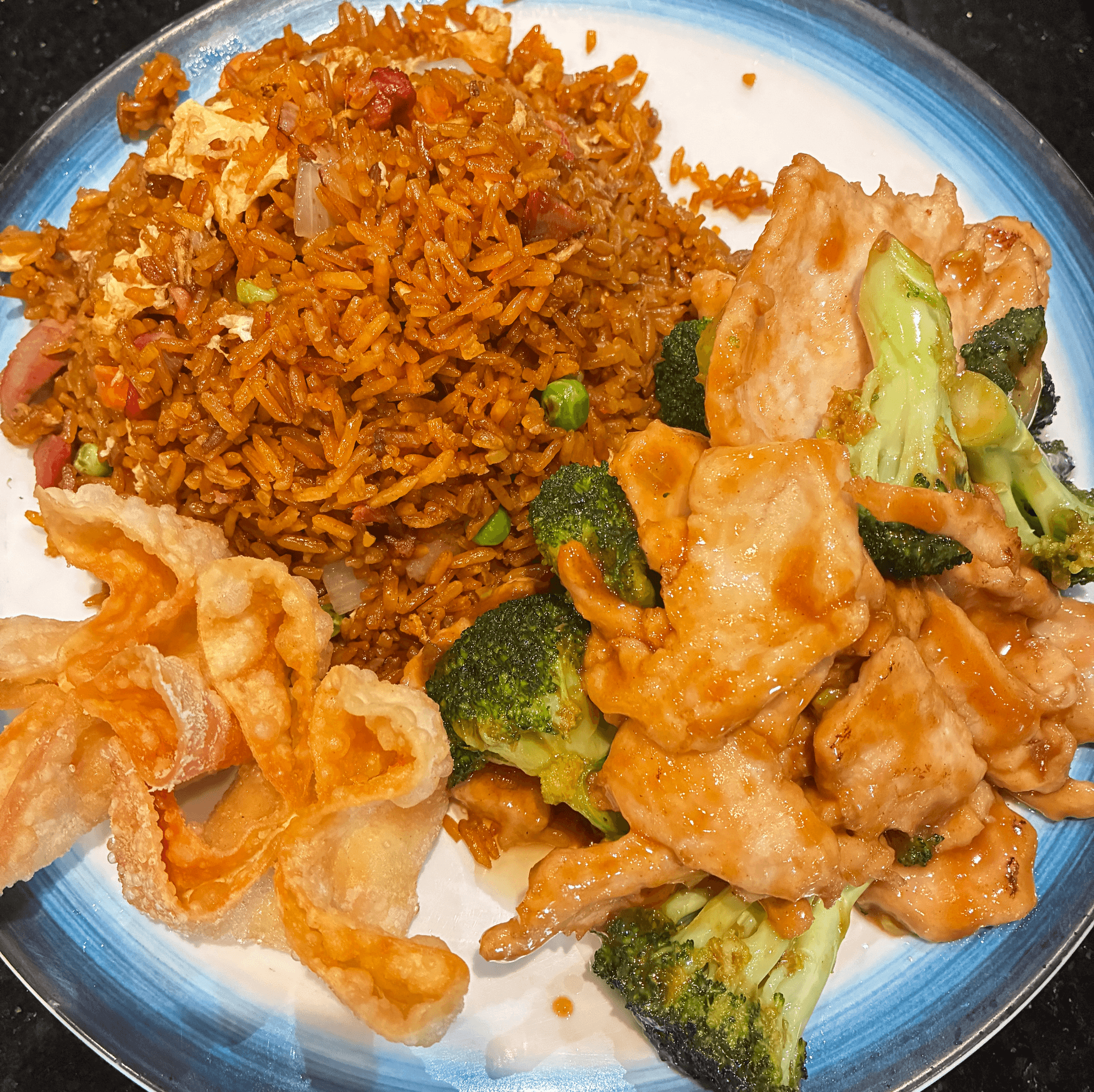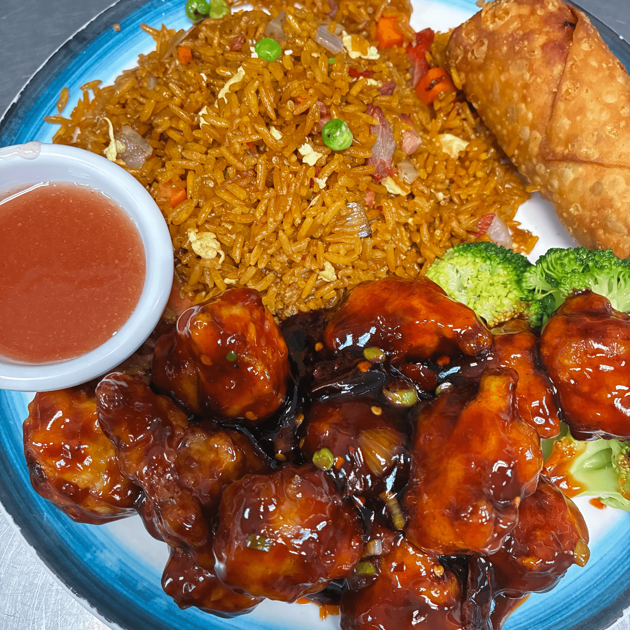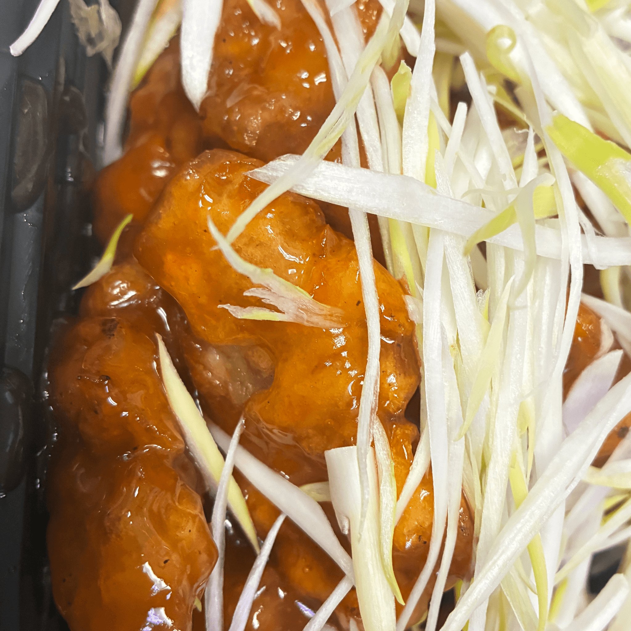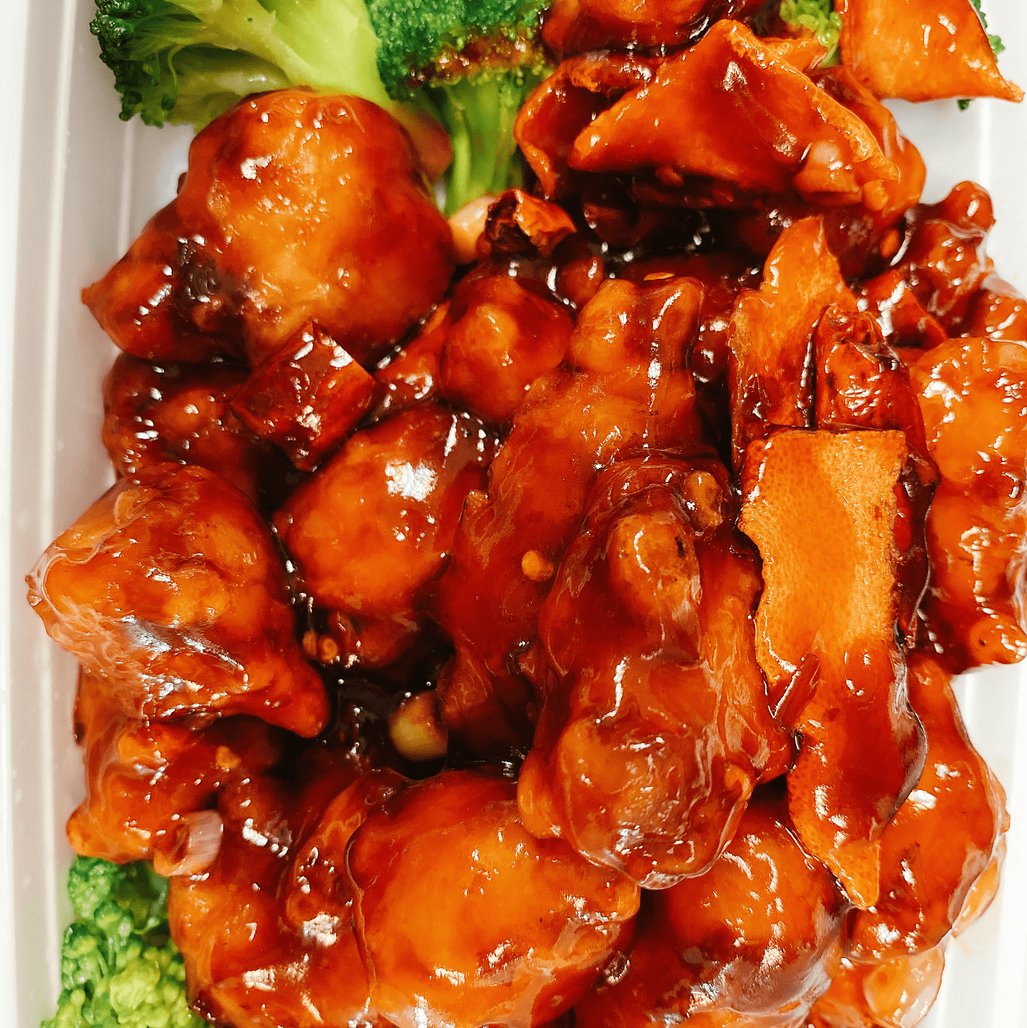 Crispy chicken with orange sauce, served with white rice. Spicy