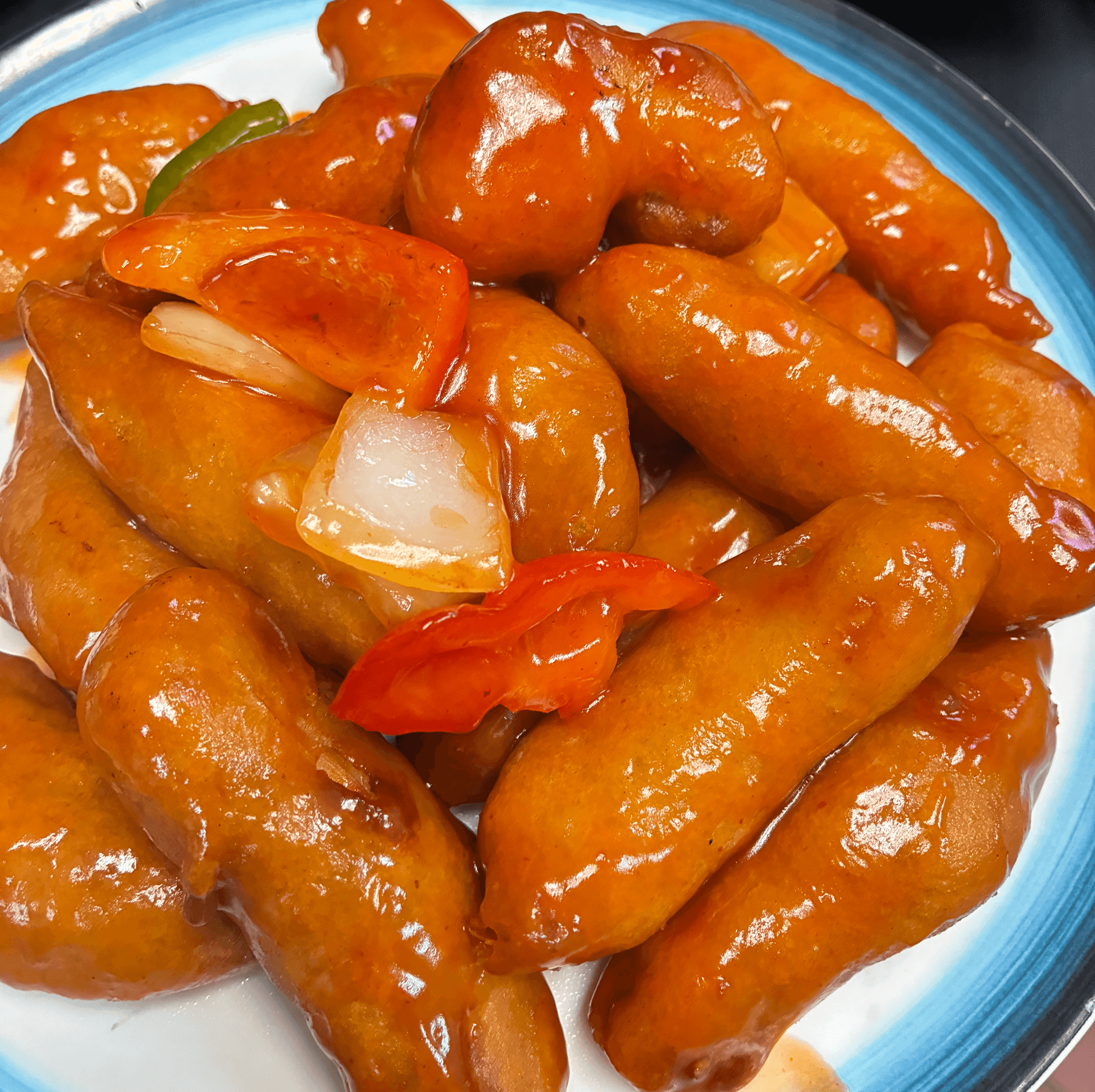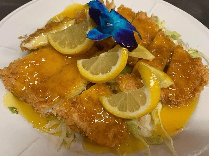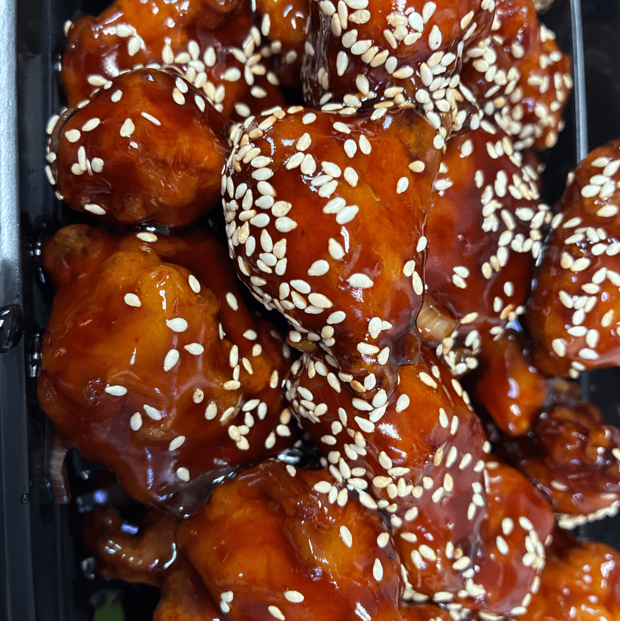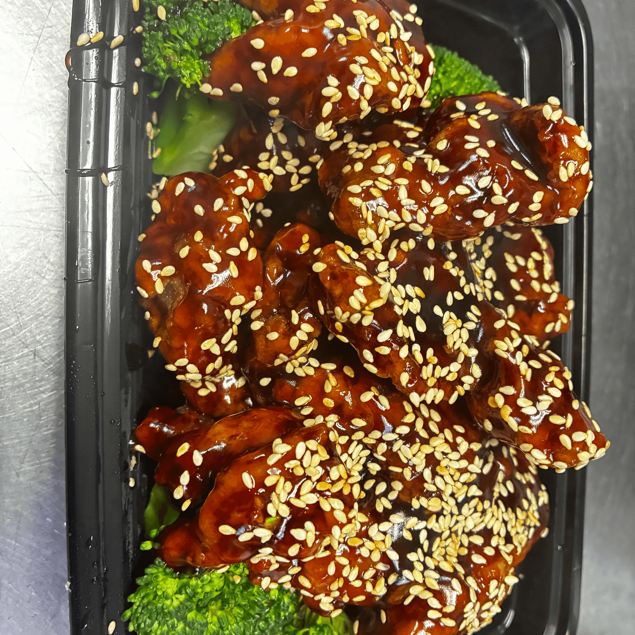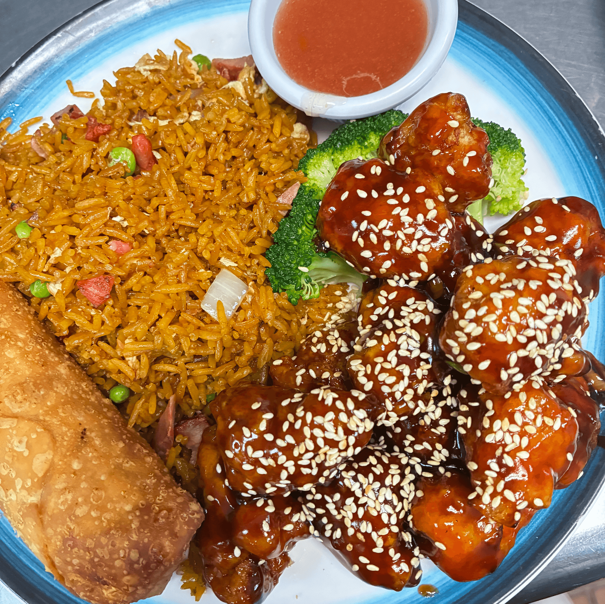 Crispy chicken with orange sauce, served with white rice. Spicy
