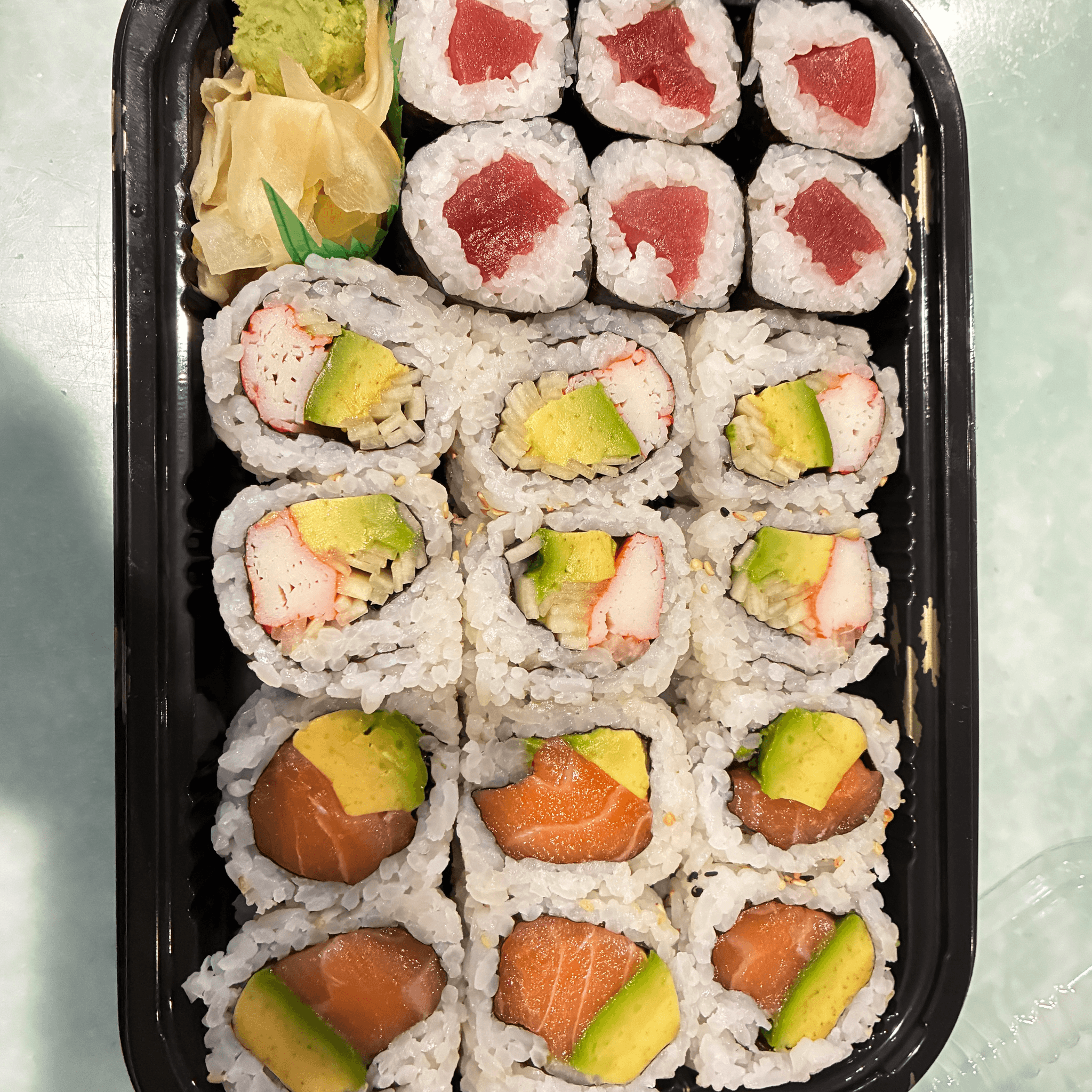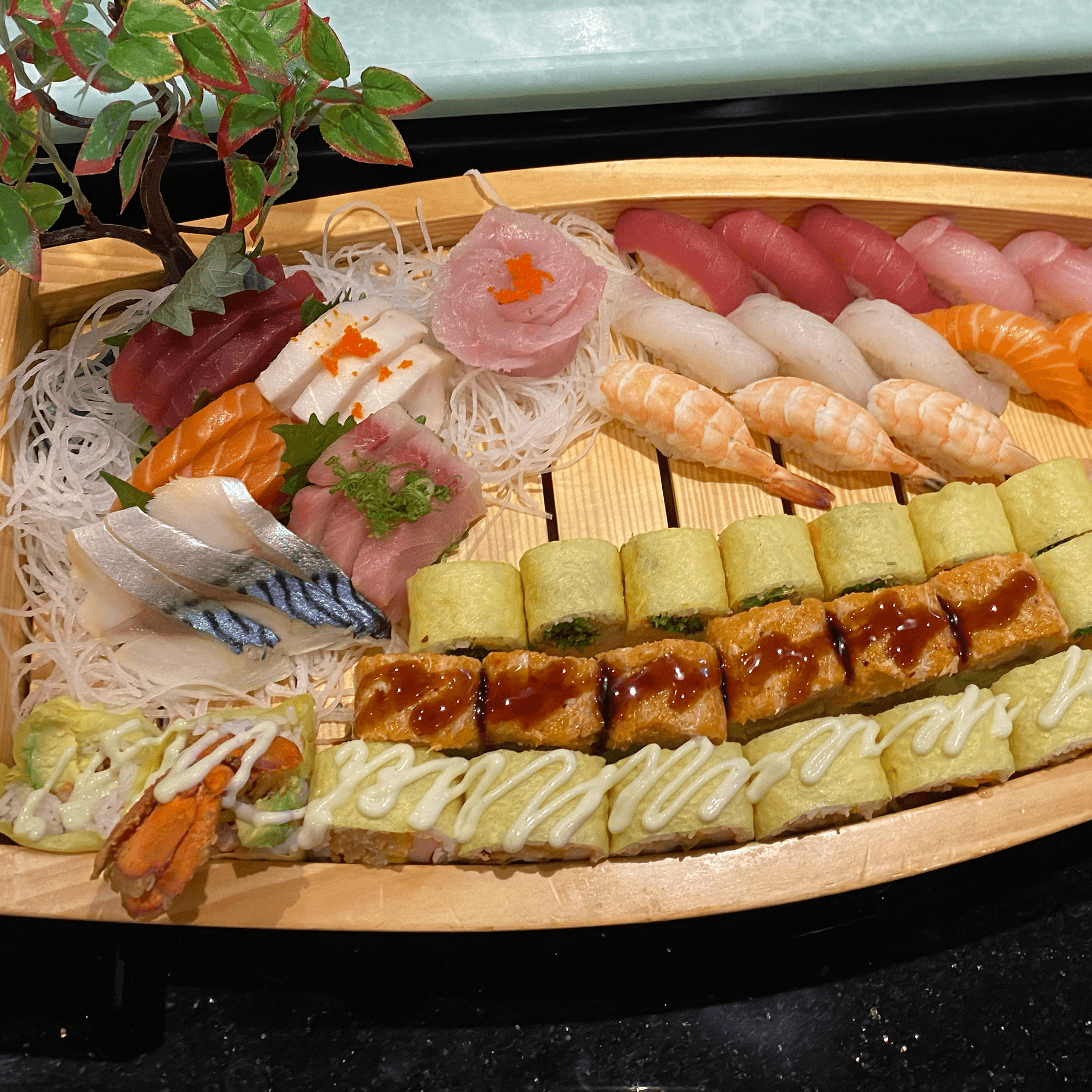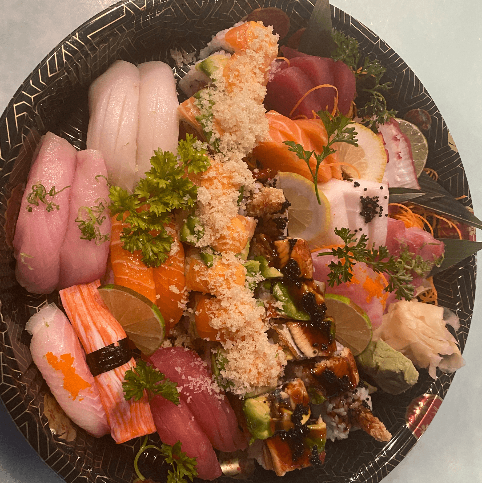 For 3 or 4 people. 15 pieces of sushi, 20 pieces of sashimi sunset roll and an 8 piece North Main St. Roll, pink lady roll. Served with soup