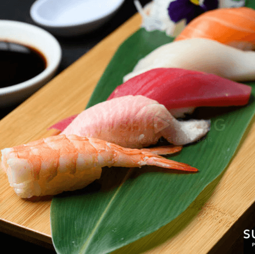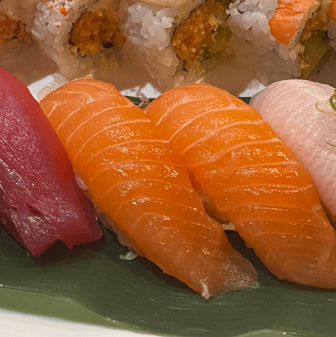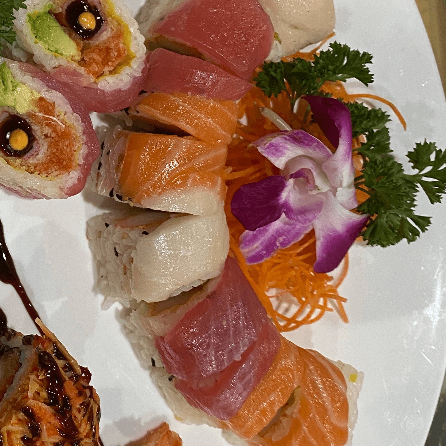 For 3 or 4 people. 15 pieces of sushi, 20 pieces of sashimi sunset roll and an 8 piece North Main St. Roll, pink lady roll. Served with soup