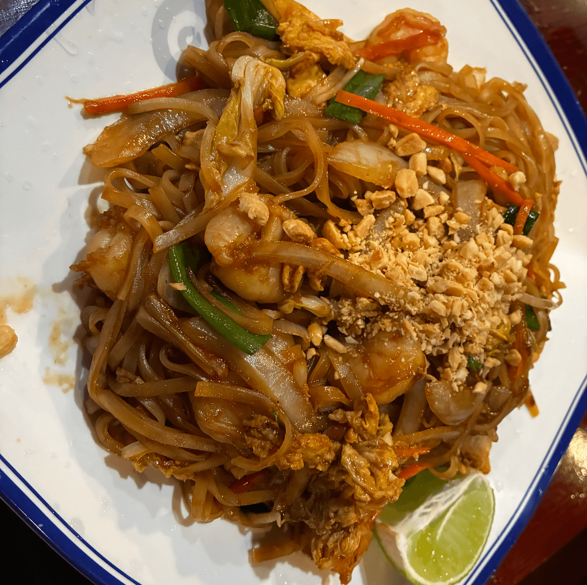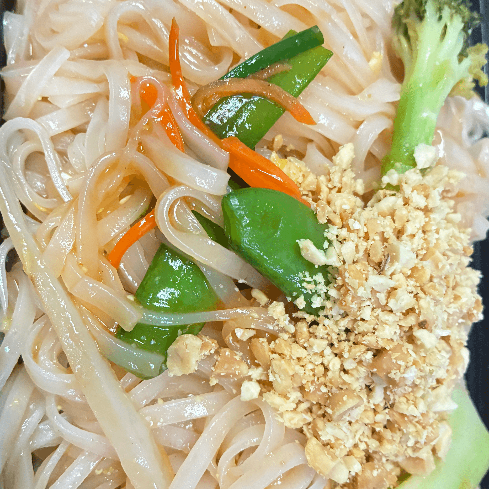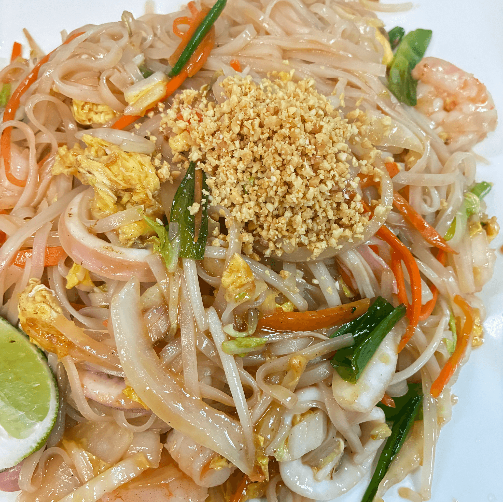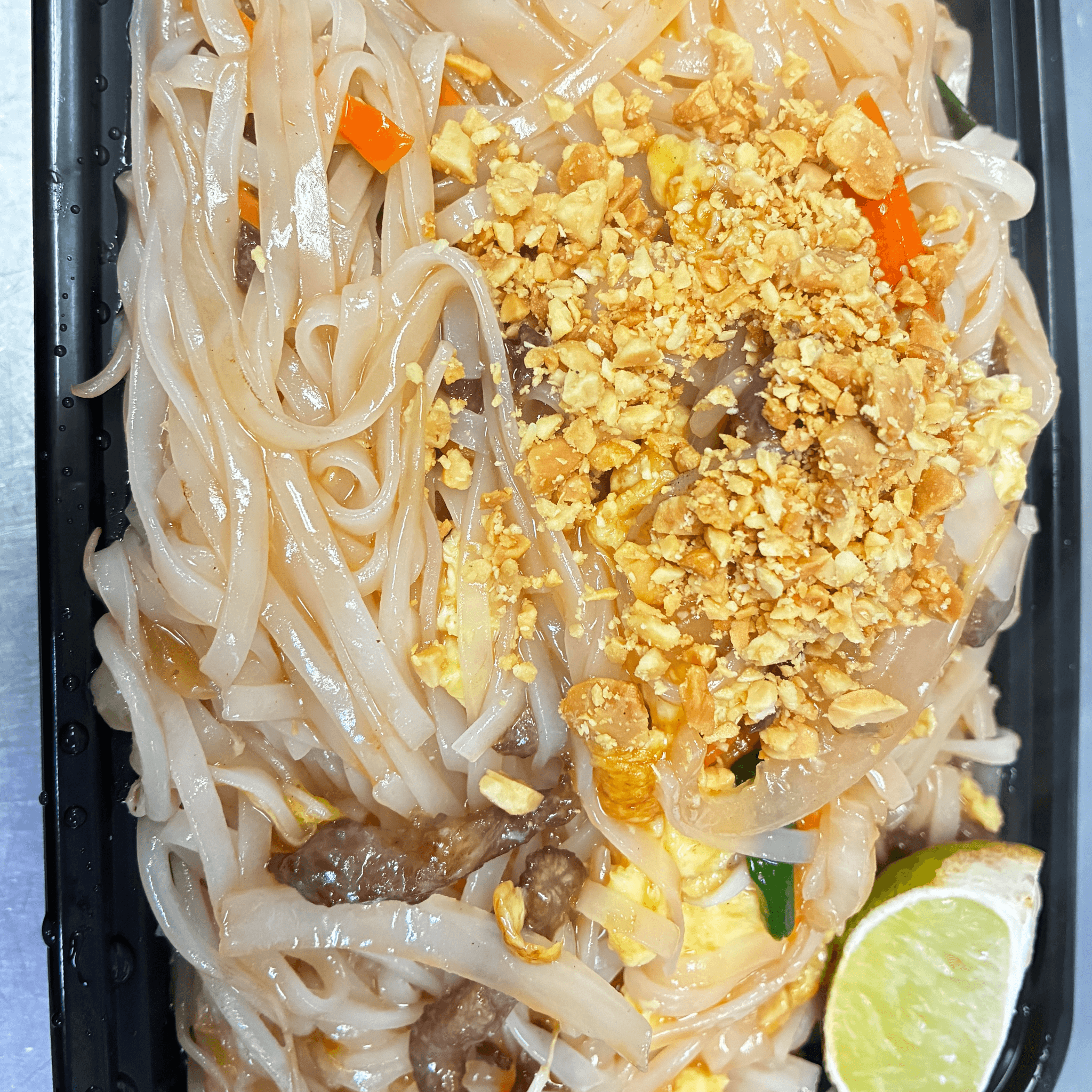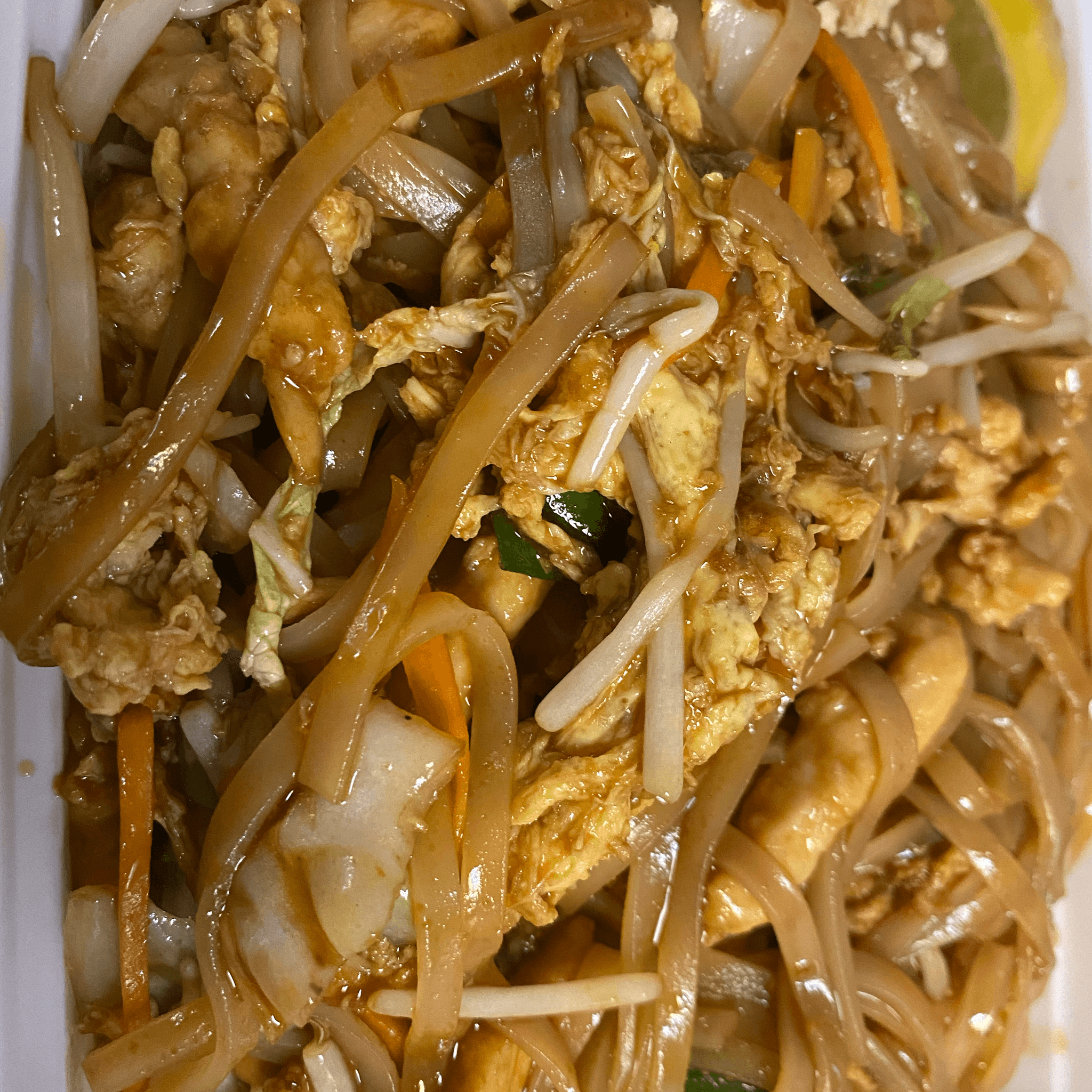 Flat rice noodles with chicken, onions, bean sprouts, and egg topped with peanuts.