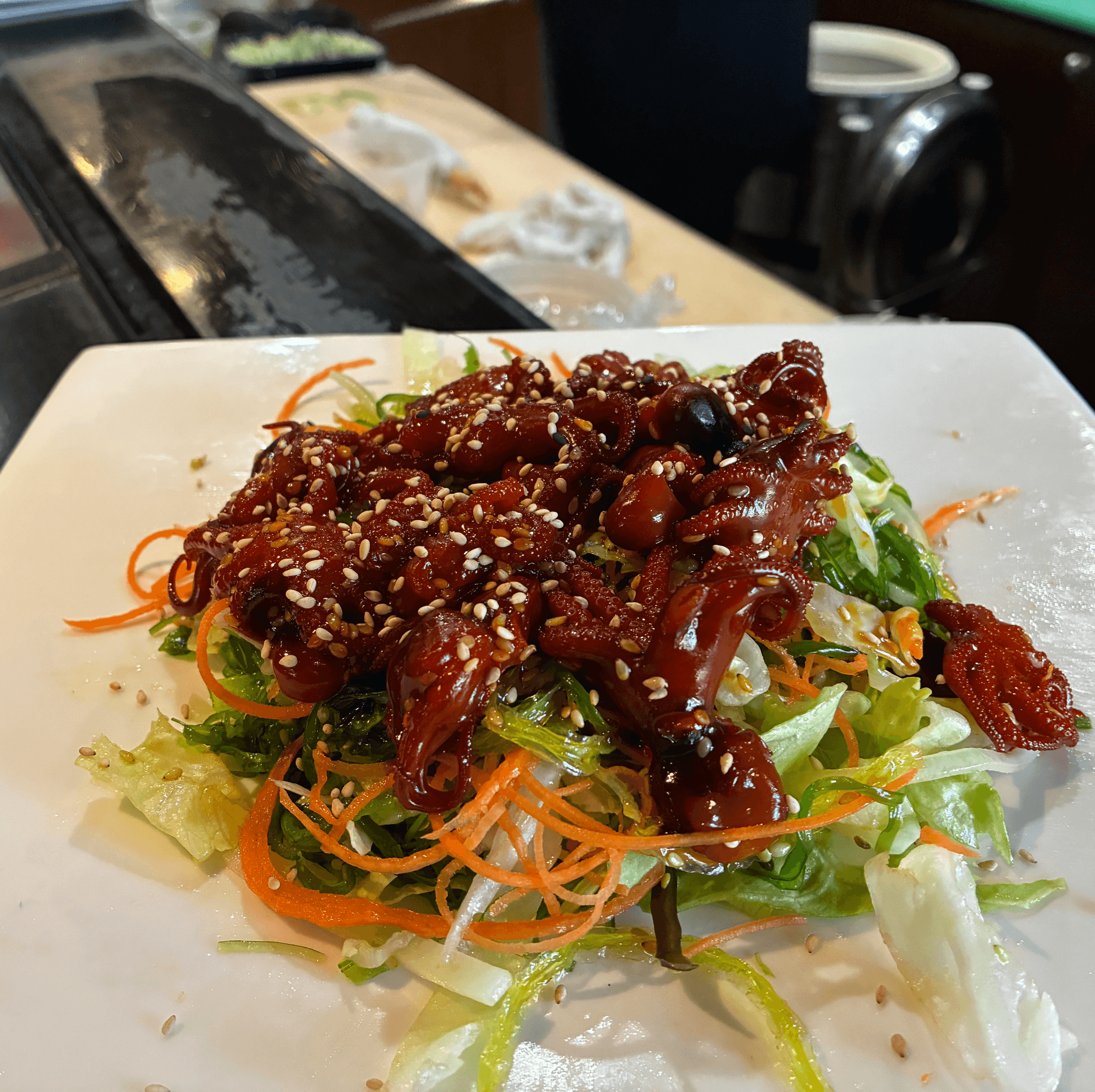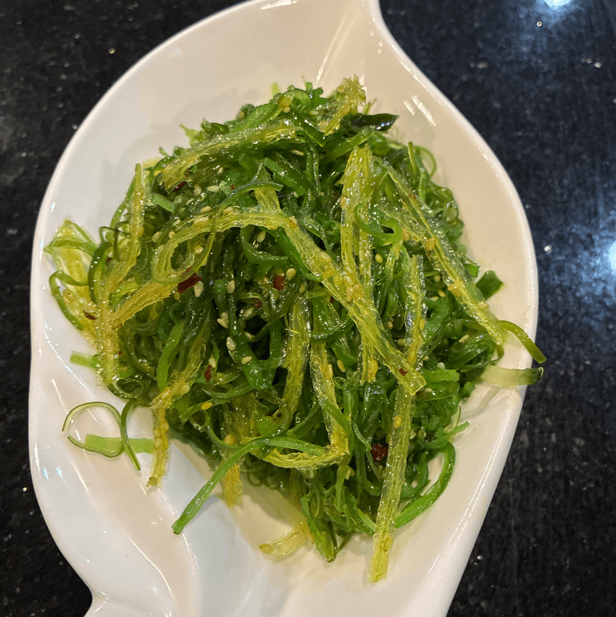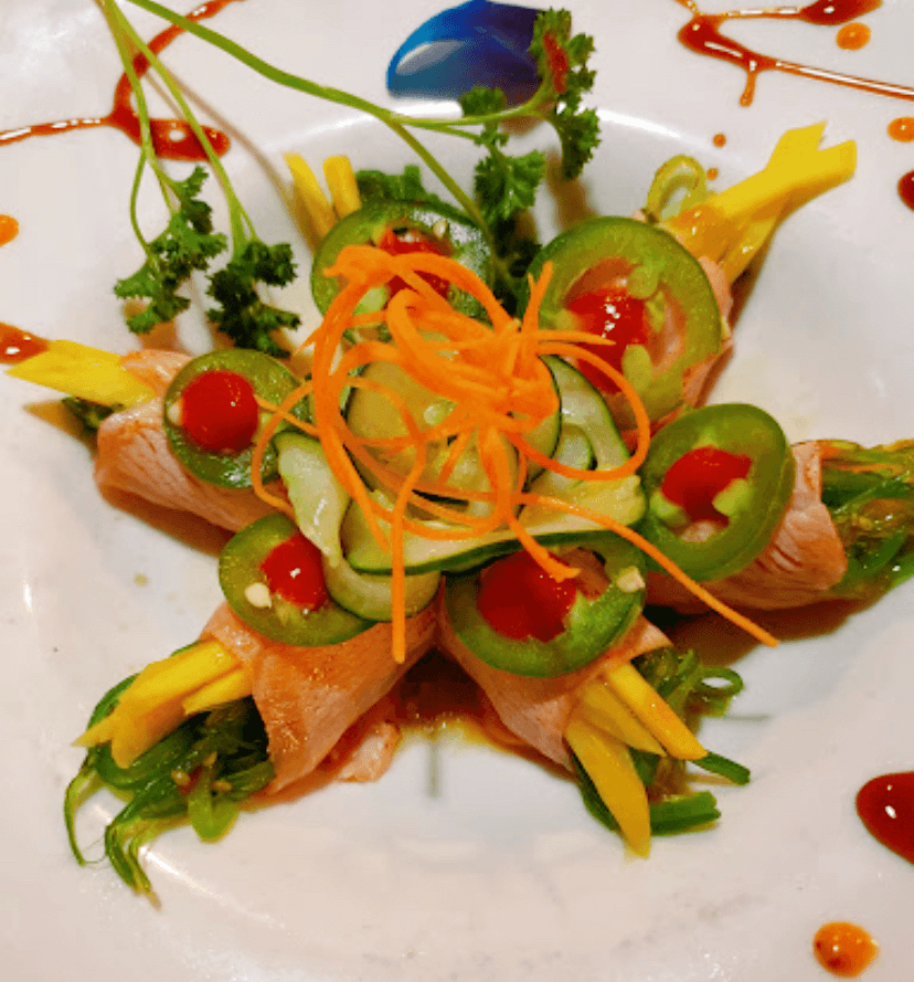 Seared salmon, jalapeno, mango and seaweed salad. Spicy