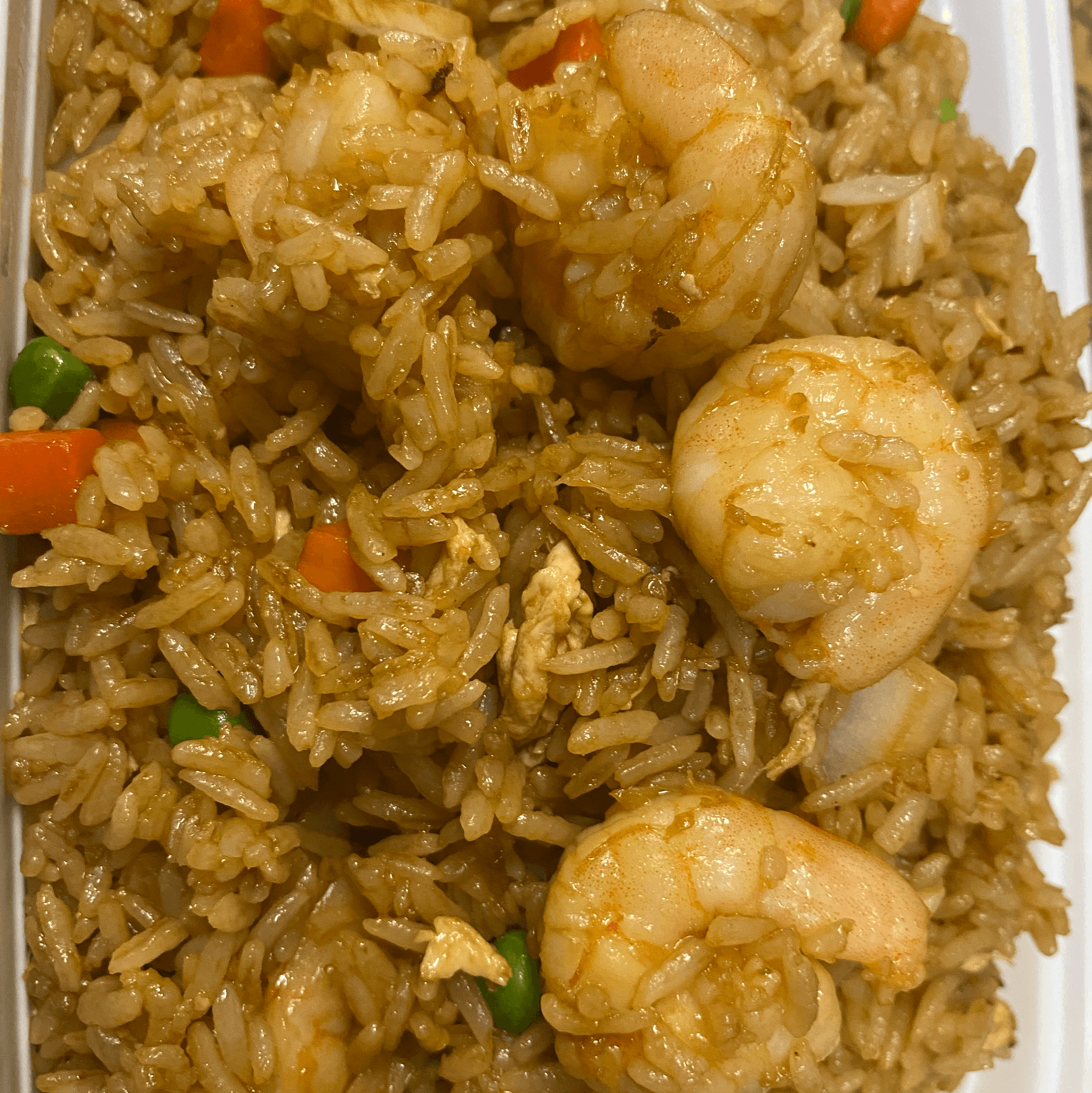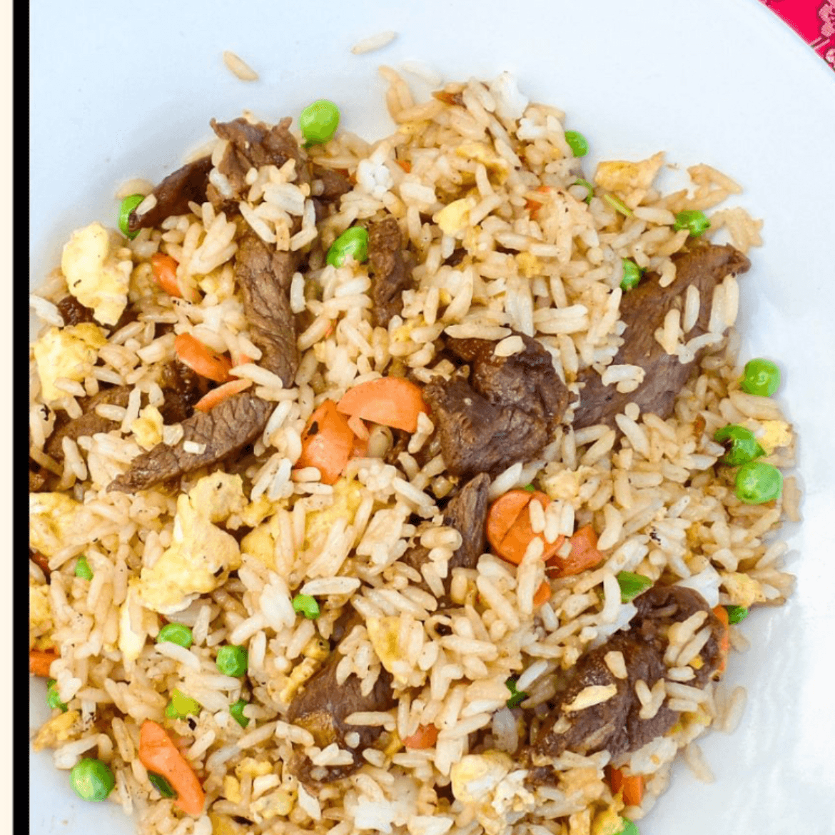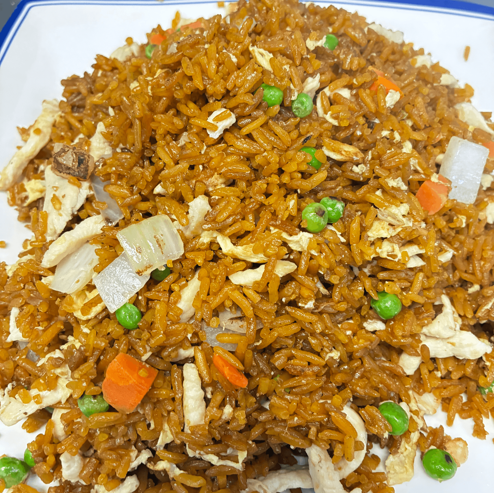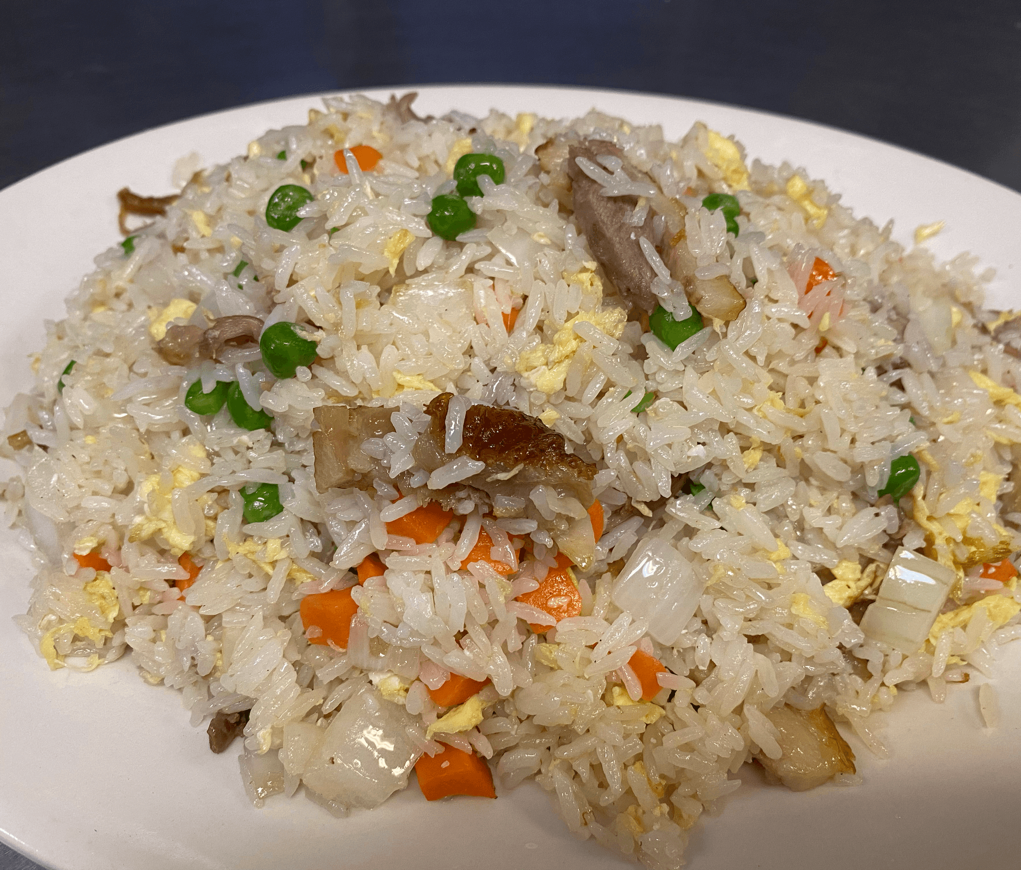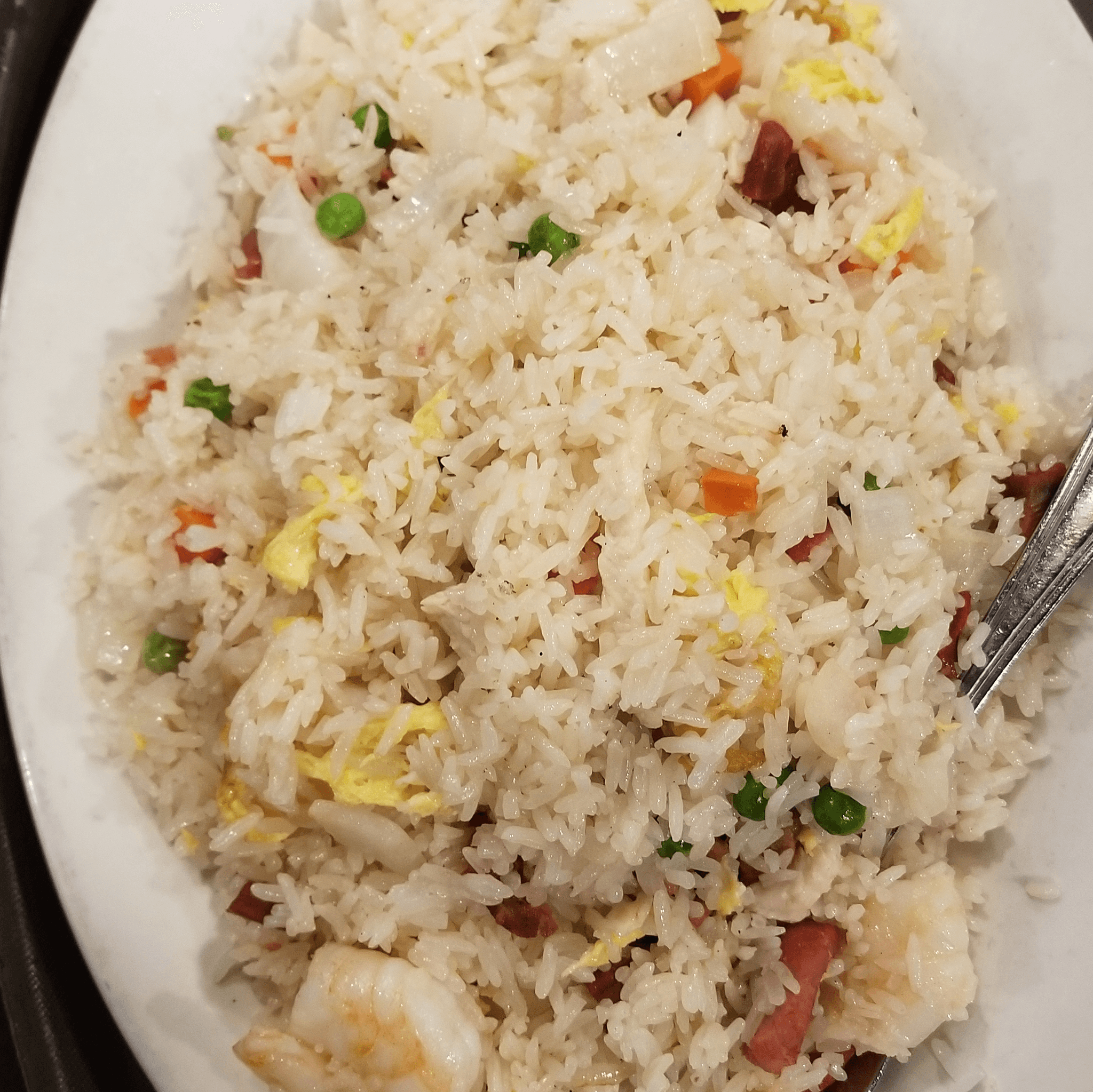 Stir-fried chicken, pork, shrimp, peas, carrots, and onions with white rice