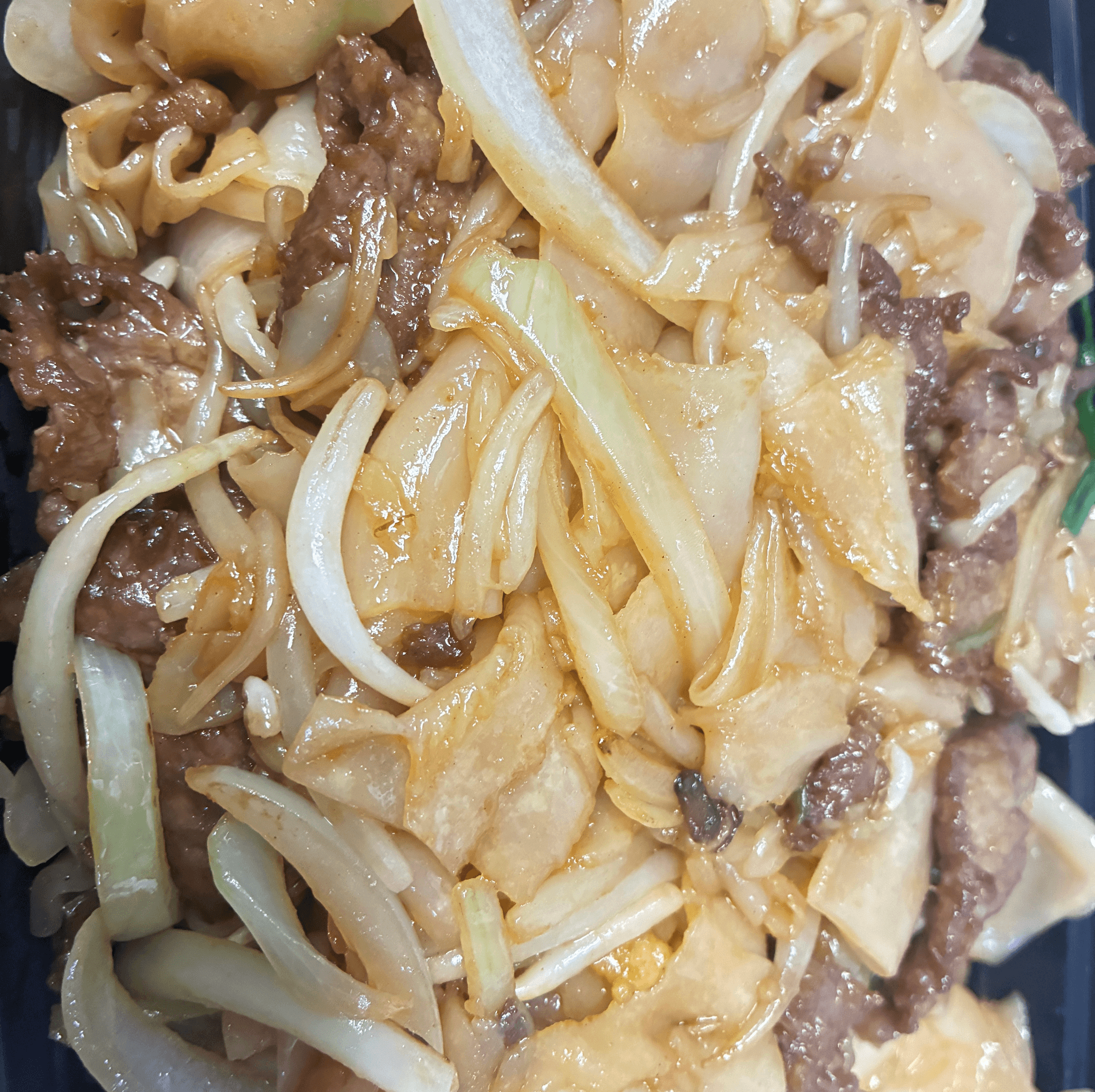 Stir fried beef with flat rice noodles , bean sprouts, onion in brown sauce