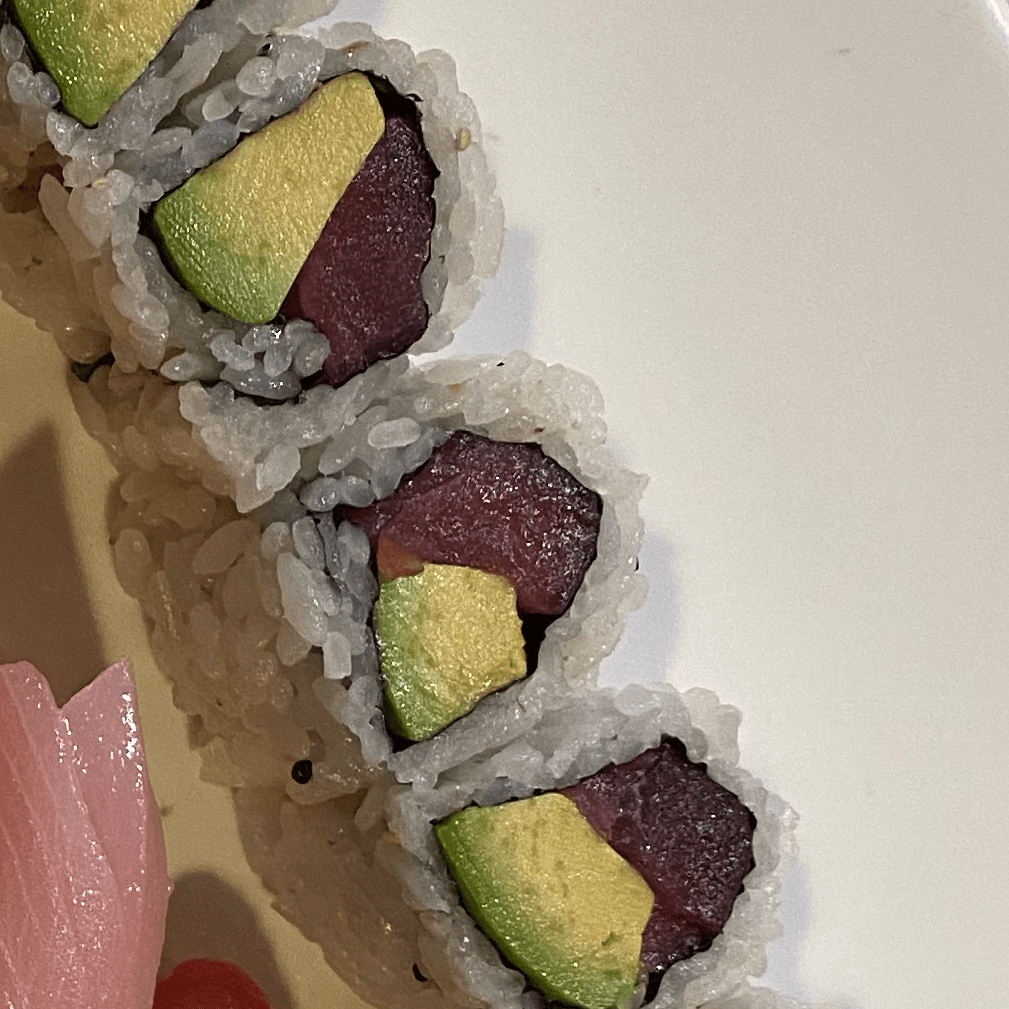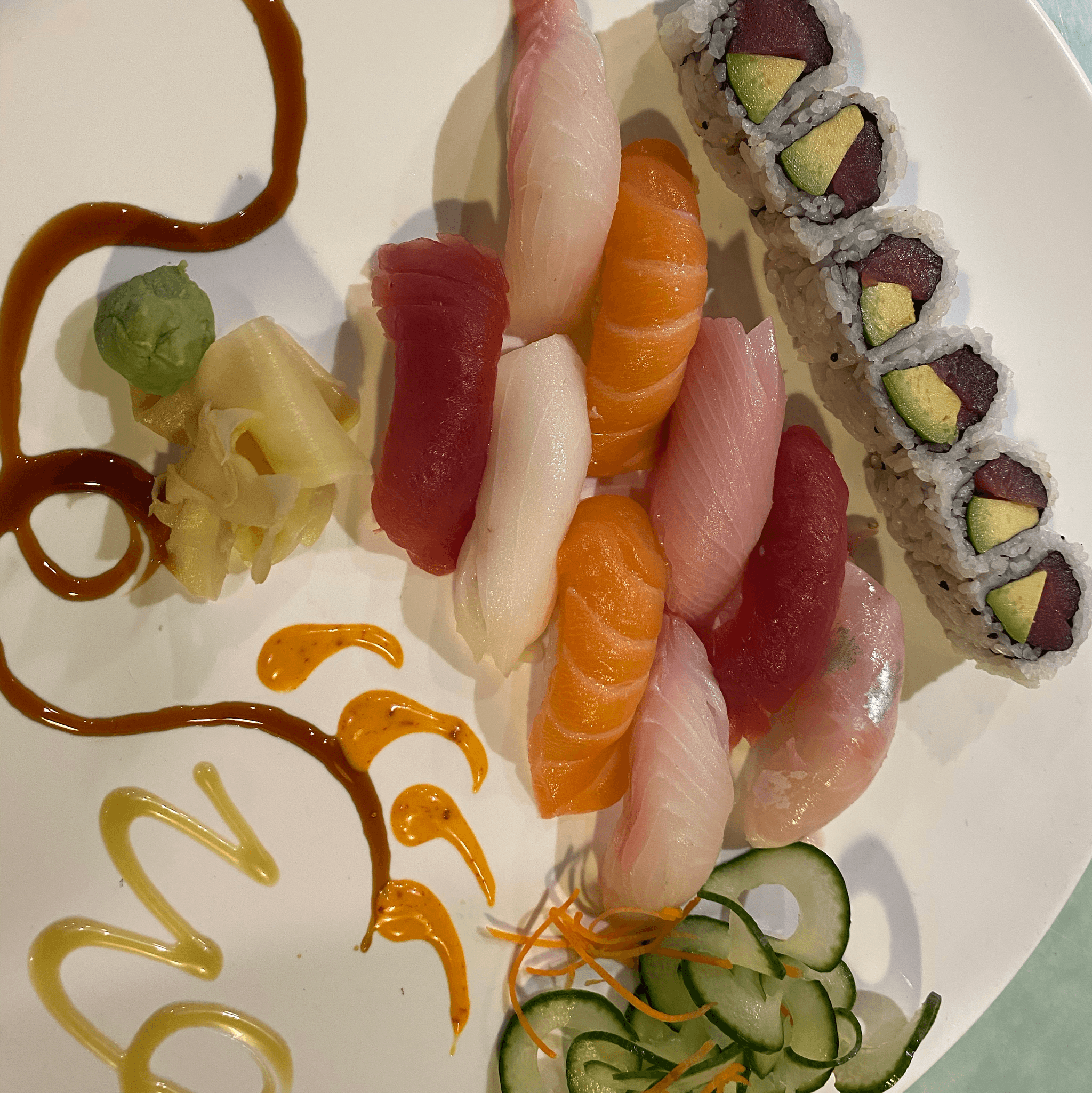 9 pieces of sushi with a tuna avocado roll. Served with soup