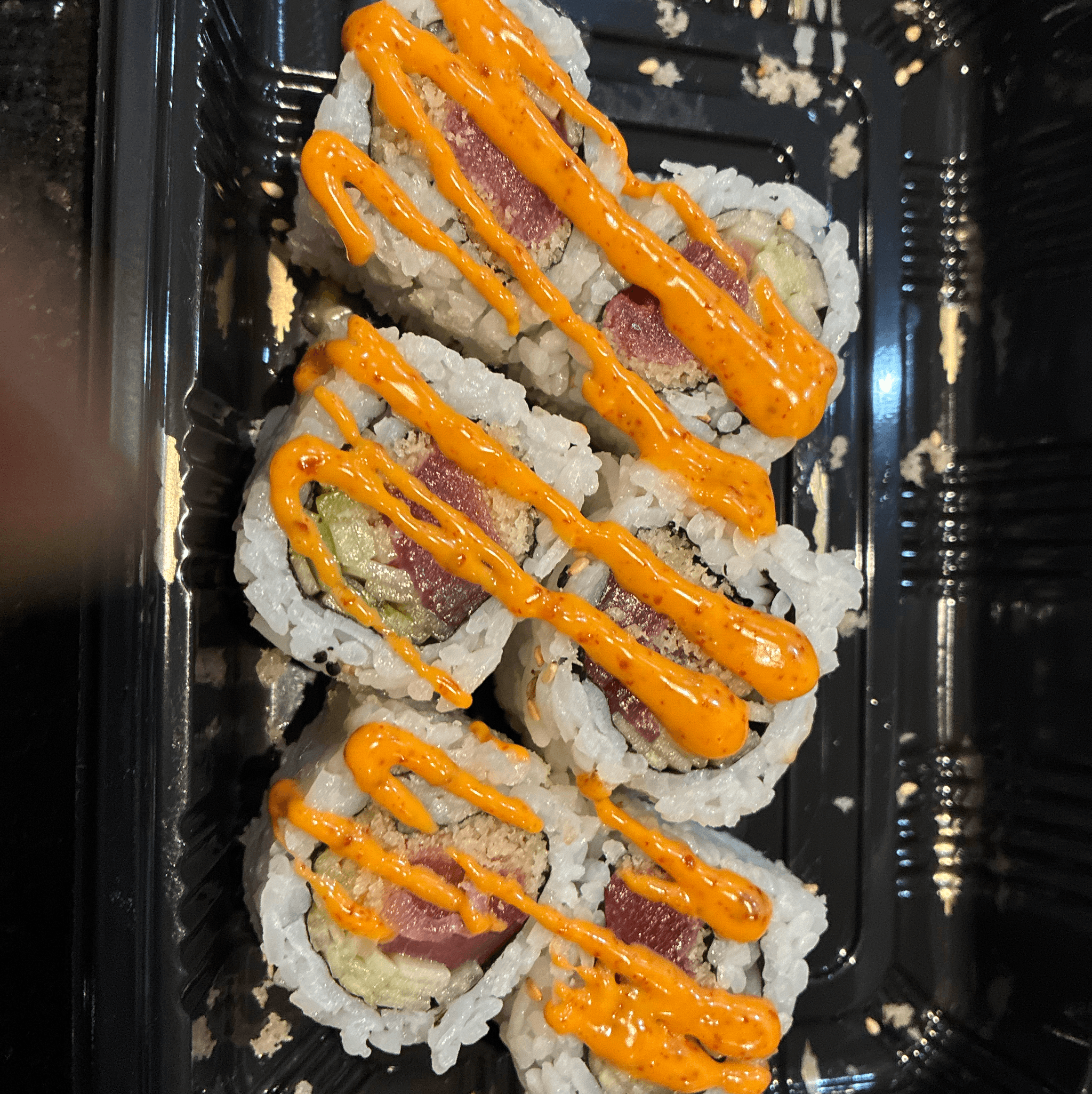 Tuna, cucumber, spicy sauce and crunch. Spicy