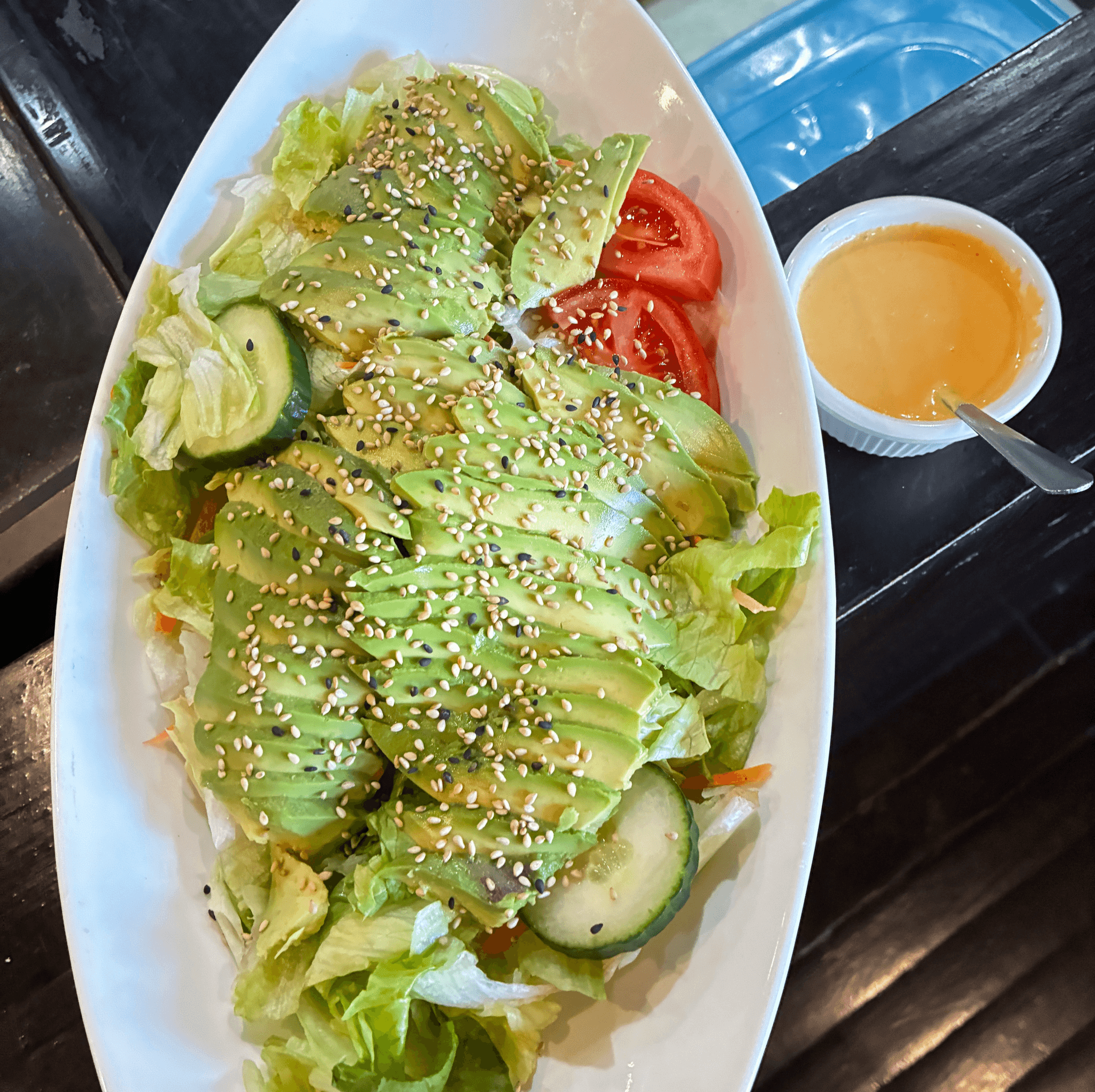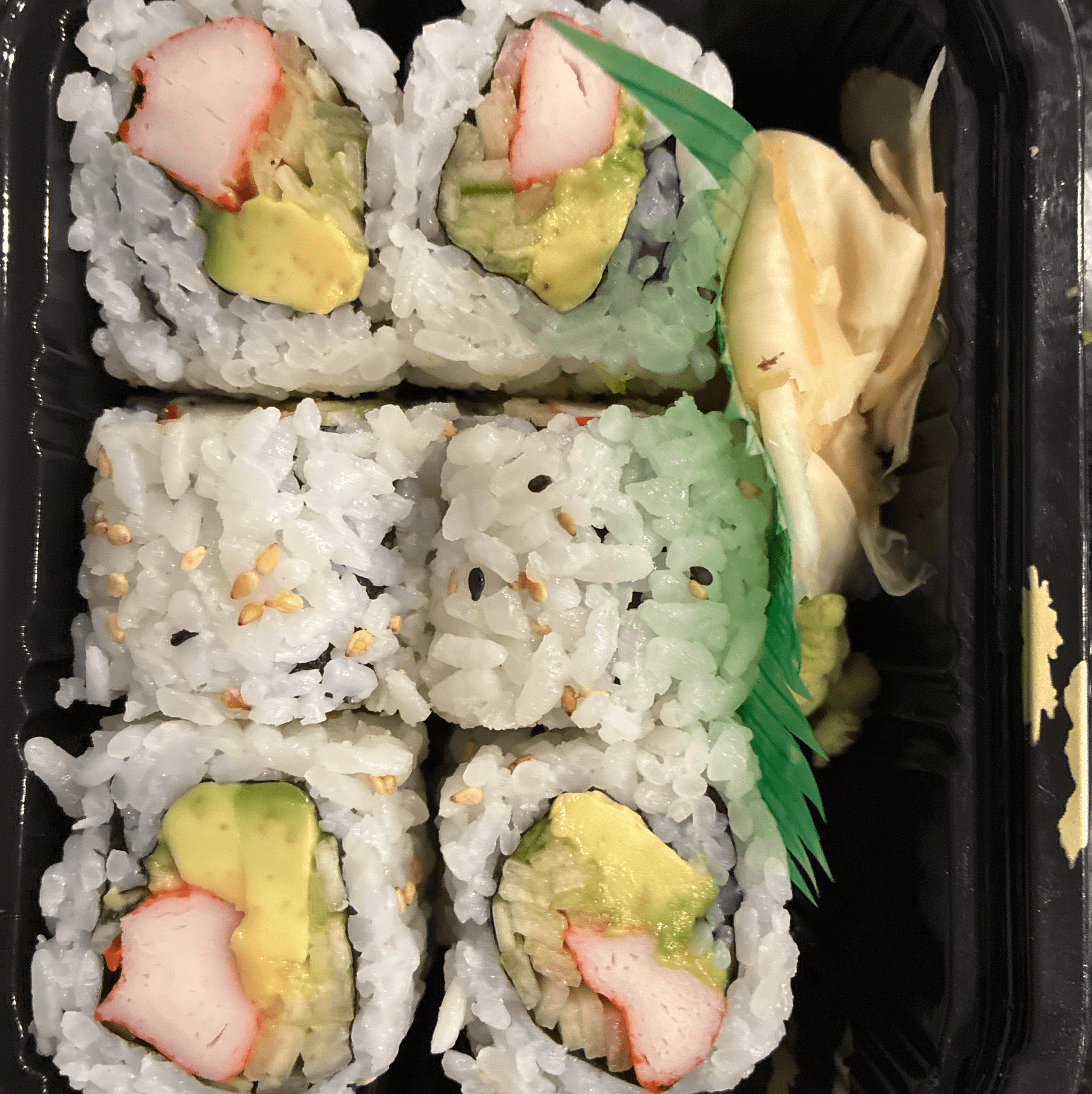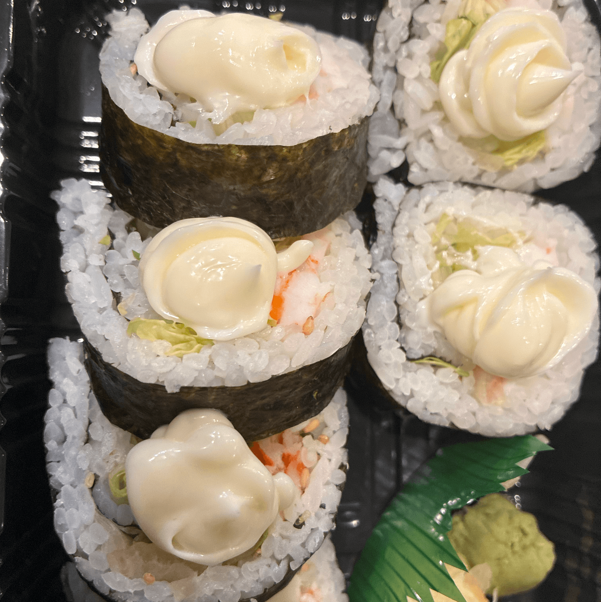 Shrimp tempura, avocado and cucumber inside topped with homemade lobster salad. Organic sushi rice