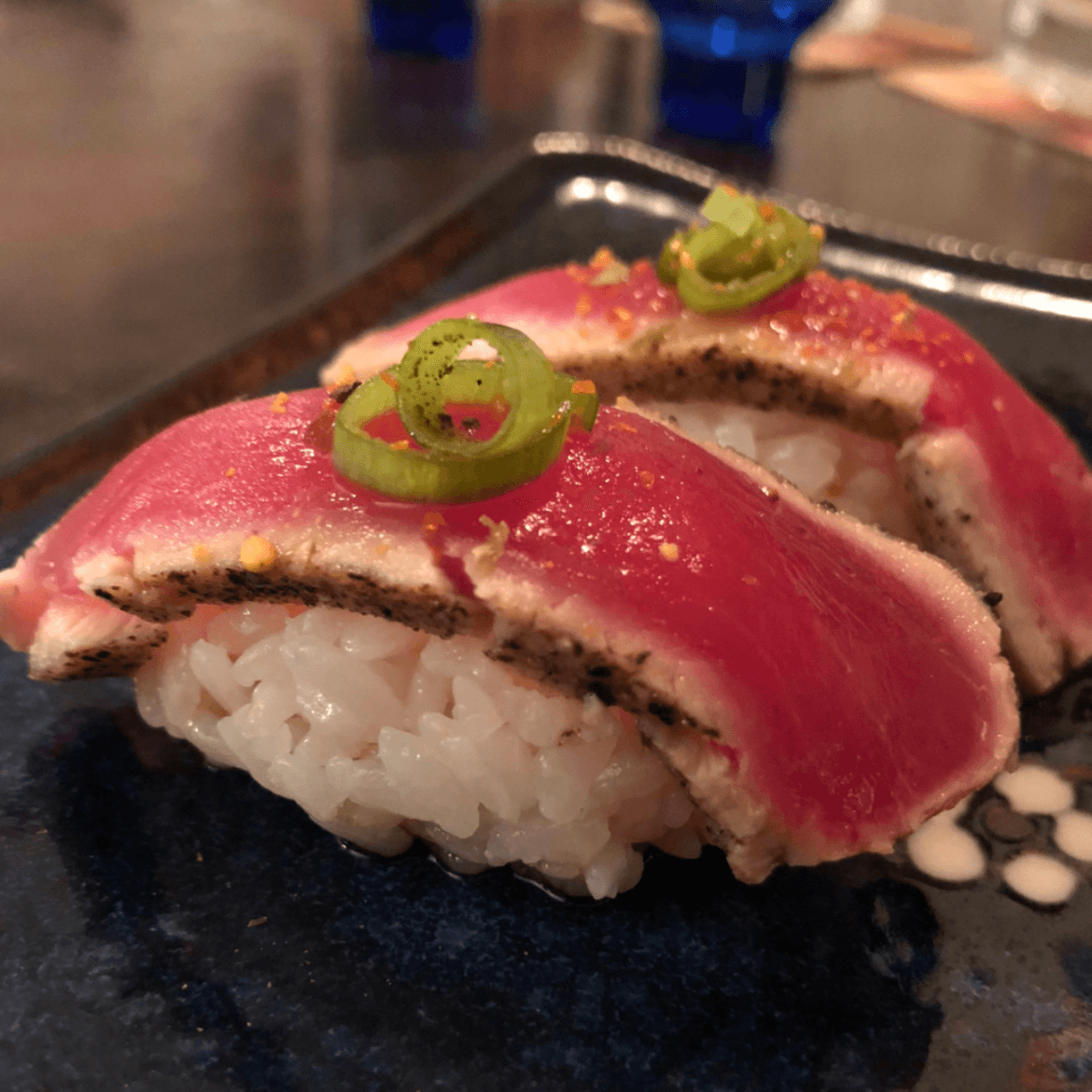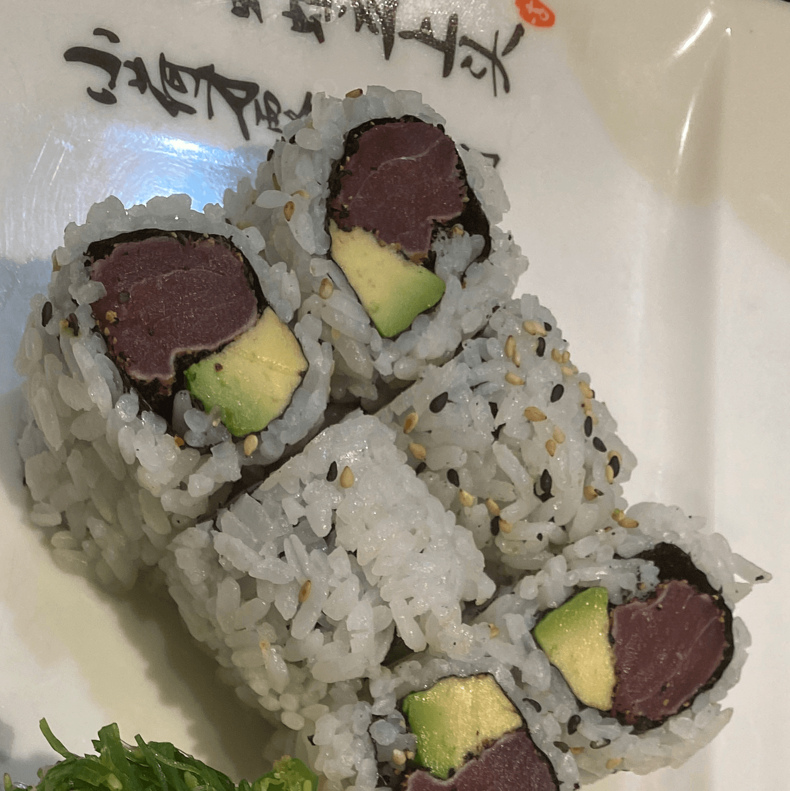 Spicy tuna and crunch topped with black pepper tuna and avocado. Organic sushi rice