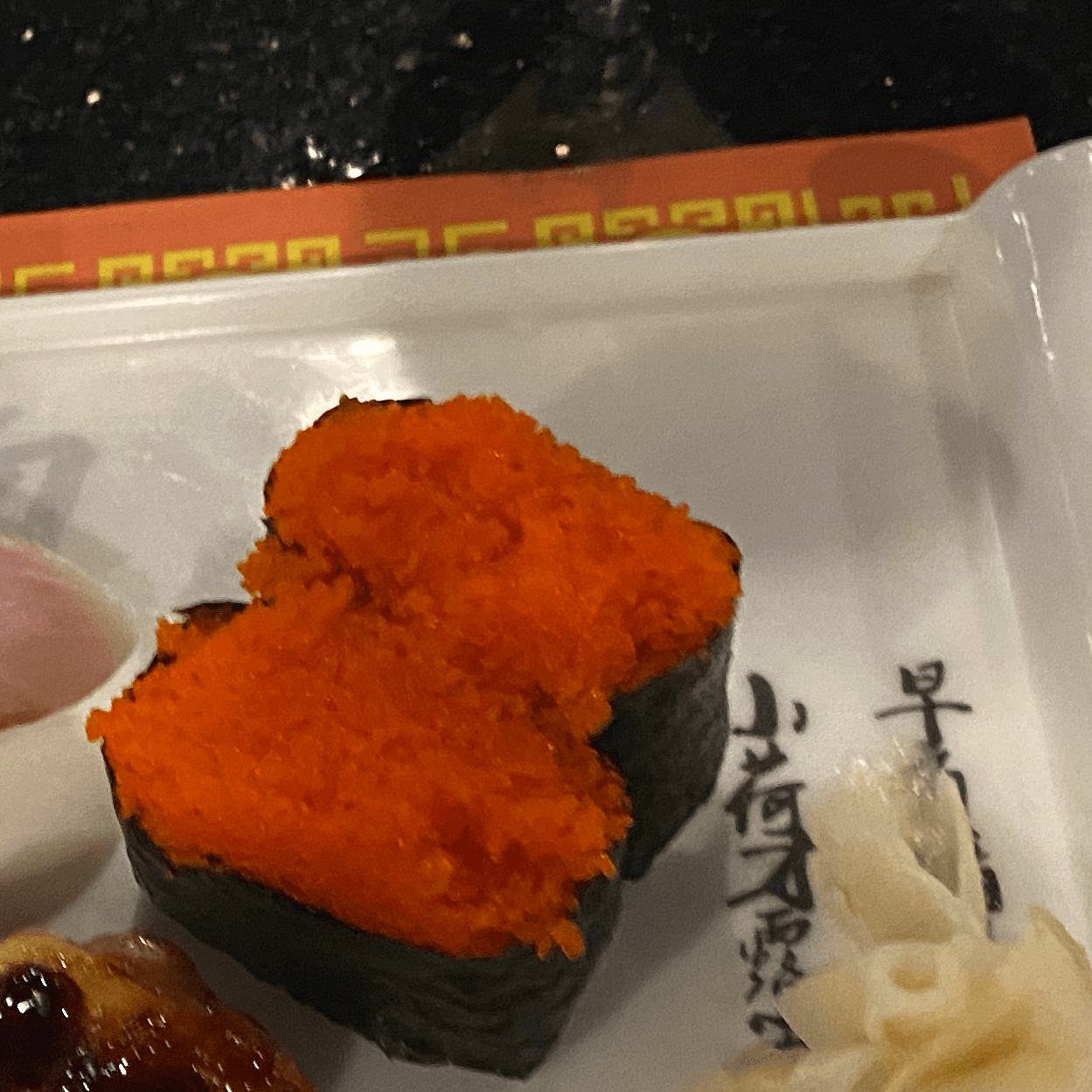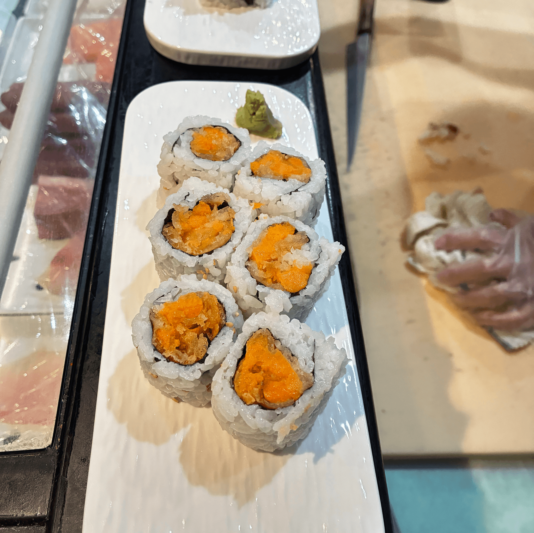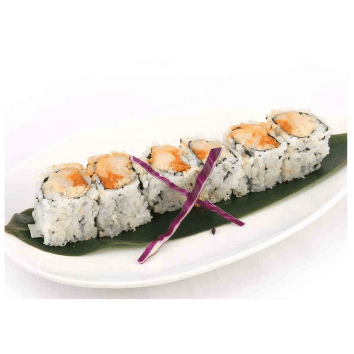Spicy crunch, crab and shrimp with caviar outside. Organic sushi rice. Hot and spicy