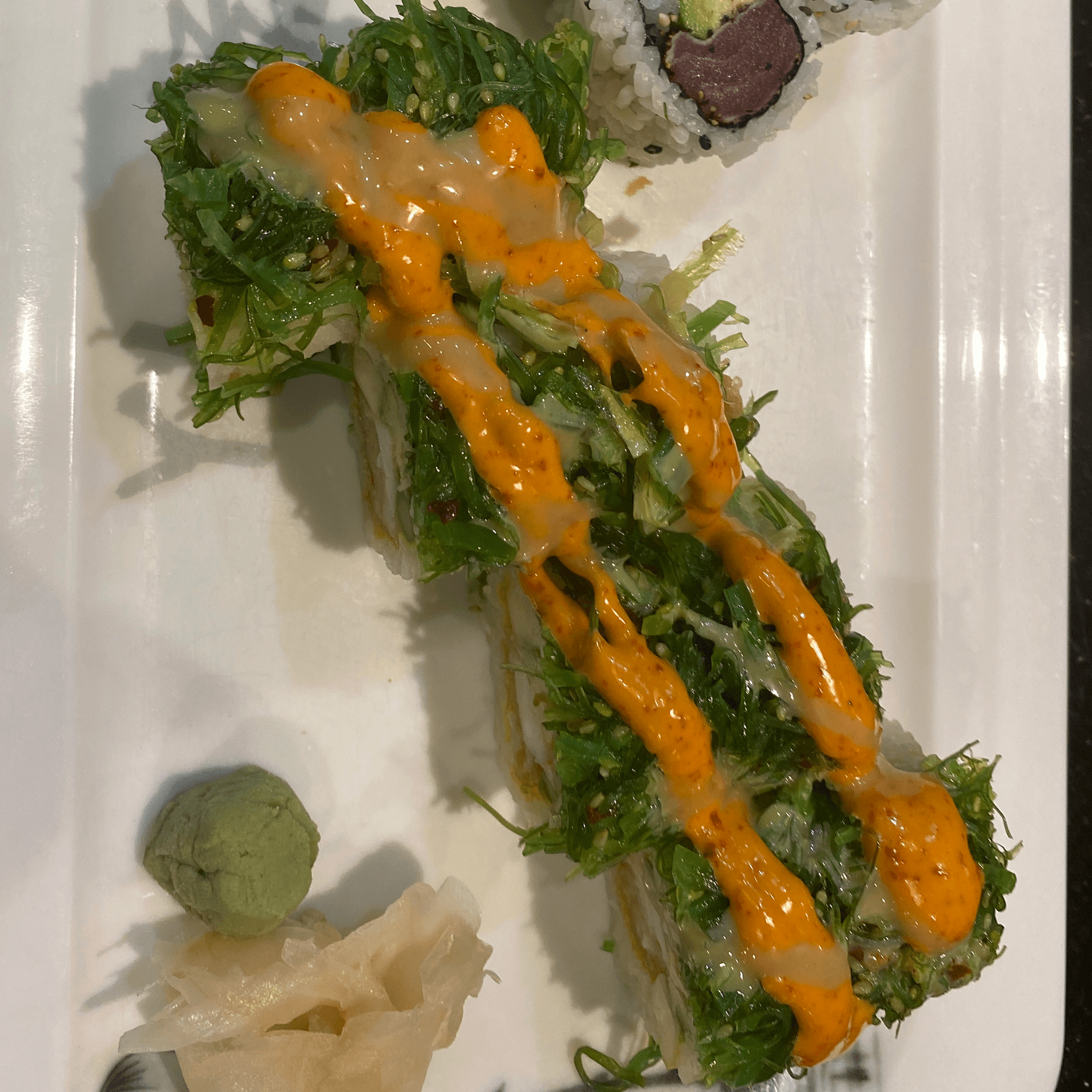 Lobster tempura, asparagus, avocado and mango topped with seaweed salad, spicy wasabi sauce and spicy mayo sauce. Organic sushi rice. Hot and spicy
