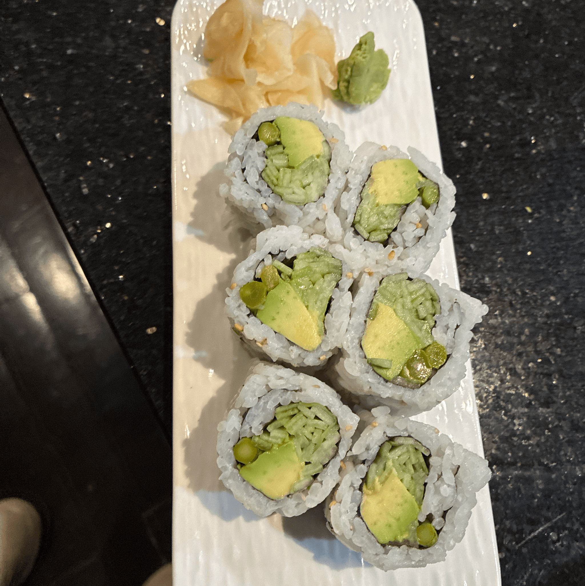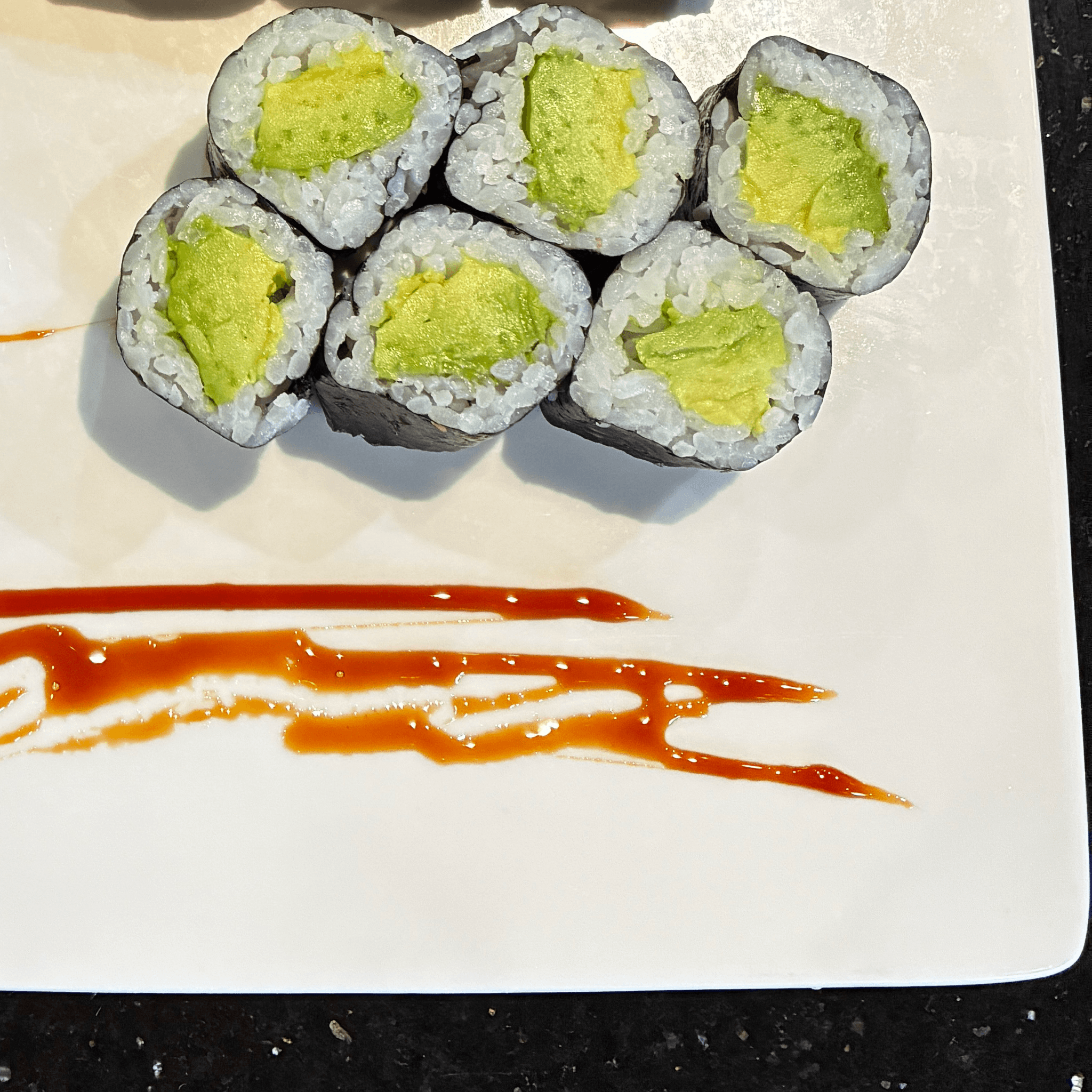 Eel cucumber topped with avocado and eel sauce. Organic sushi rice