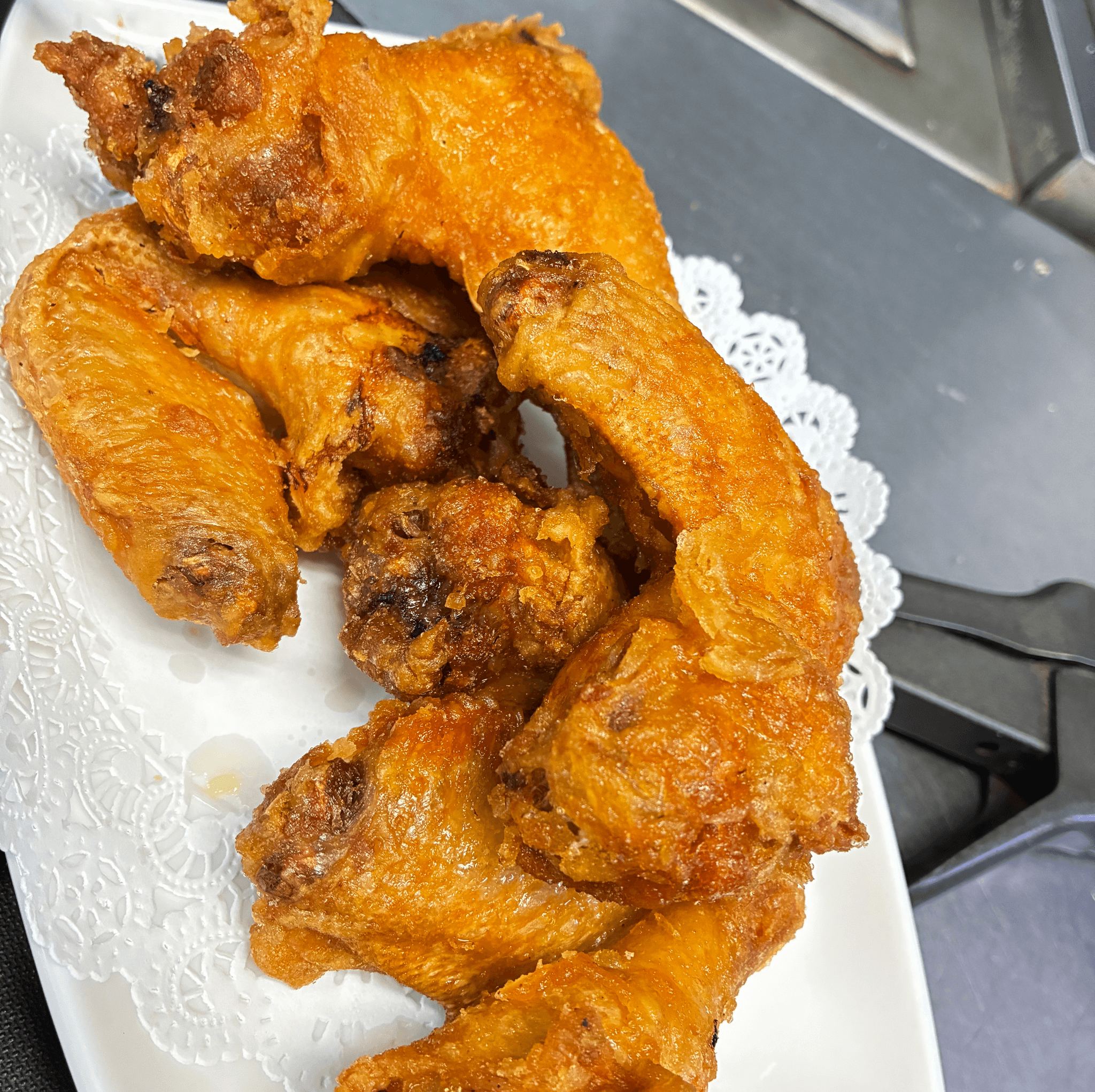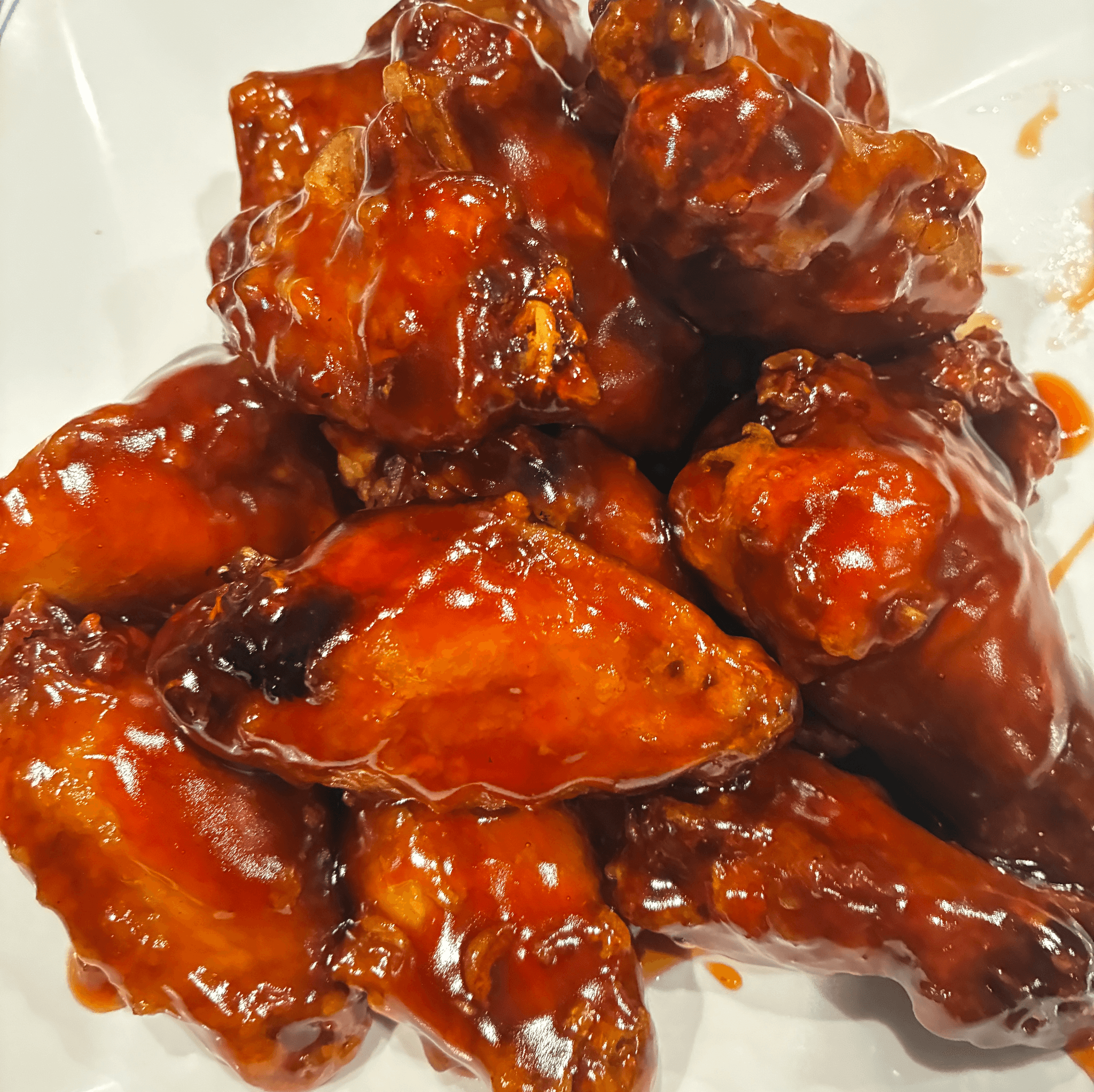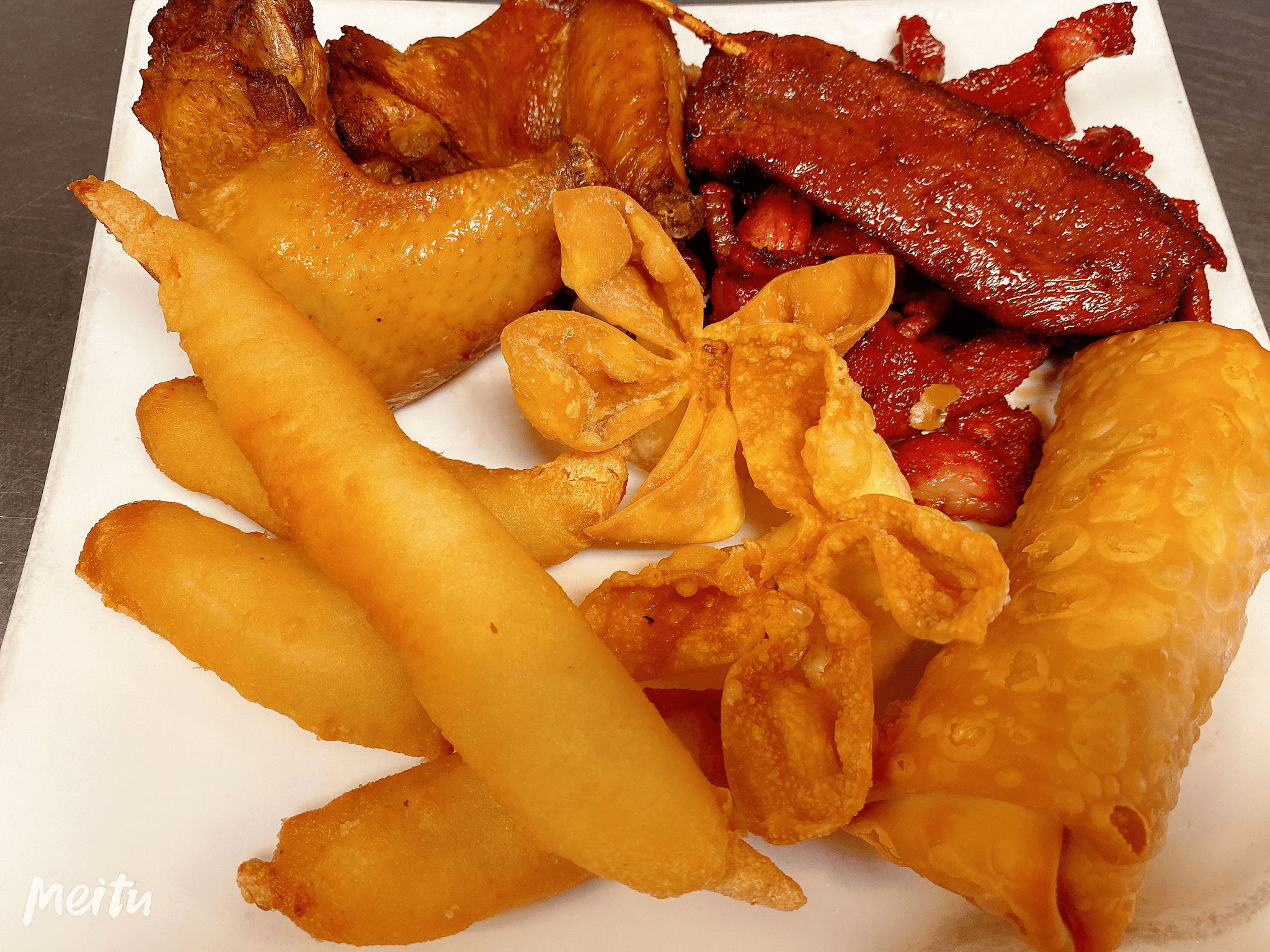 Egg roll, chicken wing , boneless rib, chicken finger, frie shrimp , beef stick , crab Rangoon
