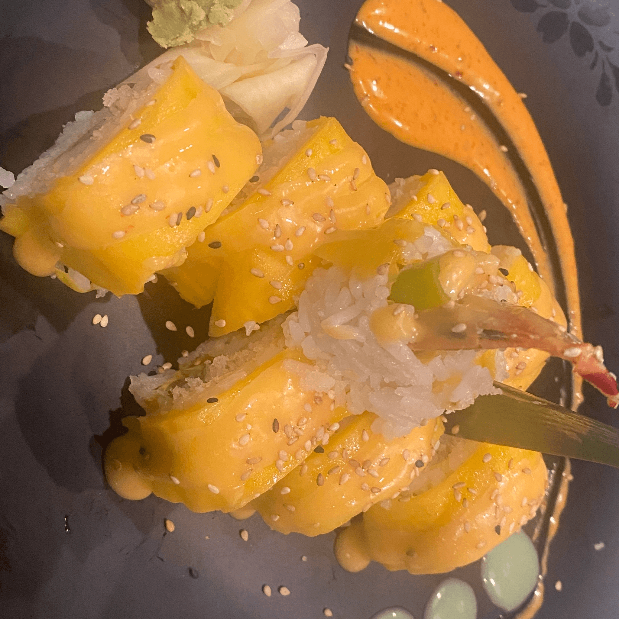 Steamed lobster, asparagus and crunch inside topped with mango and mango sauce. Organic sushi rice