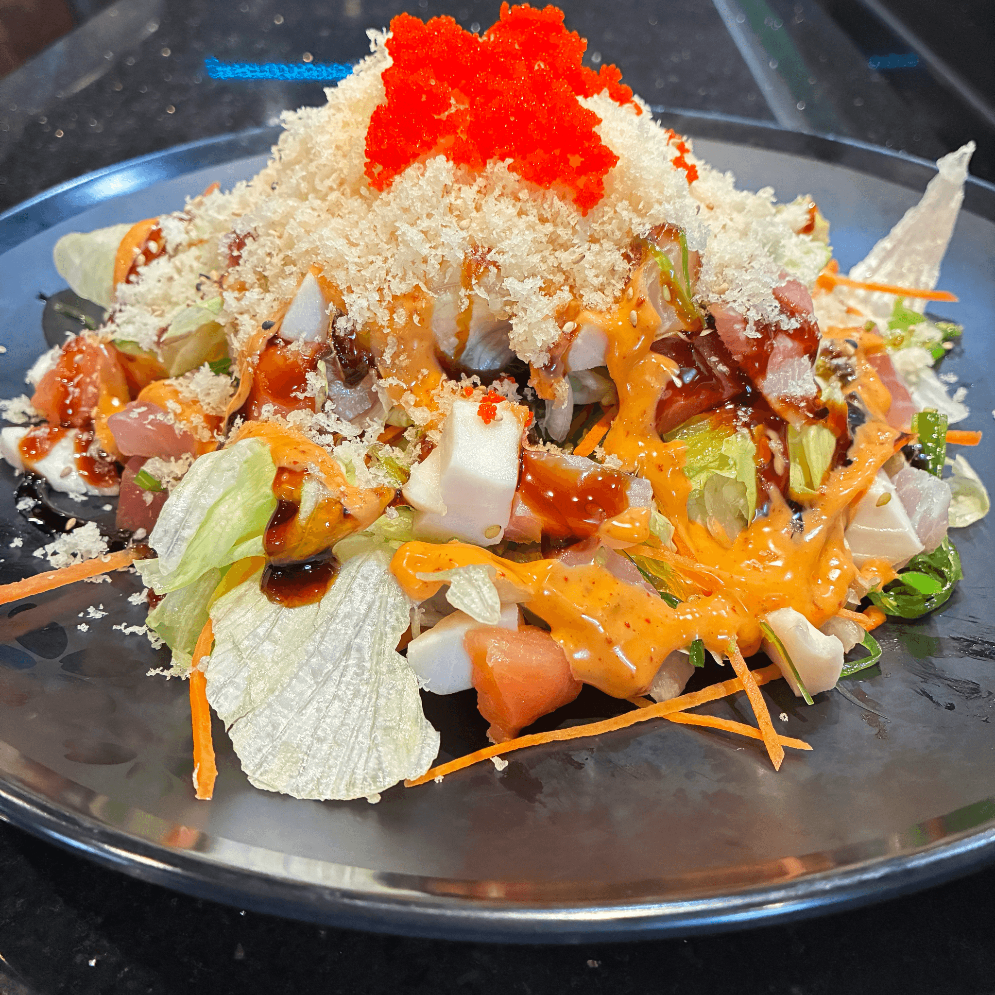 Tuna, salmon, white tuna, mayo, tobiko, seaweed salad and crunch with spicy mango and eel sauce