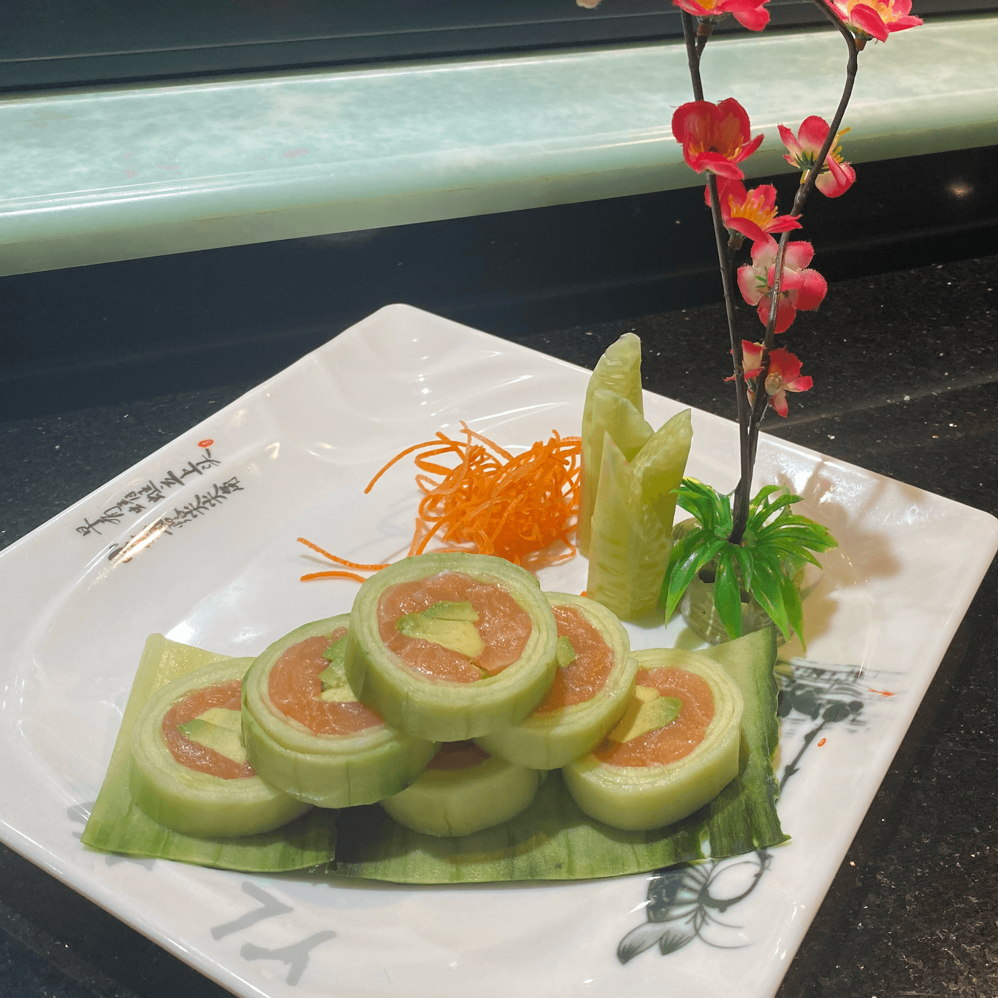 Tuna, salmon, cucumber, avocado and lettuce wrapped in rice paper