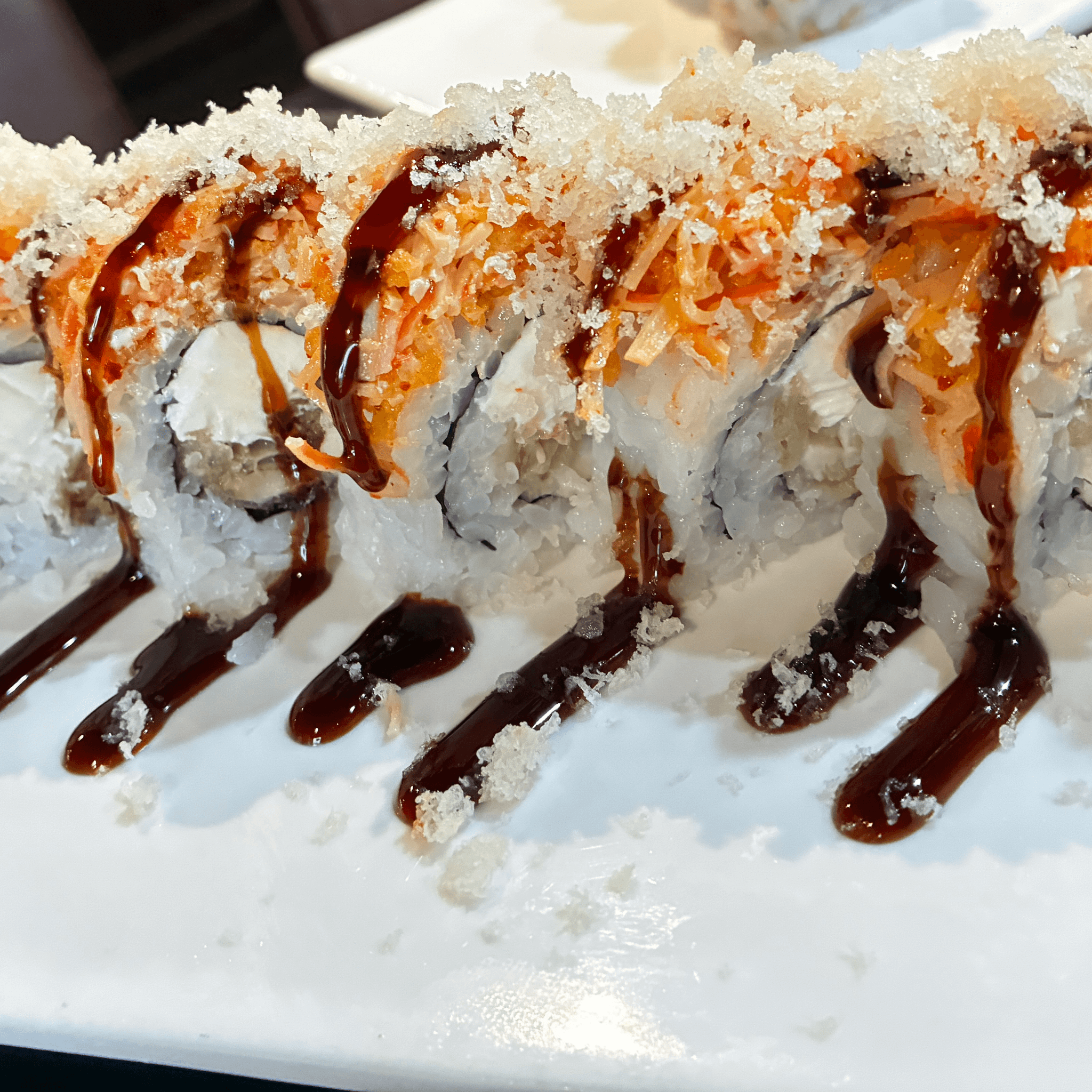 Spicy crabmeat cream cheese, and avocado roll topped with steamed shrimp, tempura flakes, and eel sauce