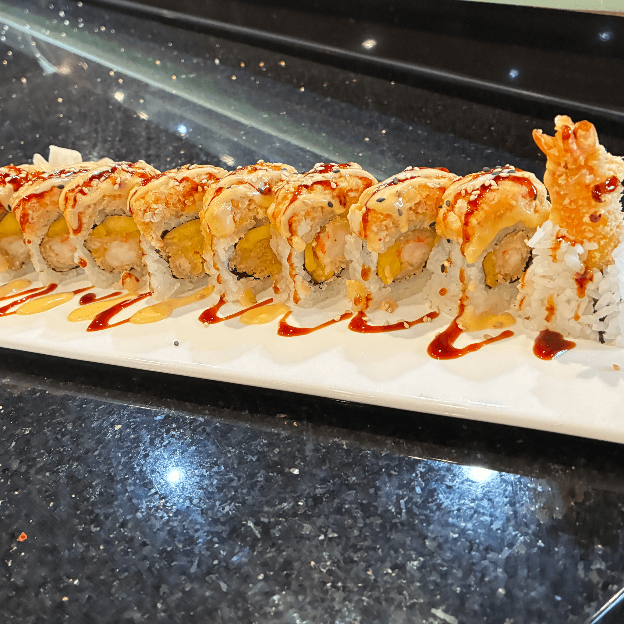Shrimp tempura and mango inside topped with spicy cooked fish mango sauce, and eel sauce
